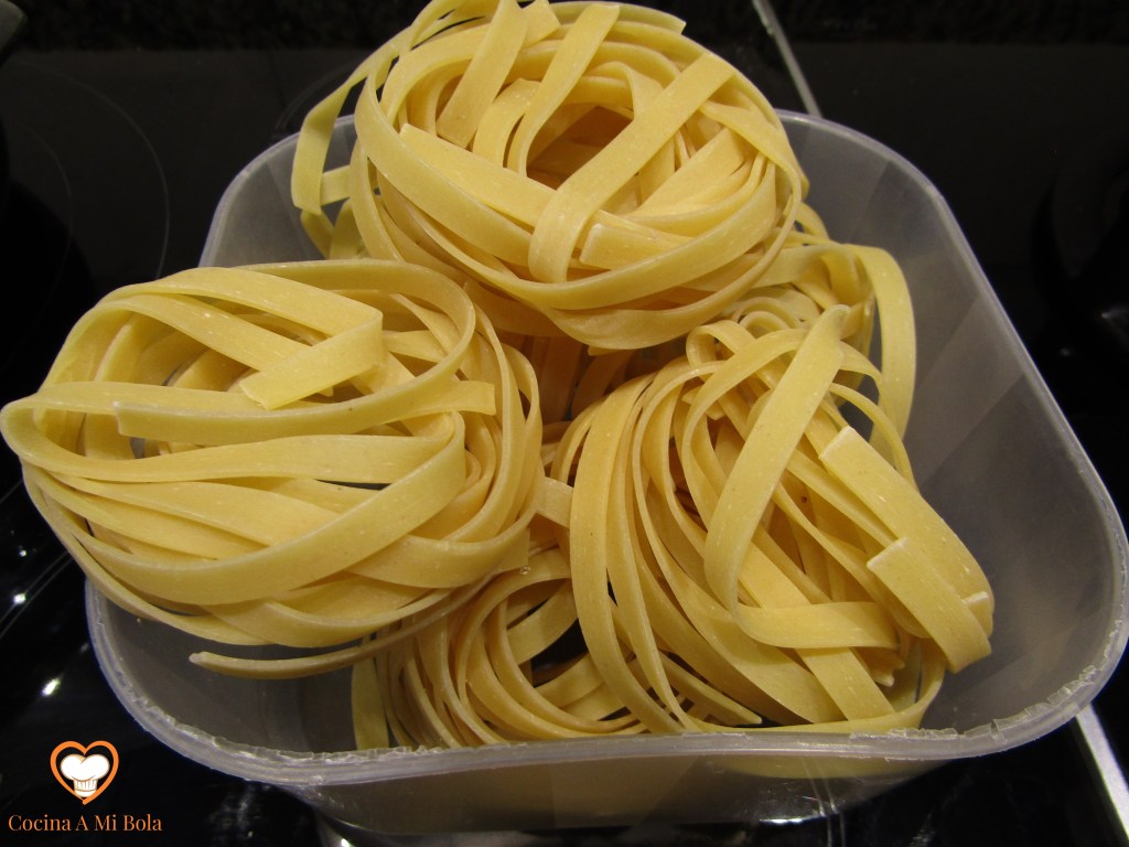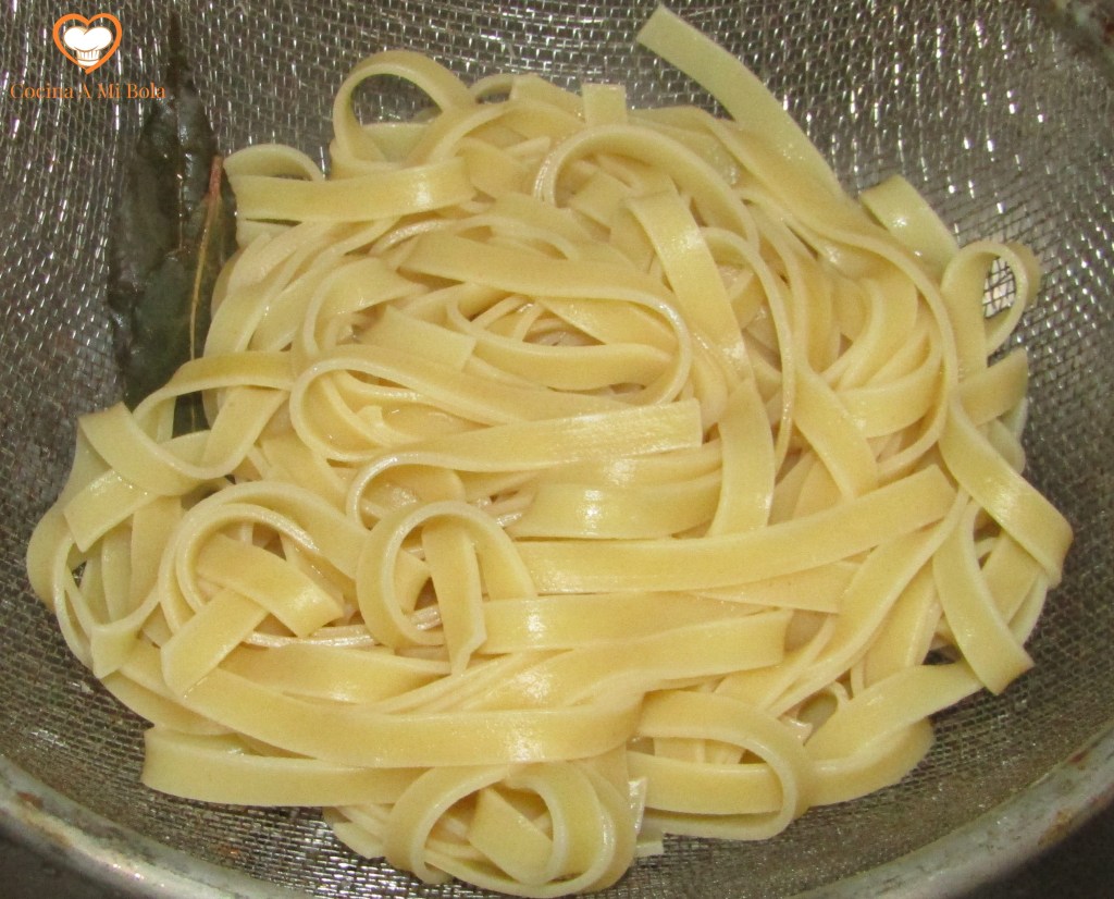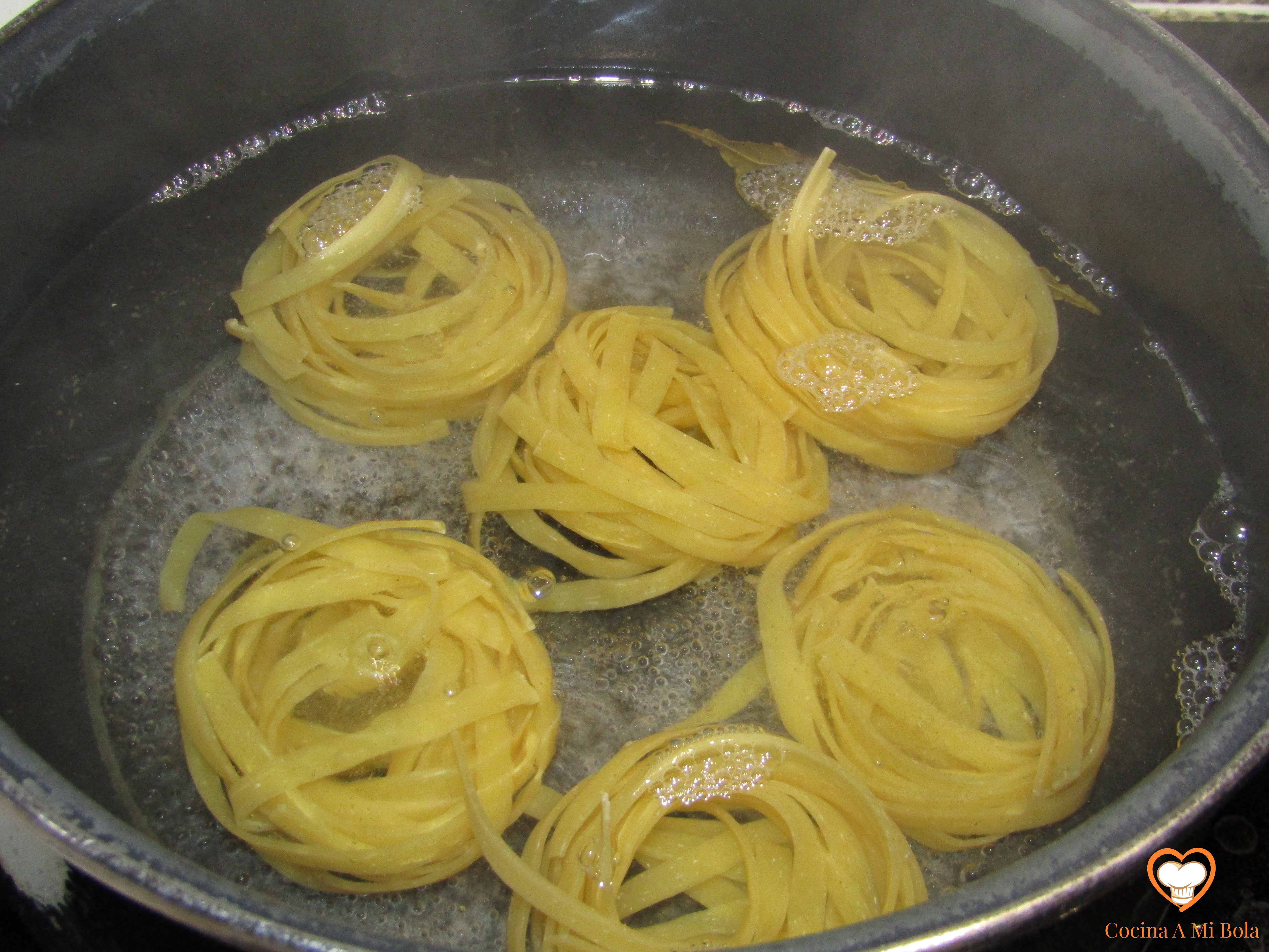 QUINTO.- Ahora vamos a cocer la pasta echándola en agua hirviendo con un poco de sal y laurel. Deja un minutillo que el agua hierva fuerte antes de echar la pasta para que el laurel infusione y la aromatice. Una vez echamos los nidos de tagliatelle removemos suavemente, bajamos el fuego al mínimo sin que deje de hervir y los cocemos el tiempo que haya fijado el fabricante en el paquete, pero la cosa anda entre los 6 y los 9 minutos. Yo soy más de pasta al dente que suave… que cada cocinero decida.