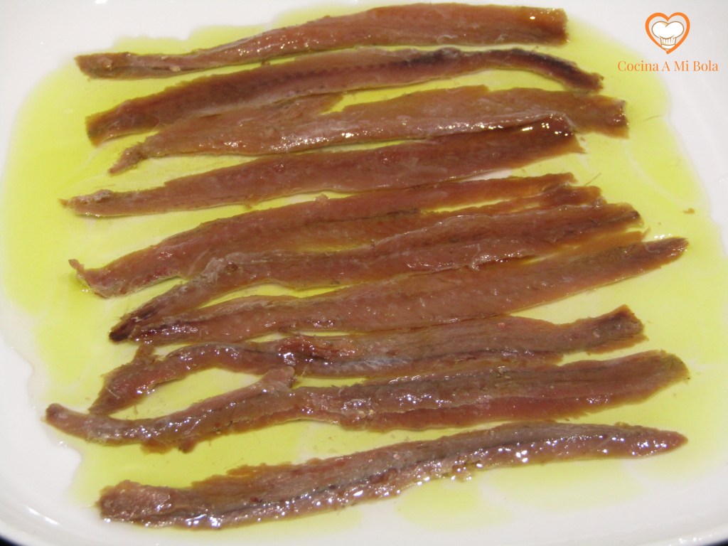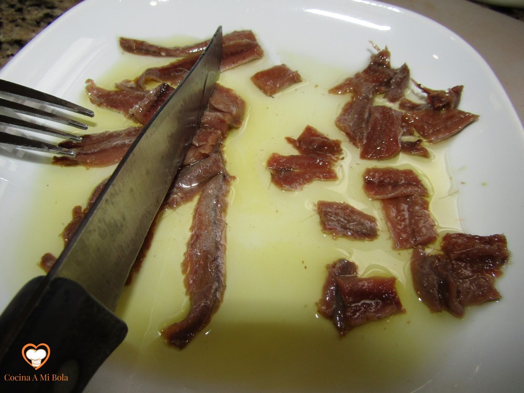 CUARTO.- Abre una lata de anchoas en aceite de oliva, extiéndelas en paralelo sobre un plato y “alégralas” un poco con AOVE en hilo fino, porque hay que hacer un verdadero acto de fe para aceptar que el aceite que trae la lata sea de oliva a juzgar por el color. Córtalas en trocitos de 1 cm aproximadamente y reserva.