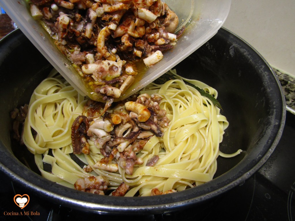 SEXTO.- Transcurrido el tiempo, vierte la pasta en un colador sobre el fregadero, vaciando del todo el agua de la cazuela y devolviendo a ella los tagliatelle. Vuelca las anchoas y el pulpo con todo su aceite y remueve con cuidado para que no se rompan las cintas.