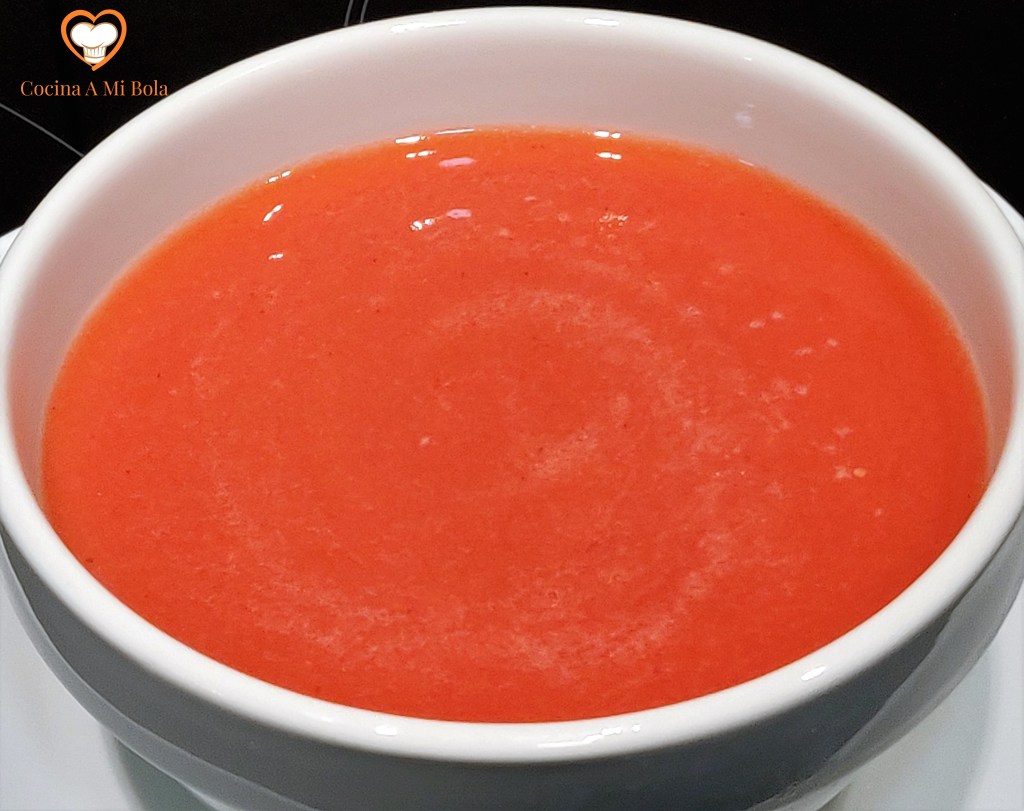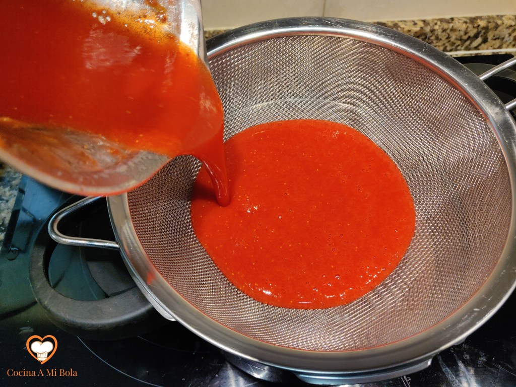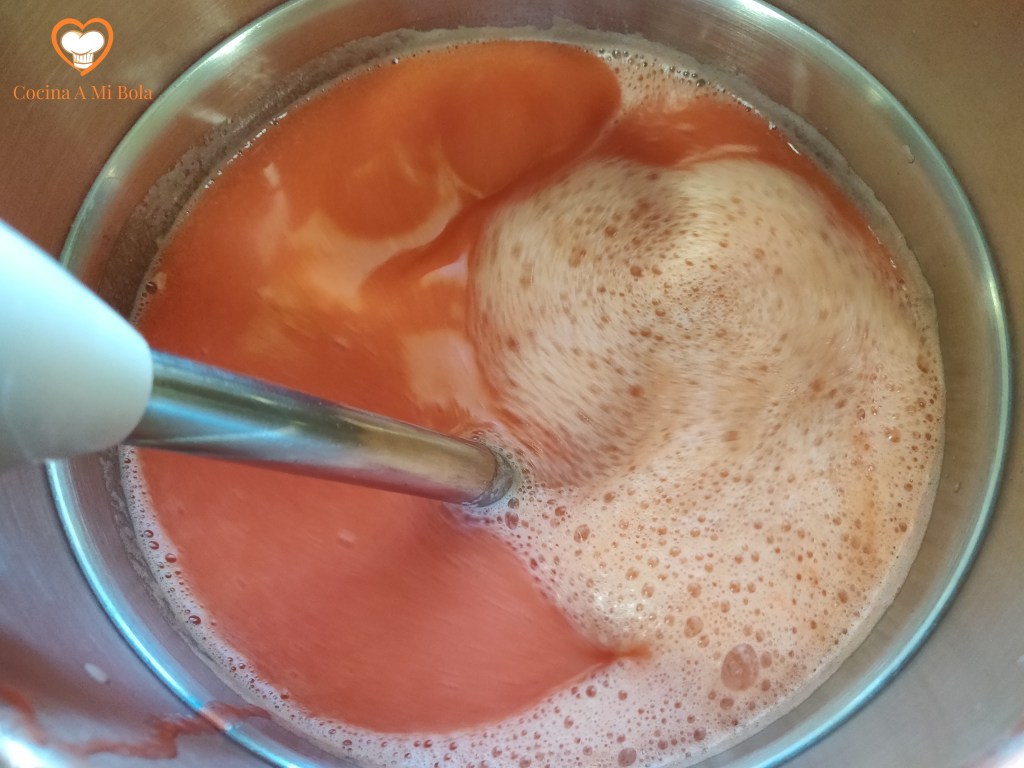 QUINTO.- Pasados eso tres minutos de reducción del vino, agregaremos el caldo de ave previamente calentado. Dejamos que hierva suave un par de minutos y -sacando las dos hojas de laurel primero- batiremos todo. Si crees que no vas a poder hacerlo ,directamente en la sartén, pásalo a un vaso o jarra altos y tritura para que quede una salsa fina.