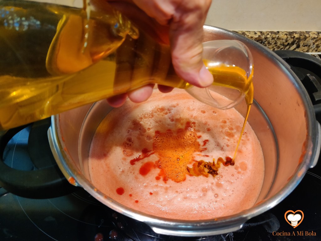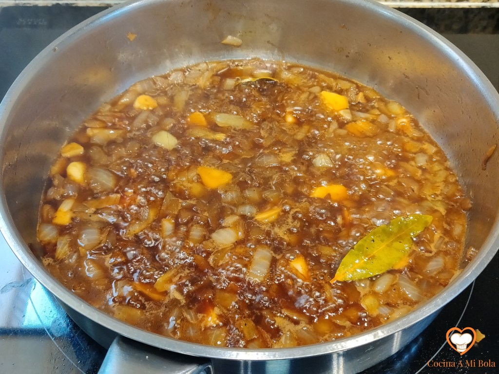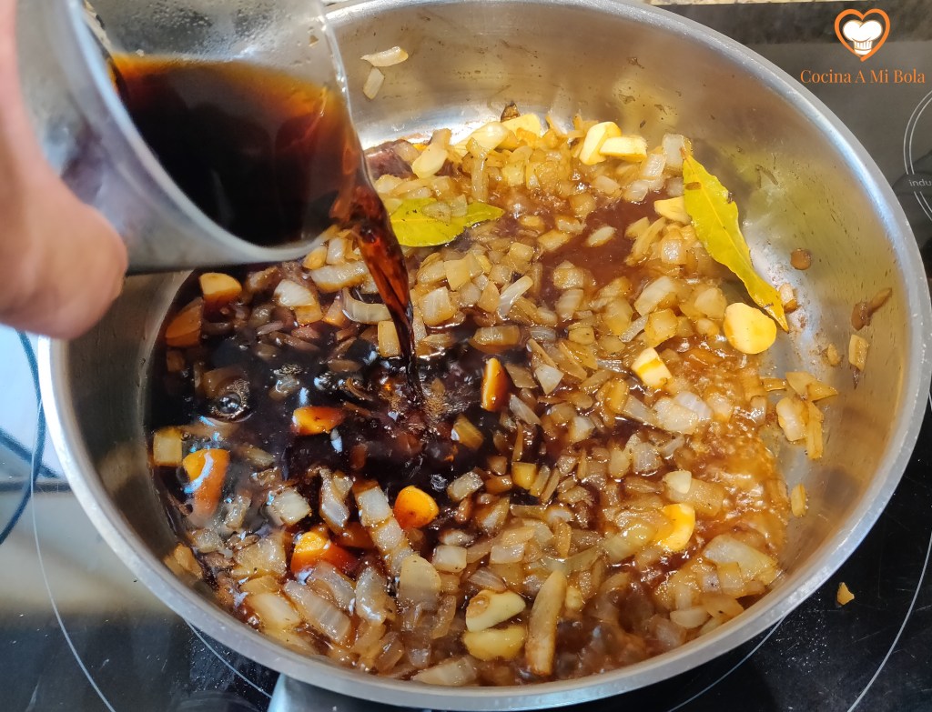 CUARTO.- Cuando ya esté la cebolla tierna, lacia y con este tono marroncete, echaremos el vino dulce de MÁLAGA VIRGEN, subiremos el fuego hasta que tome un hervor mínimo y lo mantendremos durante unos 3 minutos para que evaporando un poco el alcohol y reduciendo, aportará azúcares de un sabor increíble.