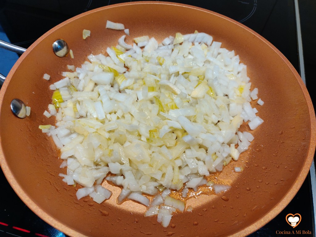TERCERO.- Mientras doramos el solomillo, pica la cebolla y corta los dientes de ajo en dos o tres trozos. Echa todo a la sartén una vez hayas sacado la carne. Tal vez tengas que añadir un poco más de AOVE, pero sin excesos. Salpimenta ligeramente y ponle una o dos hojas de laurel. Deja que poche a fuego medio-bajo hasta que quede tierno y dorado.