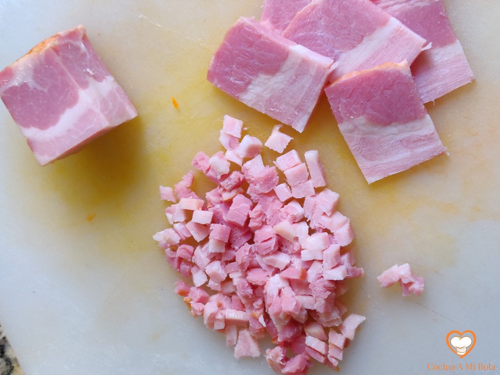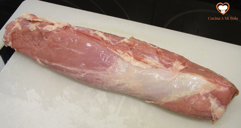 PRIMERO.- Limpiamos el solomillo de la grasa adiposa que tiene por fuera. Asimismo, eliminamos esa nervatura o telilla bastante dura y bien adherida a la carne, para lo que introducimos un cuchillo bien afilado y con punta de modo que haciendo el corte hacia arriba, eliminemos esta tela sin cortar carne. Mira la foto. Elimínalo todo con paciencia y tendrás ya el solomillo preparado.