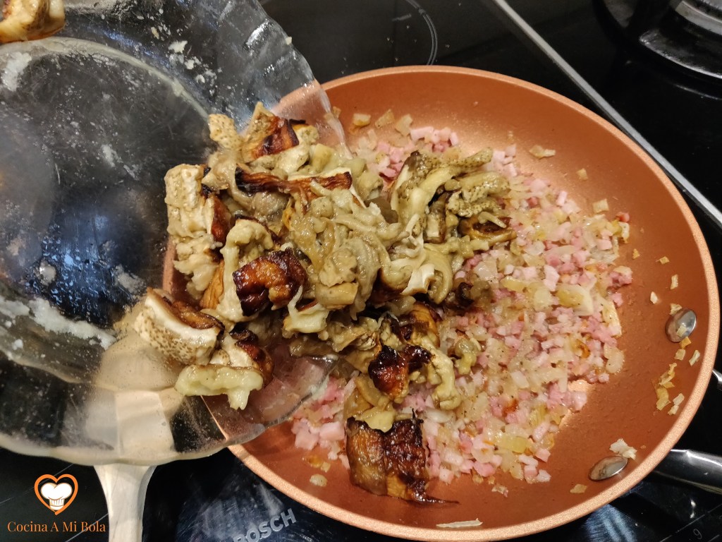 SEXTO.- Devolvemos la salsa a la sartén honda del inicio y agregamos los champiñones laminados. Probamos para rectificar de sal y pimienta y lo llevamos a esa suave ebullición durante 3 ó 4 minutos para que el champiñón se cocine un poco y reduzca la salsa.