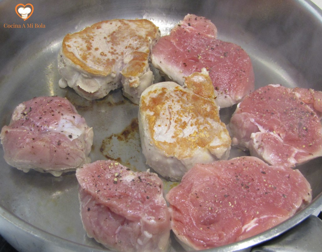 SEGUNDO.- Corta ahora la carne en medallones bastante gruesos, como de 3,5 a 4 centímetros de ancho. Salpimenta y pon una sartén grande y honda al fuego (donde quepa la carne sin amontonarse). Un poco de aceite de oliva virgen extra y cuando esté bien caliente, sella cada trozo de carne por ambos lados. Se trata de cerrarle el poro para que no pierda sus jugos internos y de dorarla un poco. Sácala a un plato y reserva.