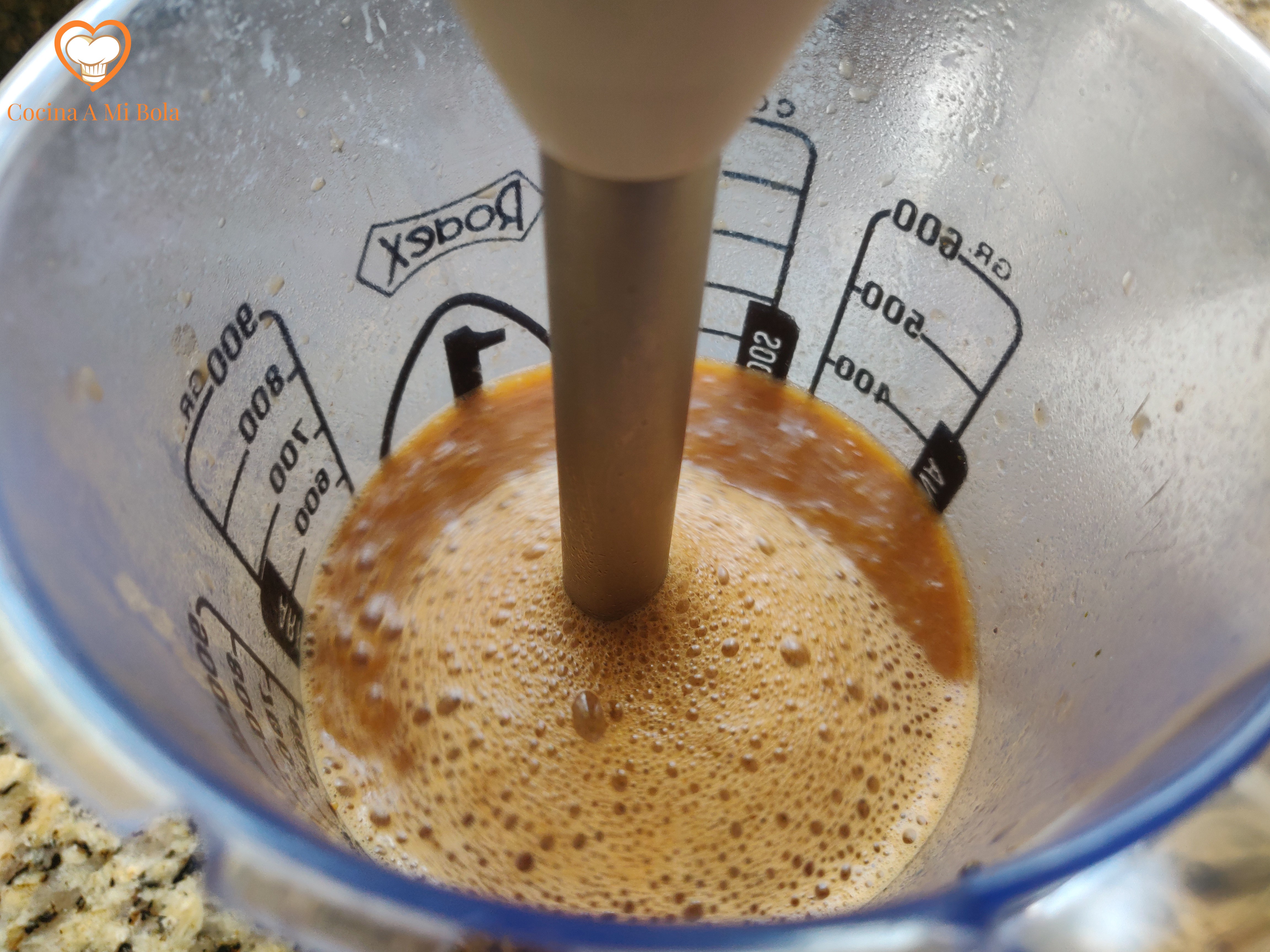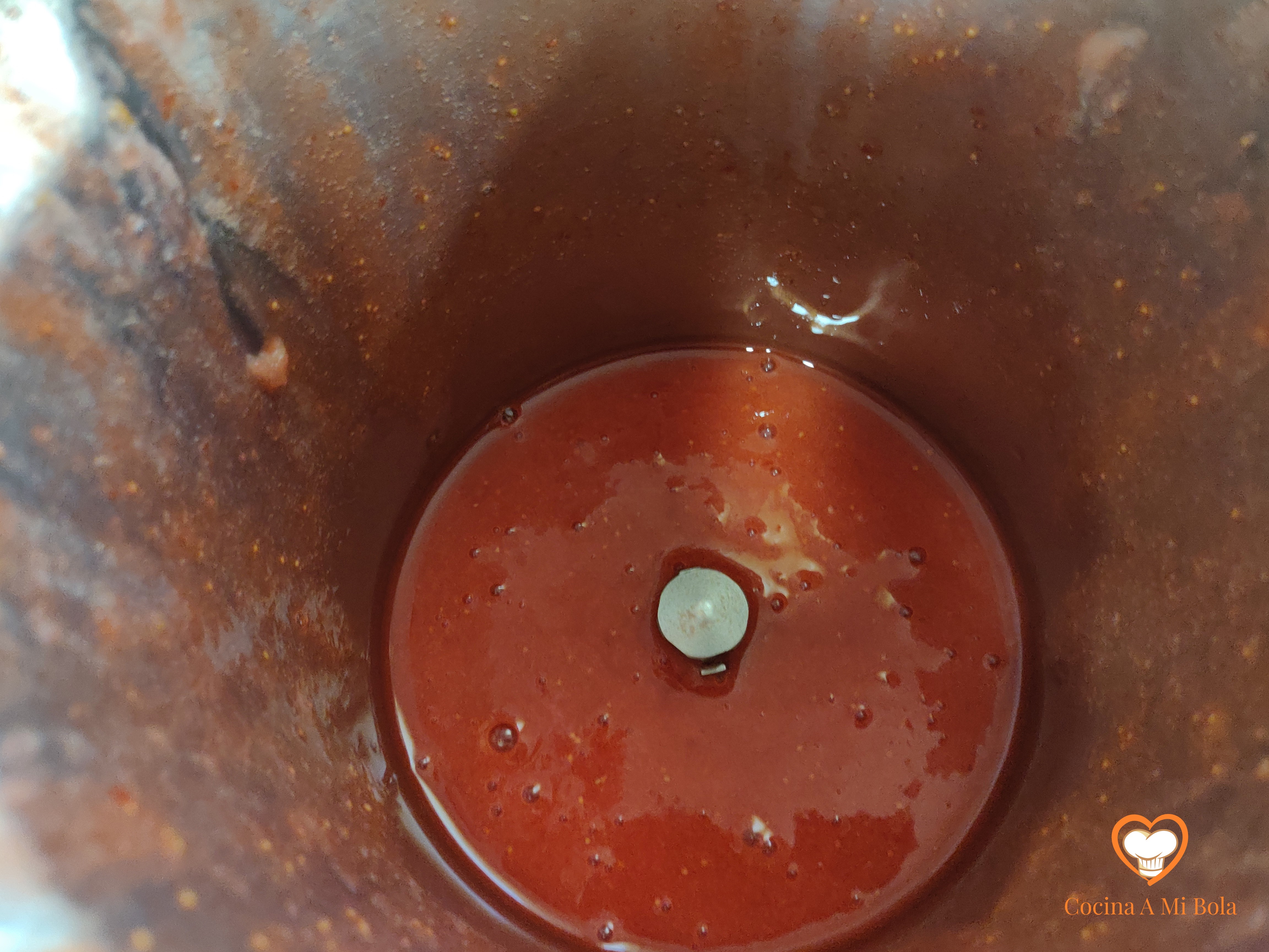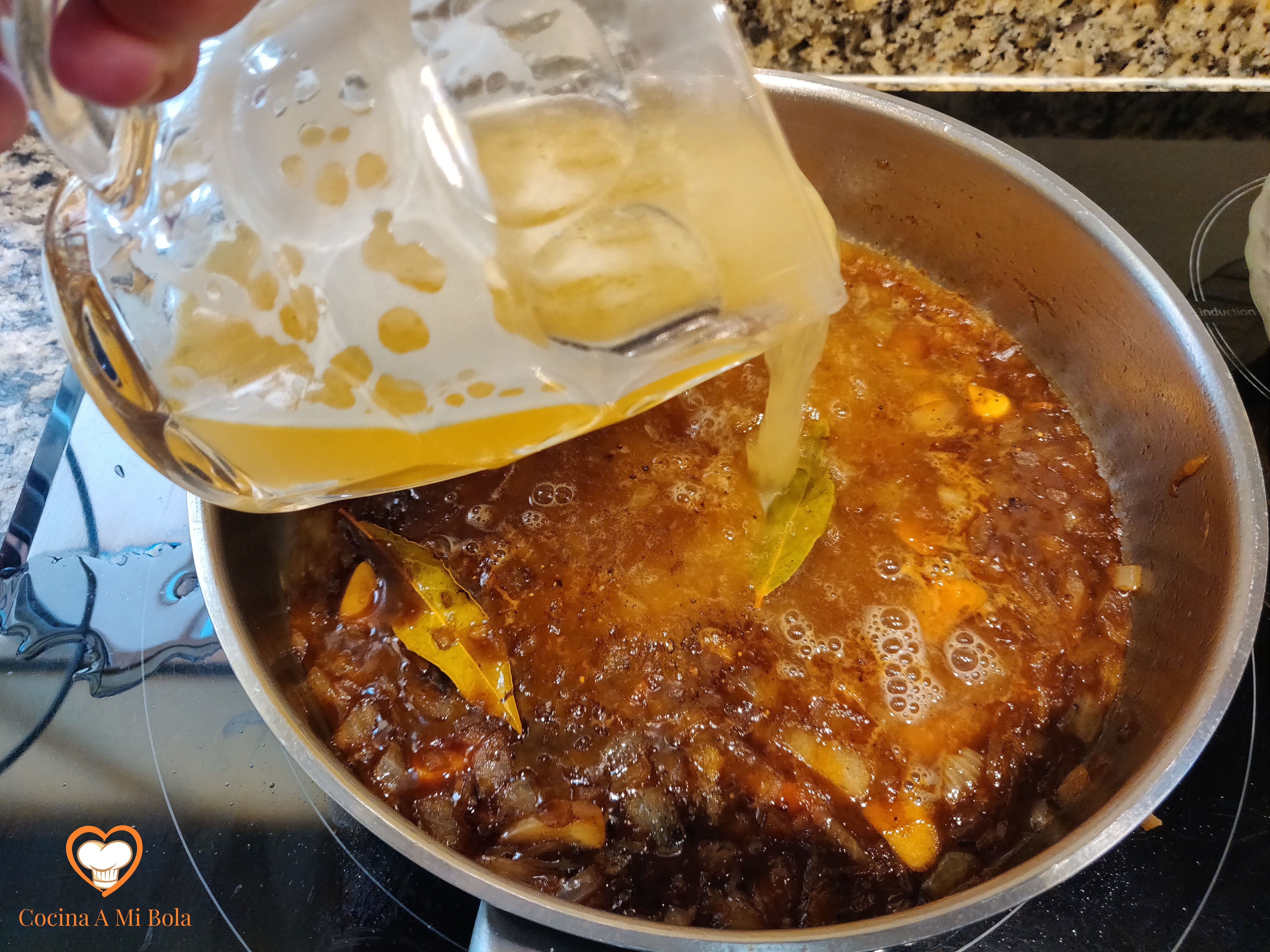 QUINTO.- Pasados eso tres minutos de reducción del vino, agregaremos el caldo de ave previamente calentado. Dejamos que hierva suave un par de minutos y -sacando las dos hojas de laurel primero- batiremos todo. Si crees que no vas a poder hacerlo ,directamente en la sartén, pásalo a un vaso o jarra altos y tritura para que quede una salsa fina.
