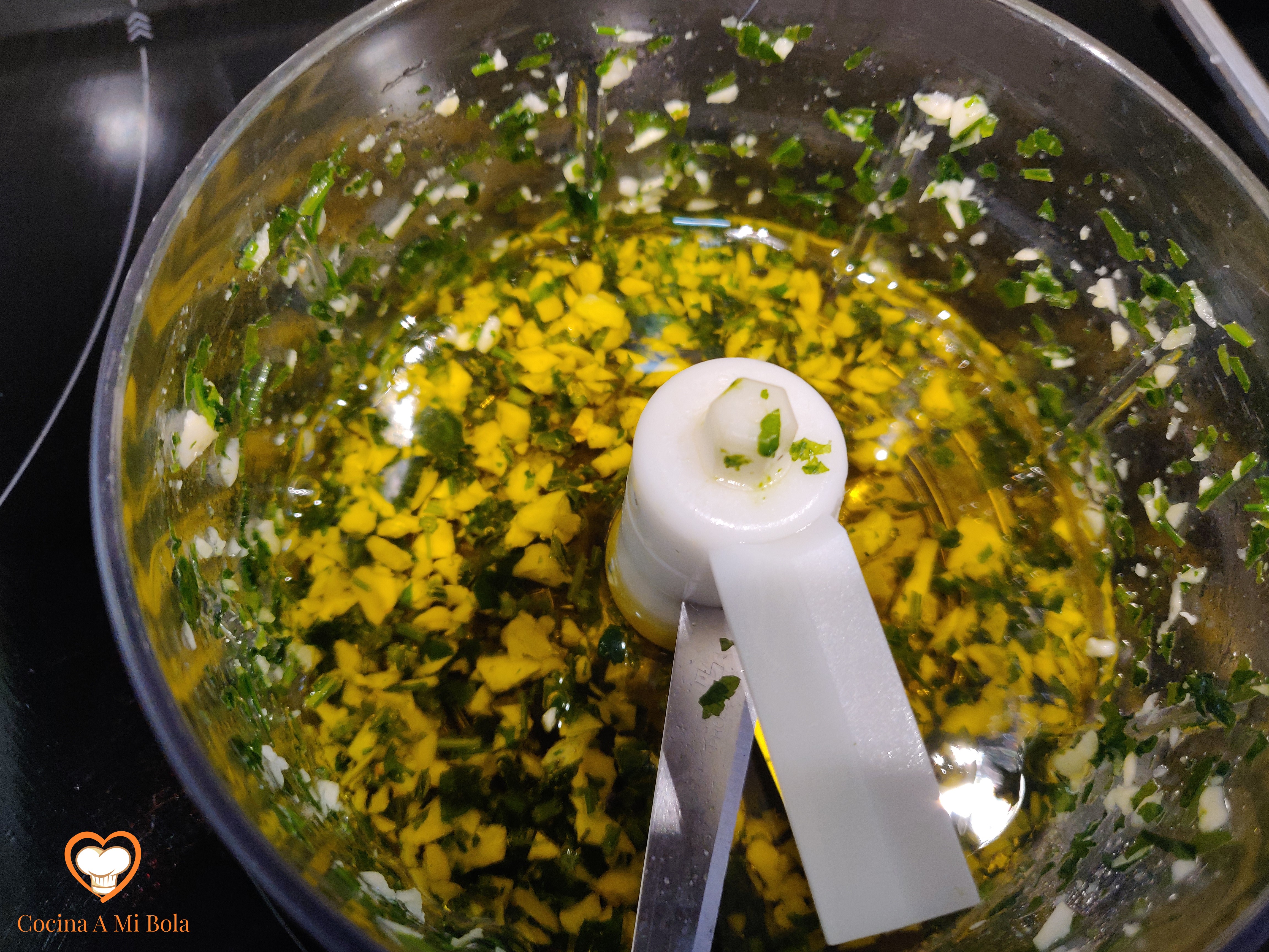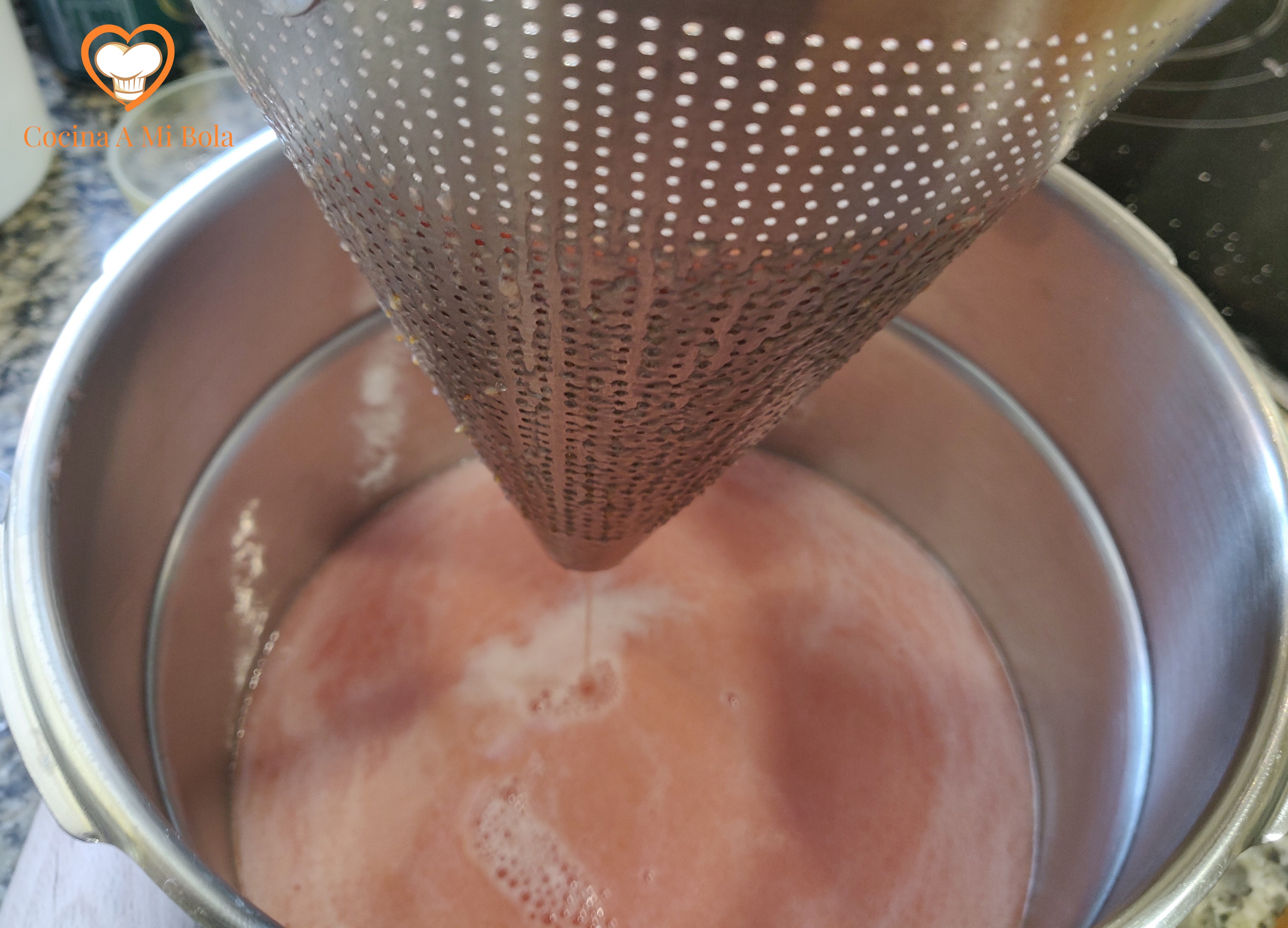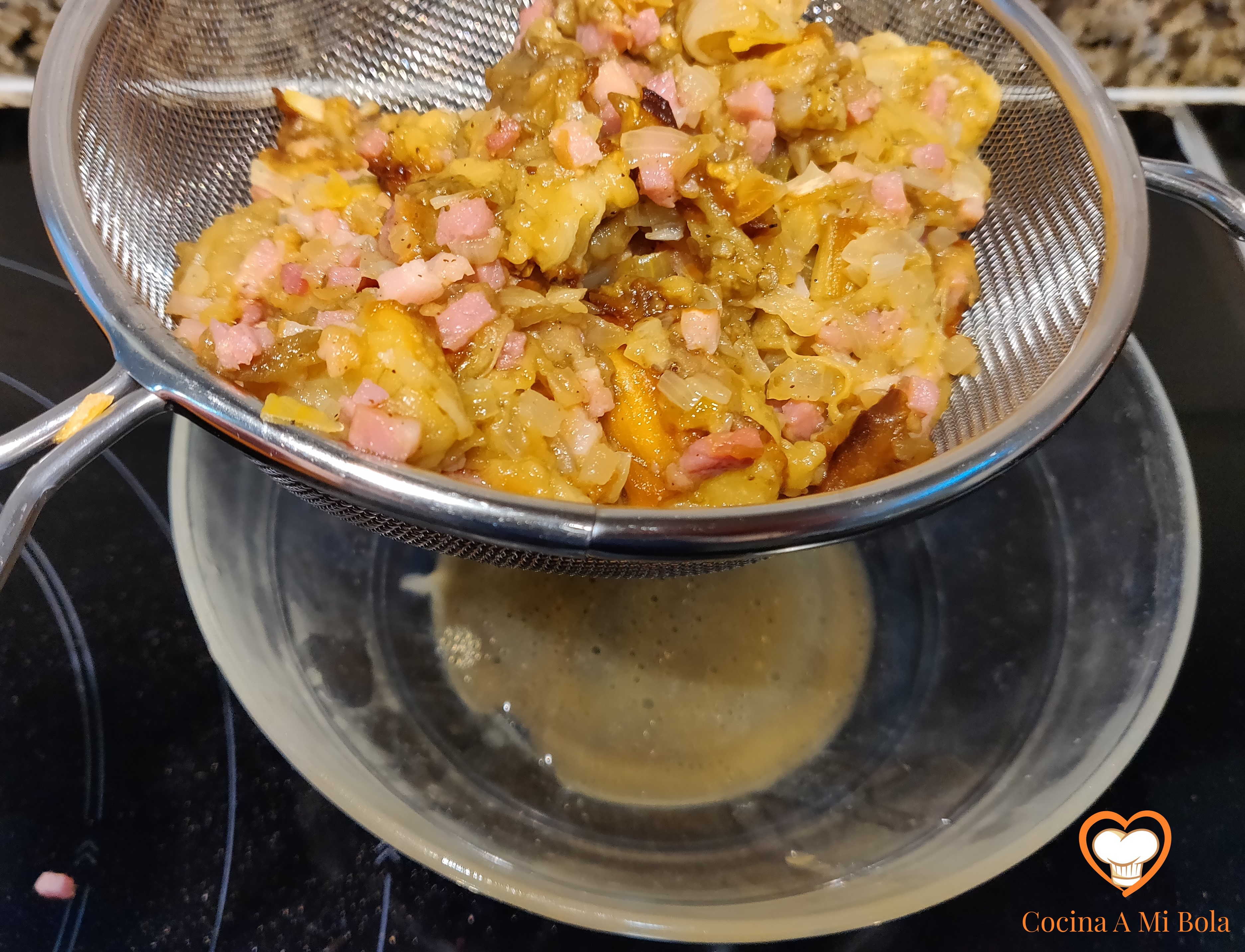 QUINTO.- Pasados eso tres minutos de reducción del vino, agregaremos el caldo de ave previamente calentado. Dejamos que hierva suave un par de minutos y -sacando las dos hojas de laurel primero- batiremos todo. Si crees que no vas a poder hacerlo ,directamente en la sartén, pásalo a un vaso o jarra altos y tritura para que quede una salsa fina.