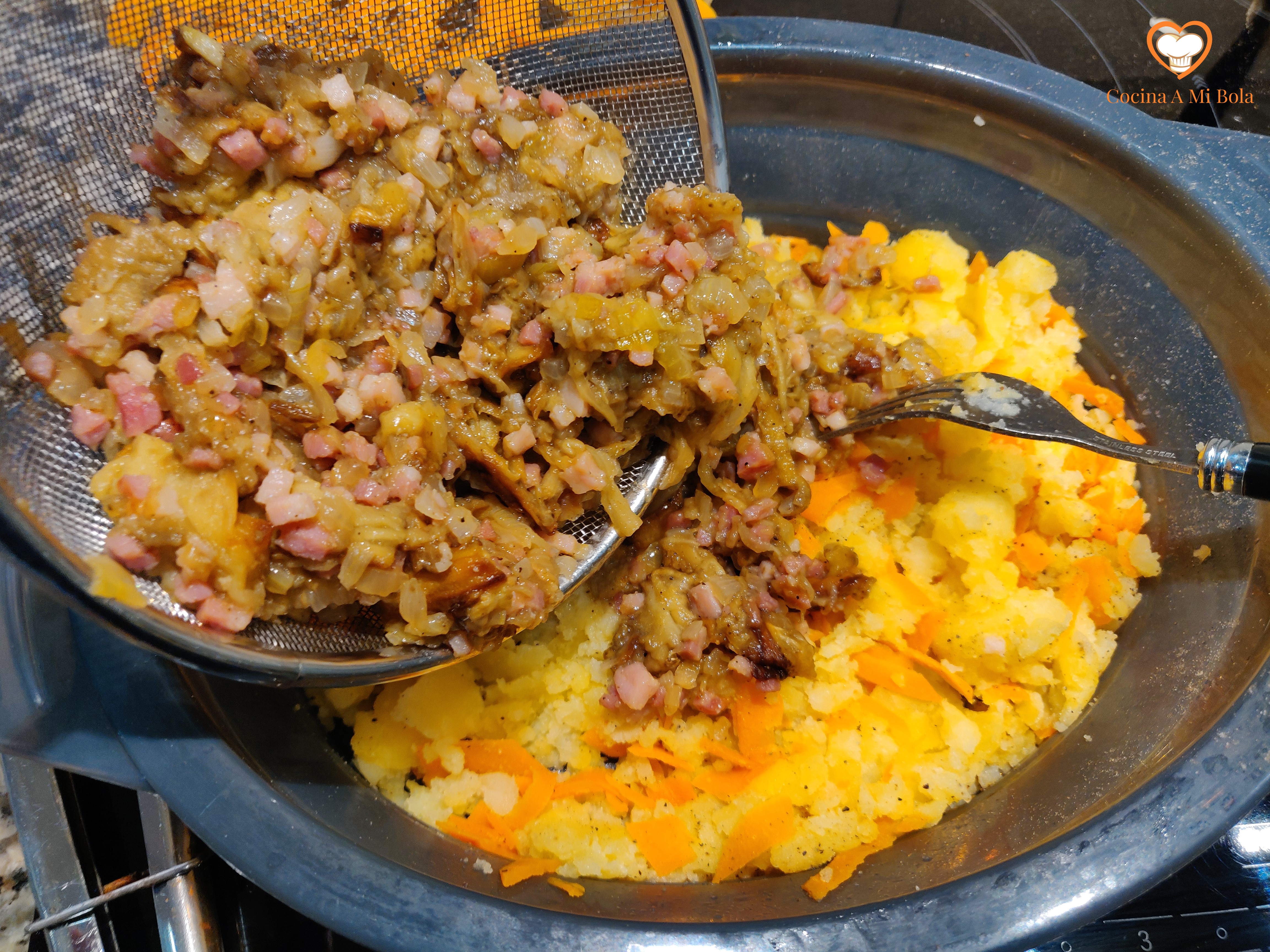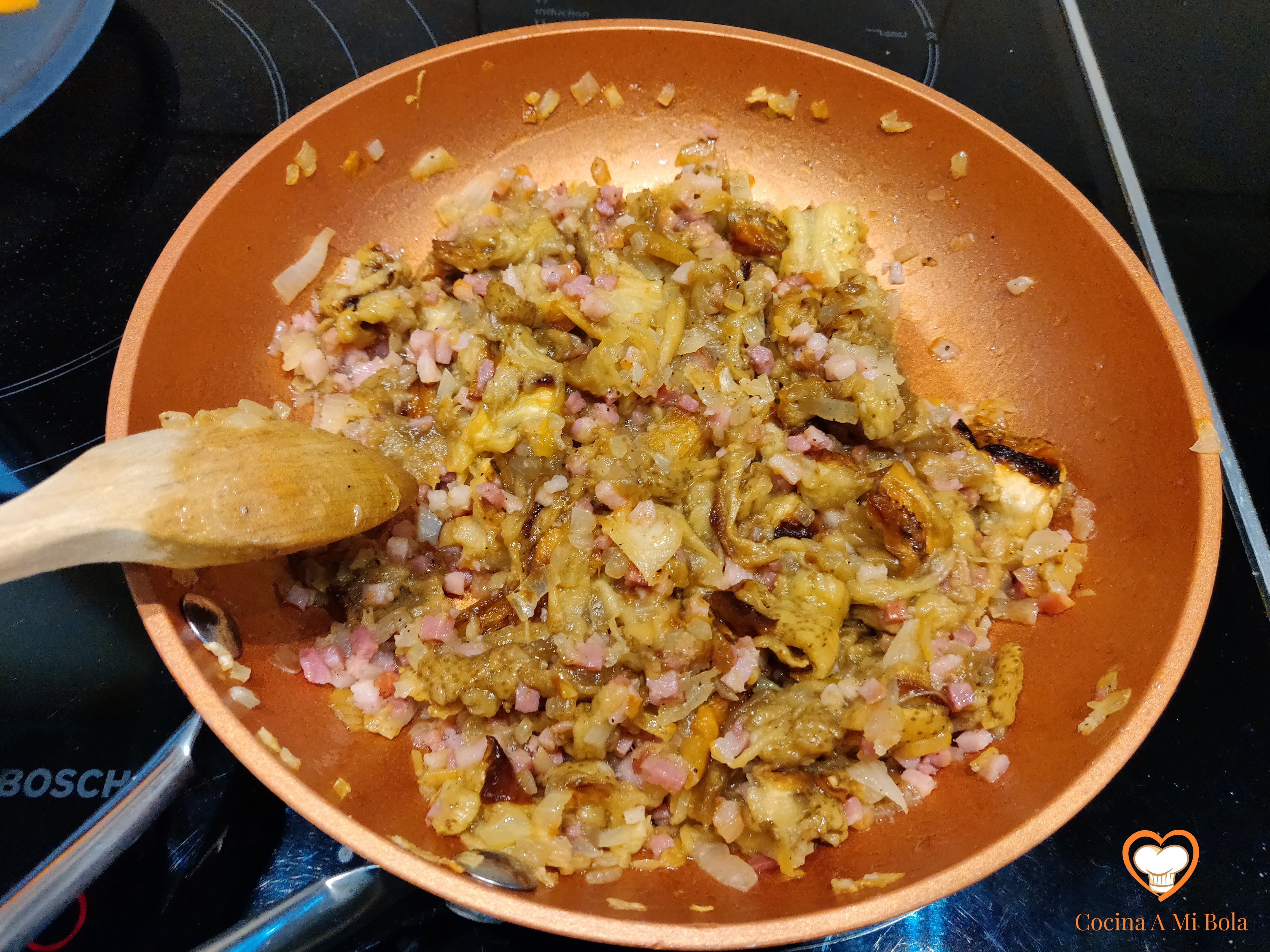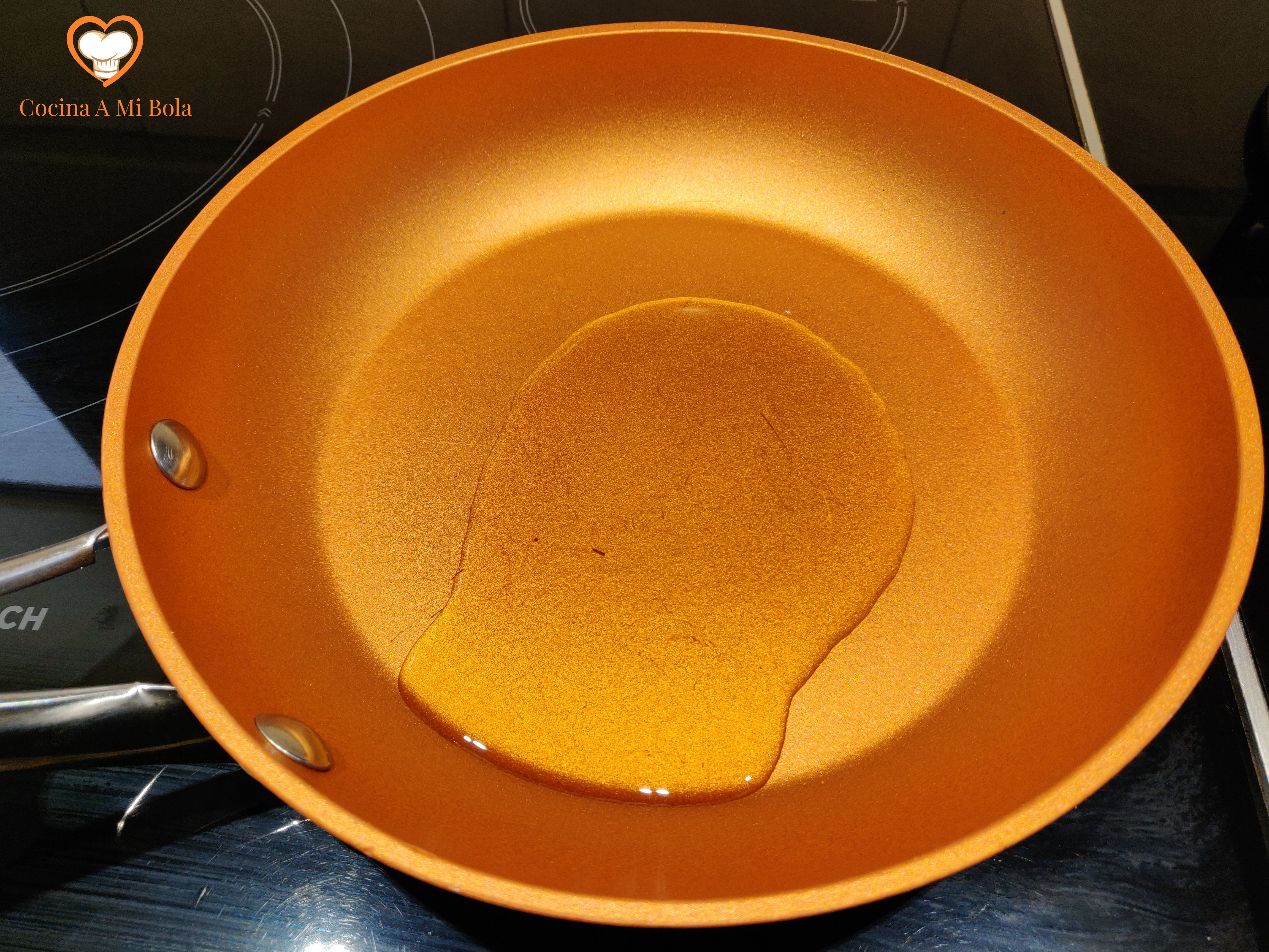 CUARTO.- Cuando ya esté la cebolla tierna, lacia y con este tono marroncete, echaremos el vino dulce de MÁLAGA VIRGEN, subiremos el fuego hasta que tome un hervor mínimo y lo mantendremos durante unos 3 minutos para que evaporando un poco el alcohol y reduciendo, aportará azúcares de un sabor increíble.