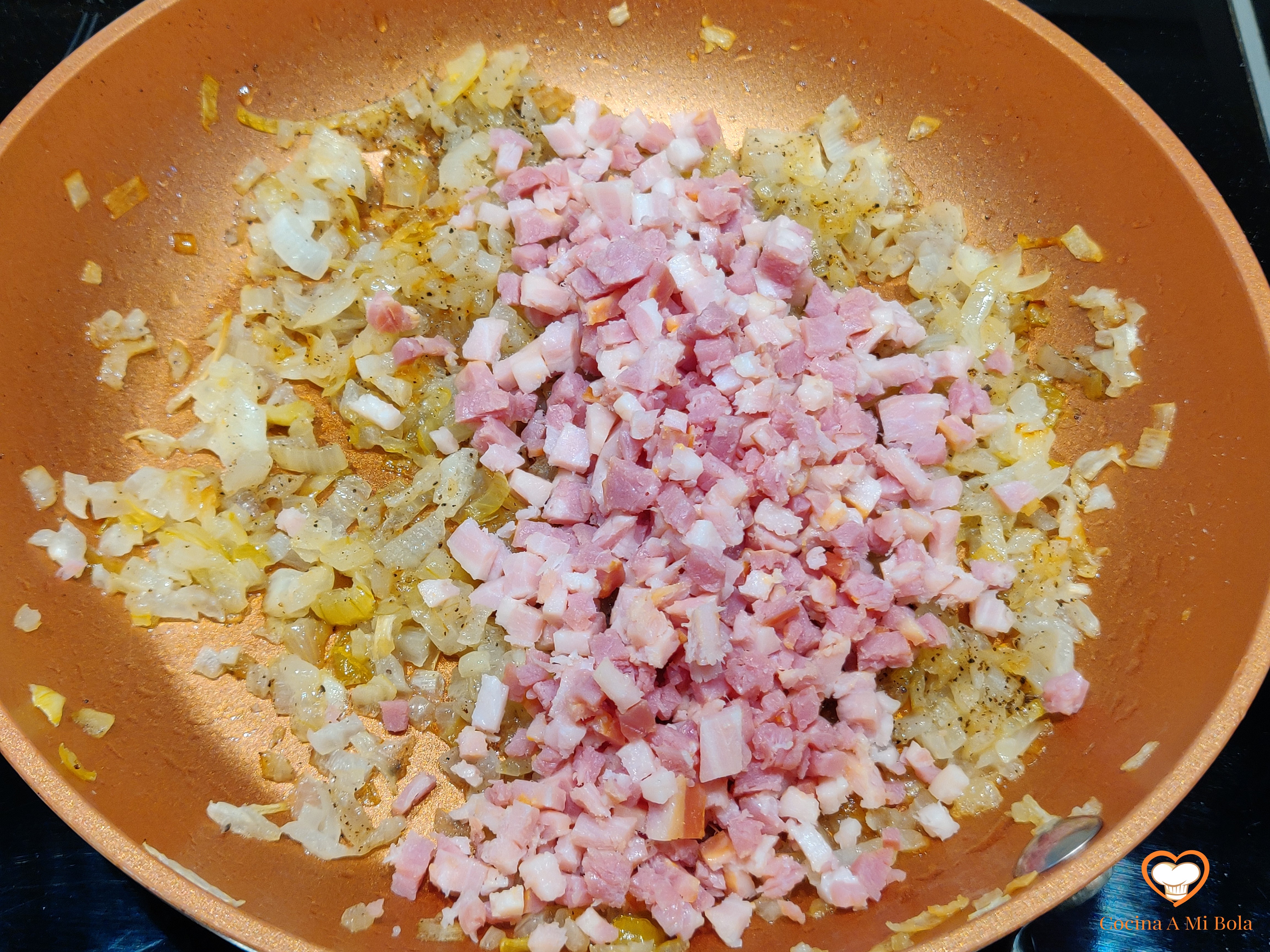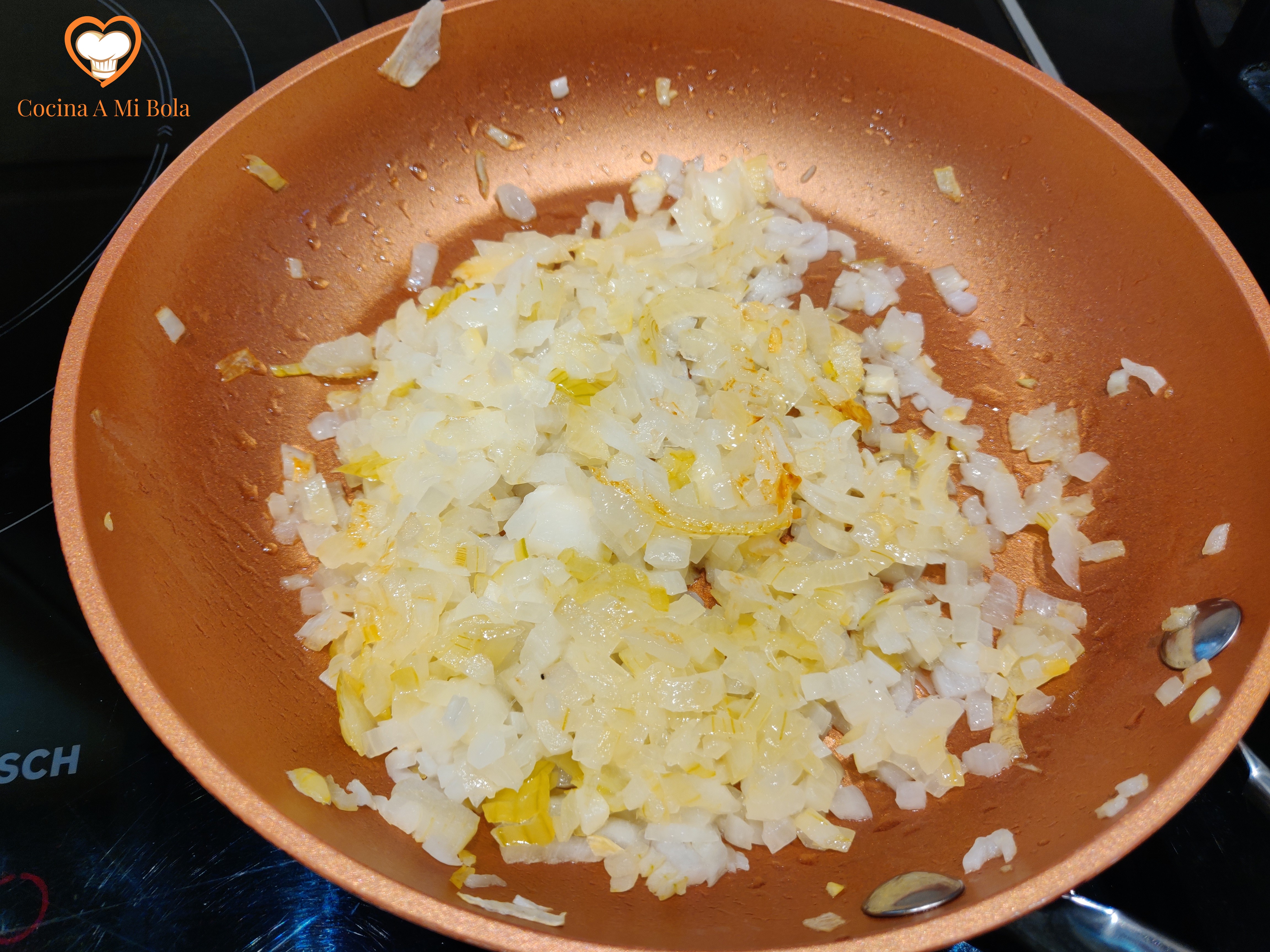TERCERO.- Mientras doramos el solomillo, pica la cebolla y corta los dientes de ajo en dos o tres trozos. Echa todo a la sartén una vez hayas sacado la carne. Tal vez tengas que añadir un poco más de AOVE, pero sin excesos. Salpimenta ligeramente y ponle una o dos hojas de laurel. Deja que poche a fuego medio-bajo hasta que quede tierno y dorado.