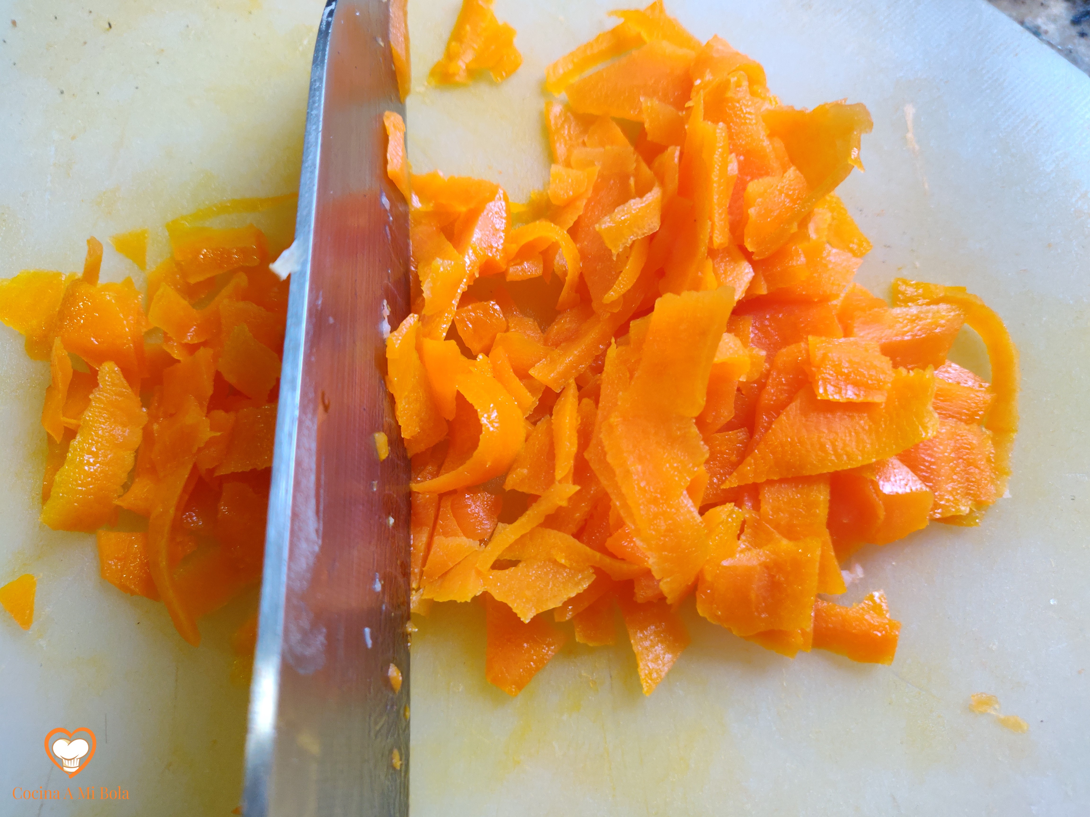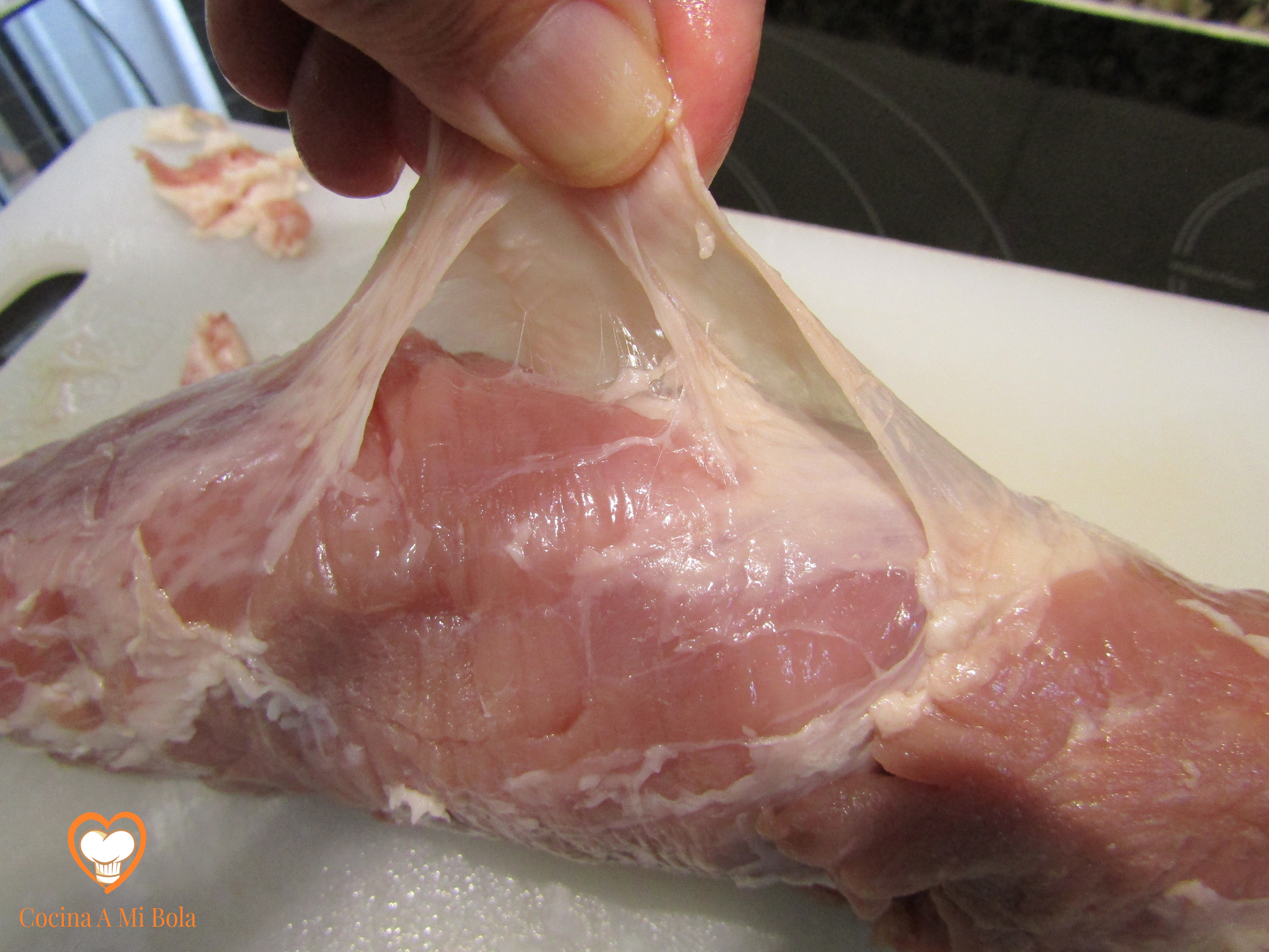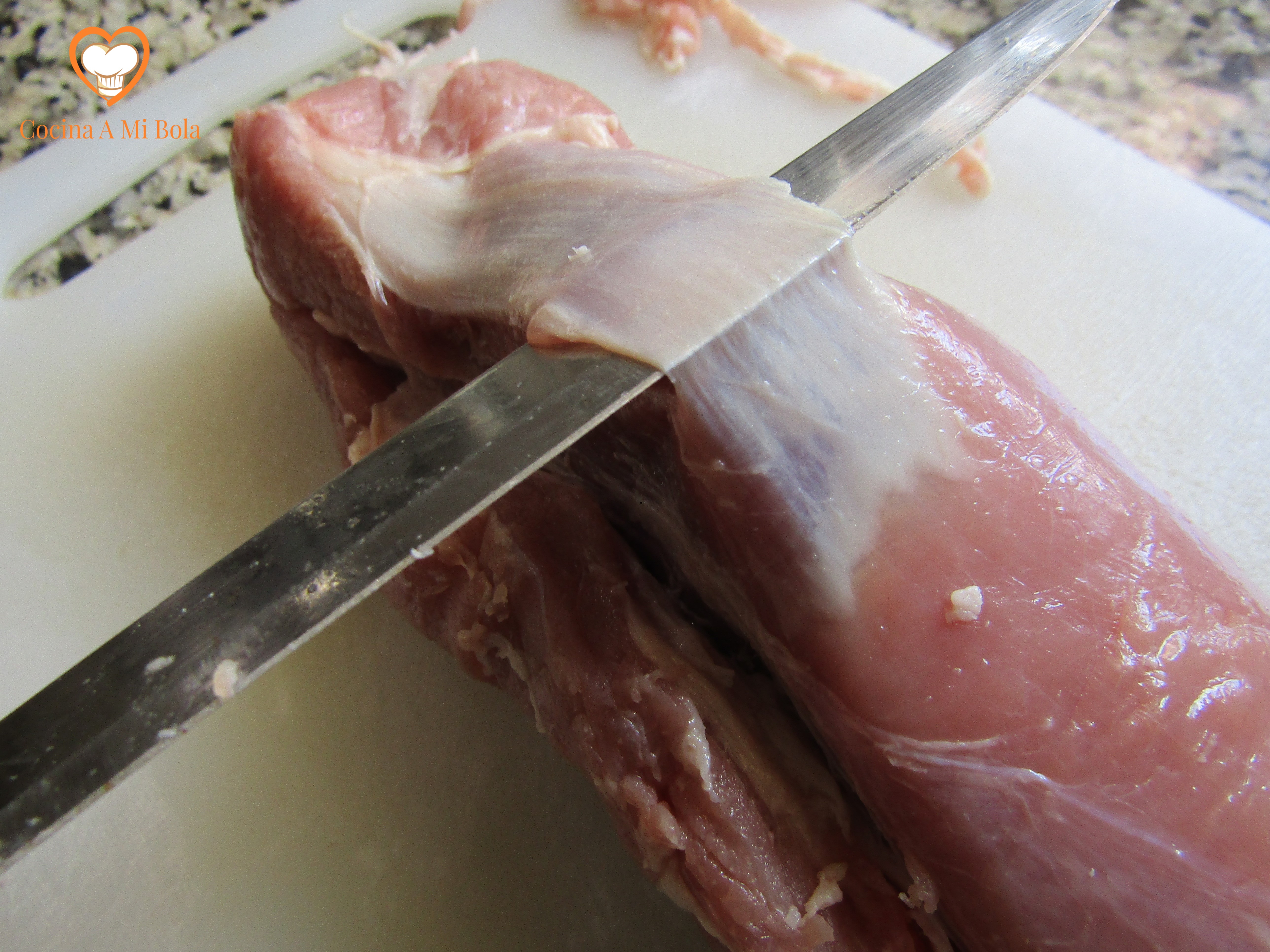 PRIMERO.- Limpiamos el solomillo de la grasa adiposa que tiene por fuera. Asimismo, eliminamos esa nervatura o telilla bastante dura y bien adherida a la carne, para lo que introducimos un cuchillo bien afilado y con punta de modo que haciendo el corte hacia arriba, eliminemos esta tela sin cortar carne. Mira la foto. Elimínalo todo con paciencia y tendrás ya el solomillo preparado.