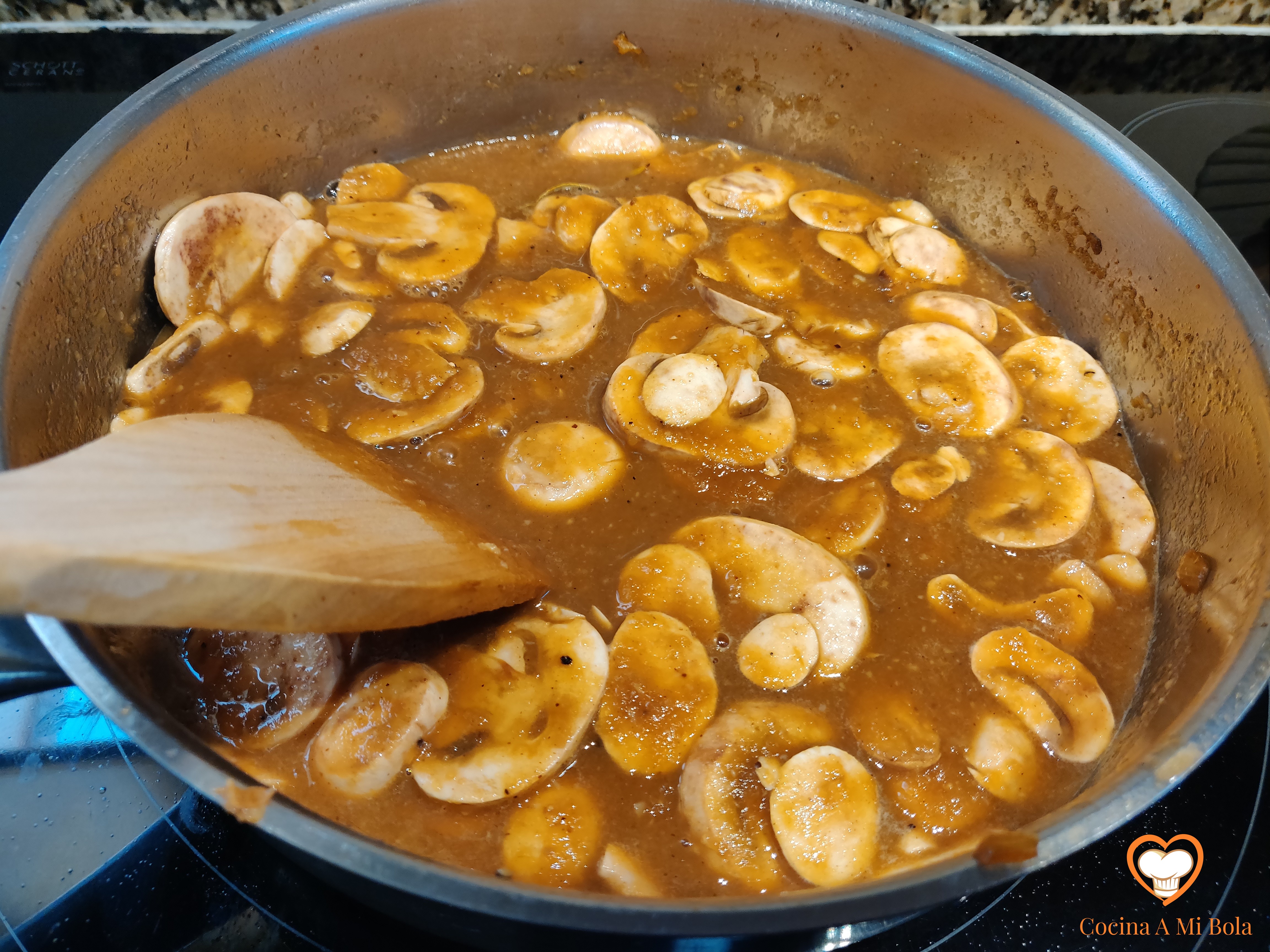 SEXTO.- Devolvemos la salsa a la sartén honda del inicio y agregamos los champiñones laminados. Probamos para rectificar de sal y pimienta y lo llevamos a esa suave ebullición durante 3 ó 4 minutos para que el champiñón se cocine un poco y reduzca la salsa.