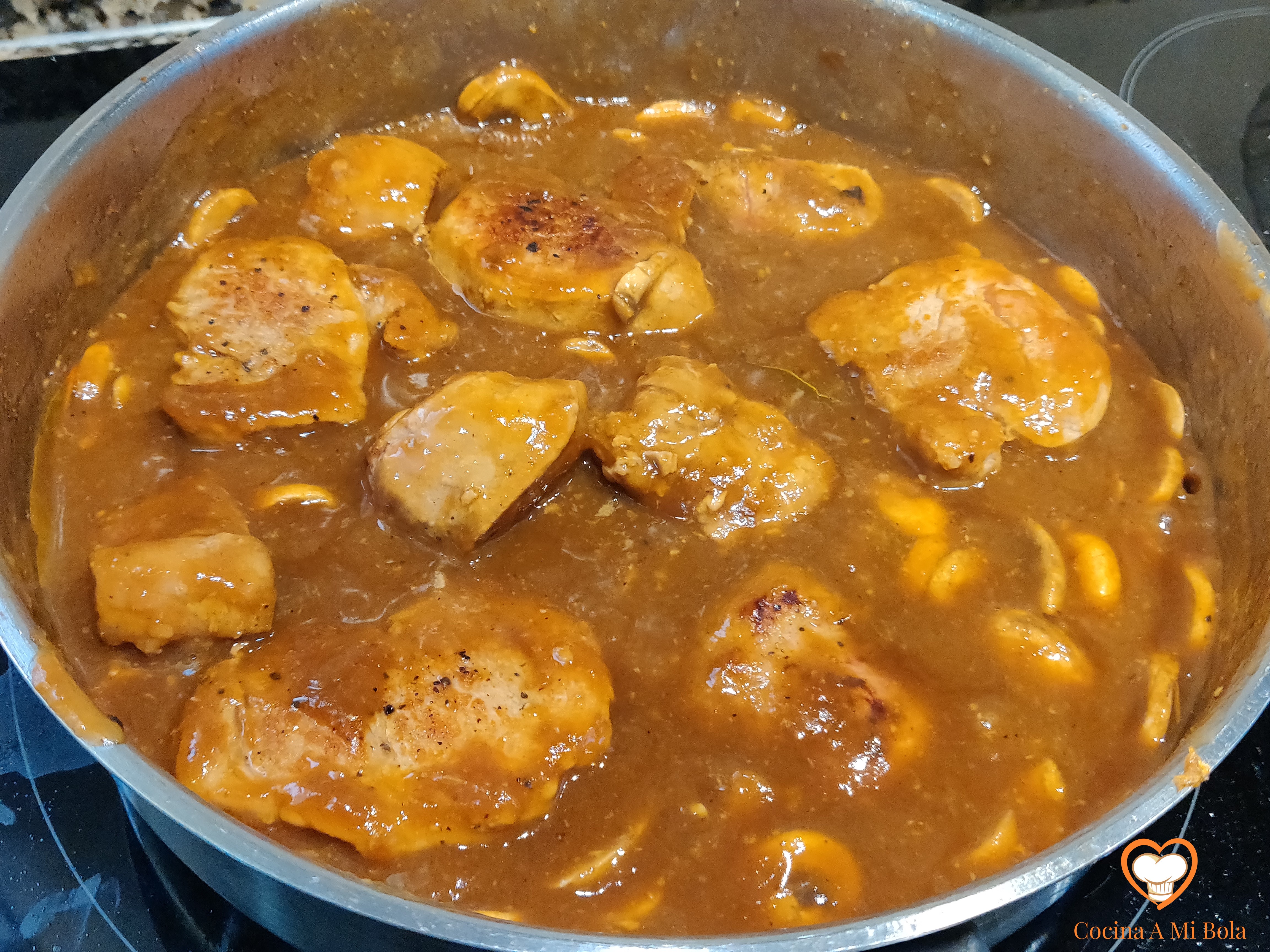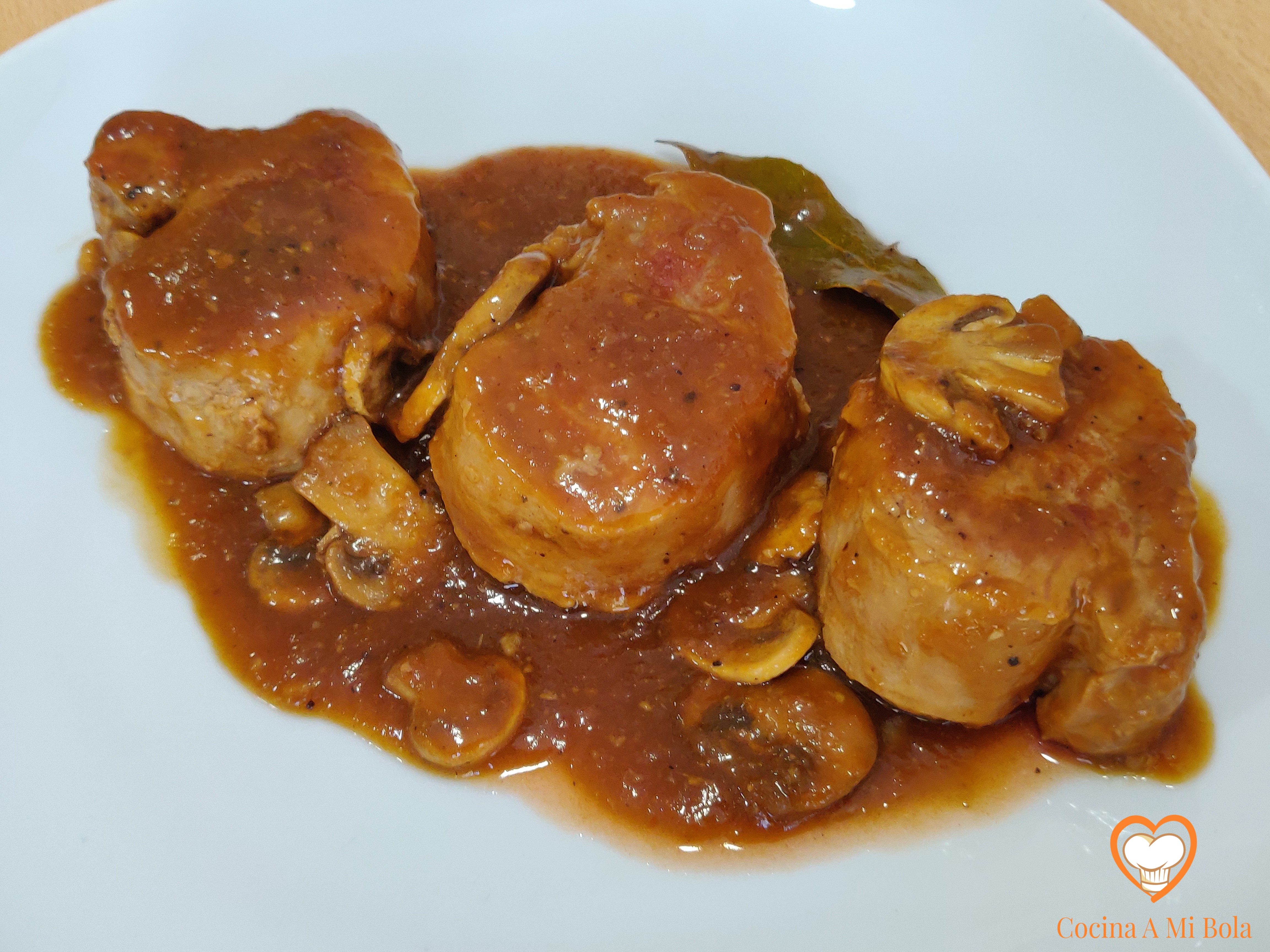 INGREDIENTES: Para 2/3 personas: 1 solomillo de cerdo de 700 gr, 1 cebolla mediana, 4 dientes de ajo, aceite de oliva virgen extra, 150 cc vino dulce Málaga Virgen (Pedro Ximénez), 200 cc caldo de pollo, pimienta negra molida, 2 hojas de laurel, sal, 150 gr champiñones laminados y 1 cucharada de Maizena Express.