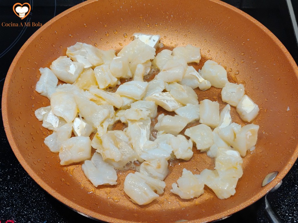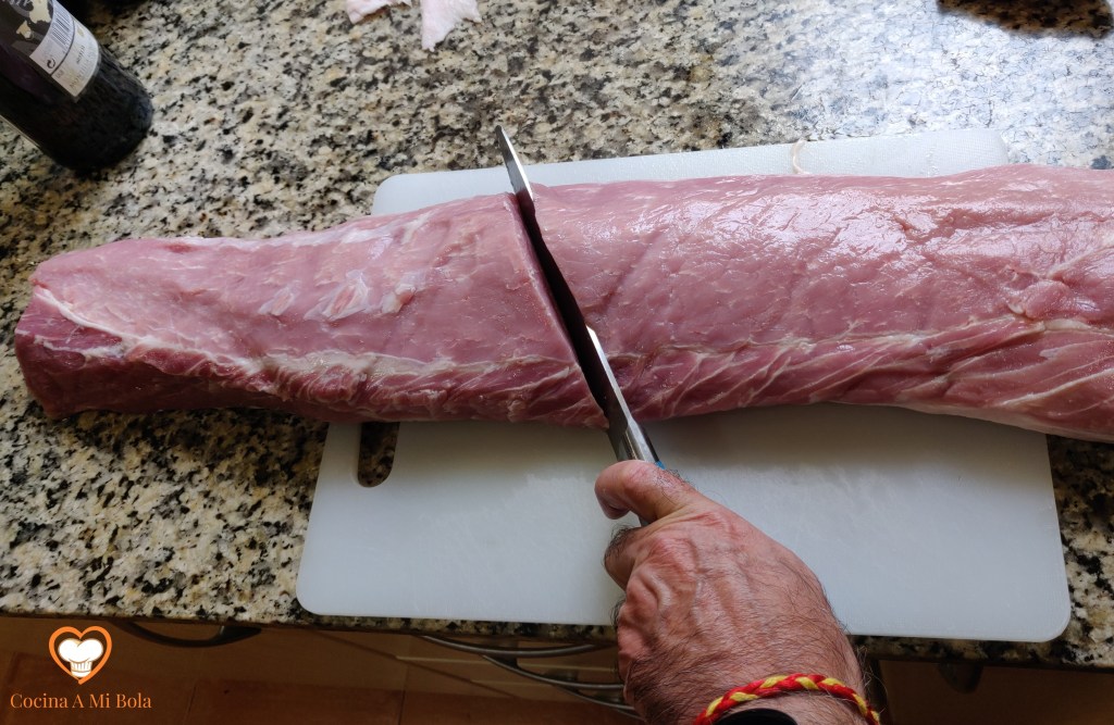 Saca el lomo de su envase plástico y lávalo muy bien al grifo. Sécalo con papel de cocina y, si quieres, elimina el exceso de grasa adherida a su superficie por uno de sus lados, pero esto no es imprescindible. Utiliza para ello en su caso, un cuchillo bien afilado de forma que puedas cortar superficialmente la grasa sin afectar también la carne. Sepáralos en dos mitades con un corte diagonal.