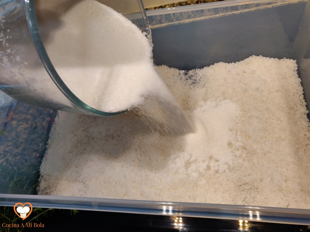 SEGUNDO.- Prepara el recipiente con sal gruesa 80% y azúcar 20%. Mézclalo bien y haz con ello una cama en el fondo de unos 4 cm. Coloca las piezas y procura que apoyen sobre uno de sus lados más estrechos sin tocarse entre ellas. La pieza de lomo tiene forma ovalada, así que procuraremos ponerla tumbada sobre uno de sus lados estrechos (de pie), soportándola con la sal. De este modo irá redondeándose un poco ese óvalo. Separa una pieza de otra todo lo que puedas. Como ves, en mi caso, el espacio se quedaba algo justo dentro de la caja. Me vi forzado a ello porque un recipiente mayor no me cabía en el frigorífico.
