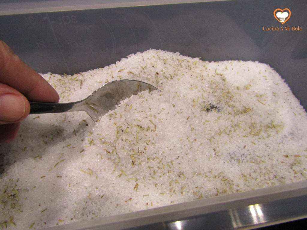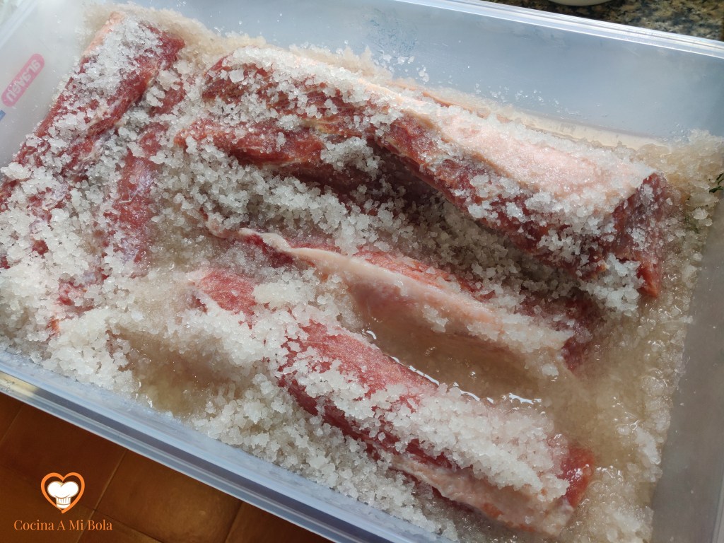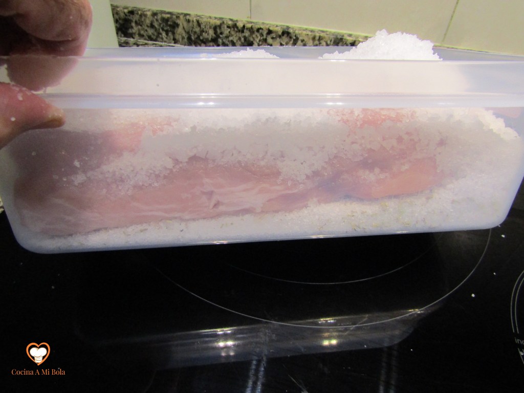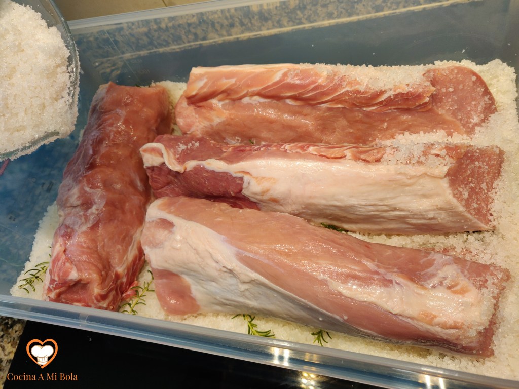 PRIMERO.- El procedimiento inicial es idéntico al embuchado. Lávalo, retira la grasa exterior si lo prefieres, y lo metemos en un recipiente con sal y azúcar en proporción 80/20. Puedes poner una ramita de romero fresco, mezclar con la sal un poco de romero seco o no poner nada. Cúbrelo y mételo en la nevera unas 18 horas. No lo tengas más tiempo porque te arriesgas a que esté muy salado.