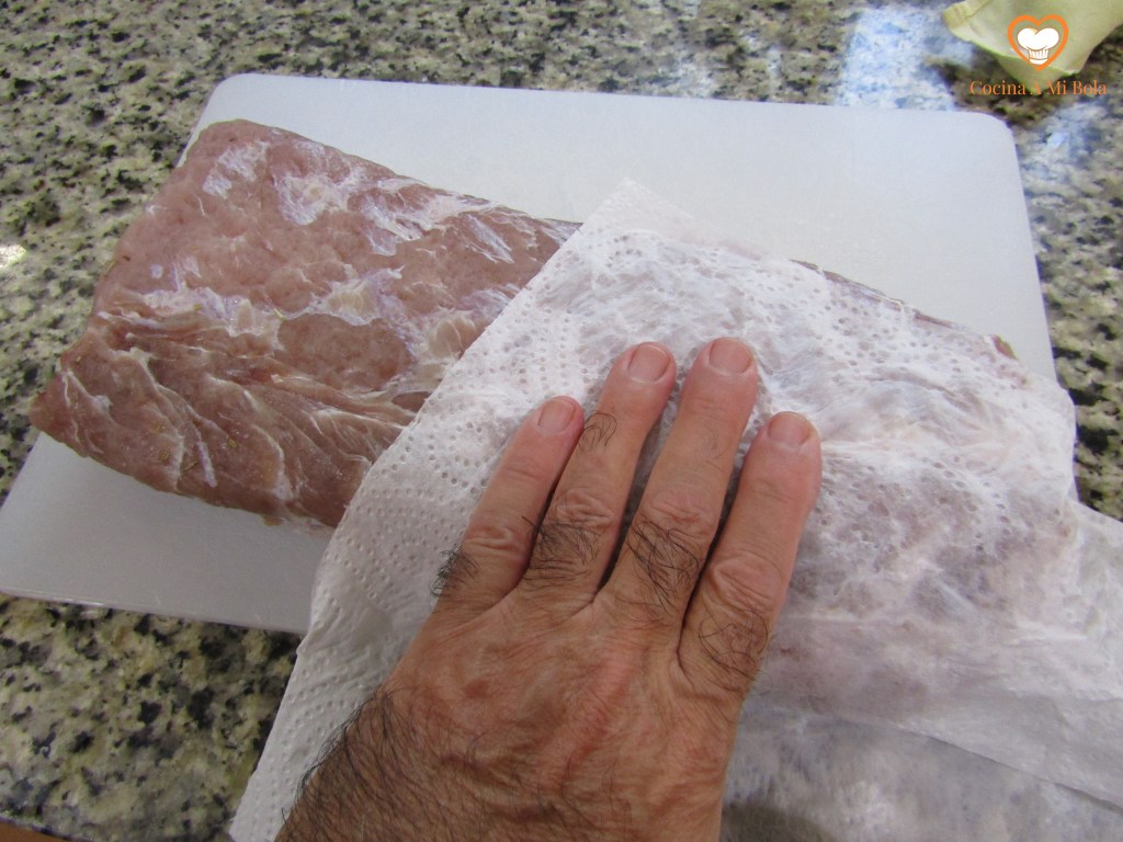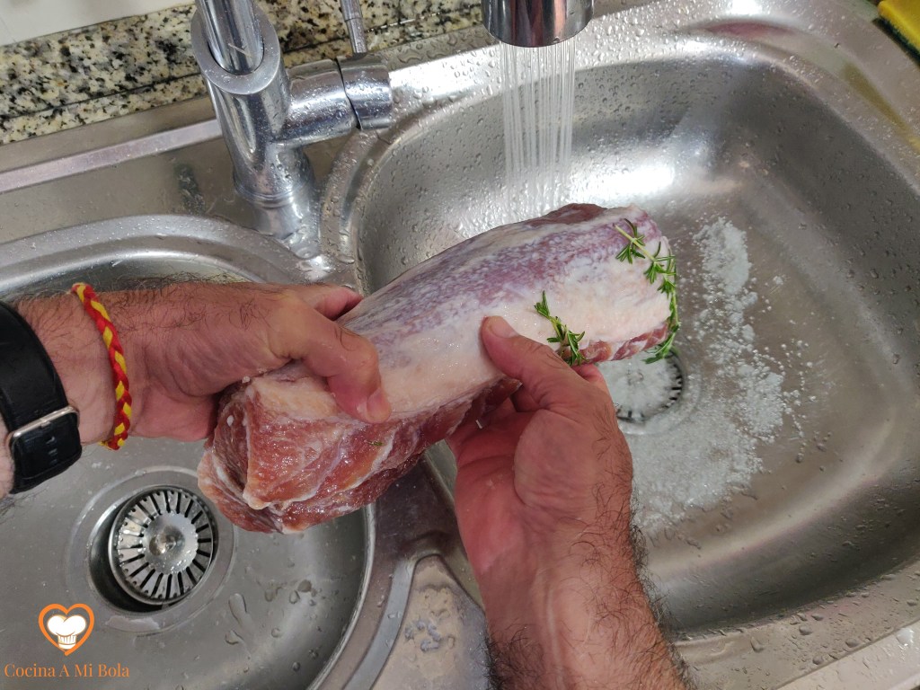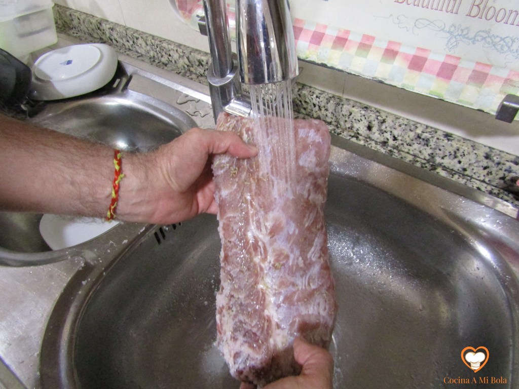 SEGUNDO.- Sácalo de la nevera, retira la sal y lávalo bien. Sécalo aún mejor porque, como ya advertía en el proceso del lomo embuchado, de un secado defectuoso de la carne depende mucho que se estropee y tengas que tirarlo.