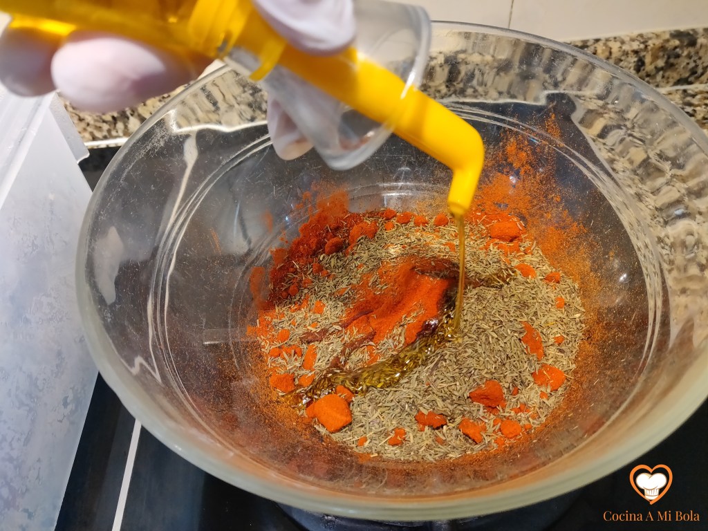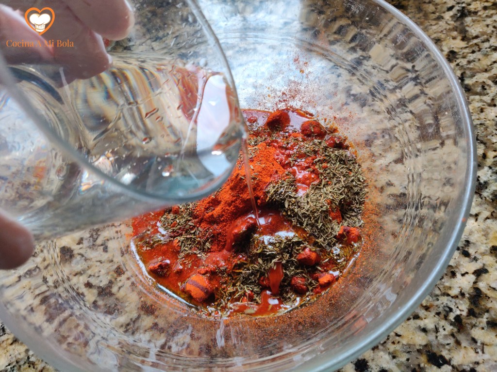 Y mientras tanto, prepararemos el adobo en un bol a base de dos cucharadas soperas de pimentón dulce, dos cucharadas soperas de pimentón ahumado, 1 cucharada sopera de tomillo, 1 cucharadita rasa de comino y mezcla todo muy bien de forma que se reparta todo de un modo uniforme y los pimentones no hagan grumos secos, tal y como me ha ocurrido a mí, si te fijas en las fotos. Si lo haces bien desde el principio, te ahorrarás el trabajo adicional que supone deshacerlo después. Ahora añade poco a poco el aceite mientras remueves. Y cuando se haga un “barro impracticable”, añade despacio agua mientras sigues removiendo, hasta que sea un barro pastoso, como fango. Comprendo que el símil no es muy culinario, pero refleja bastante bien lo que quiero expresar.