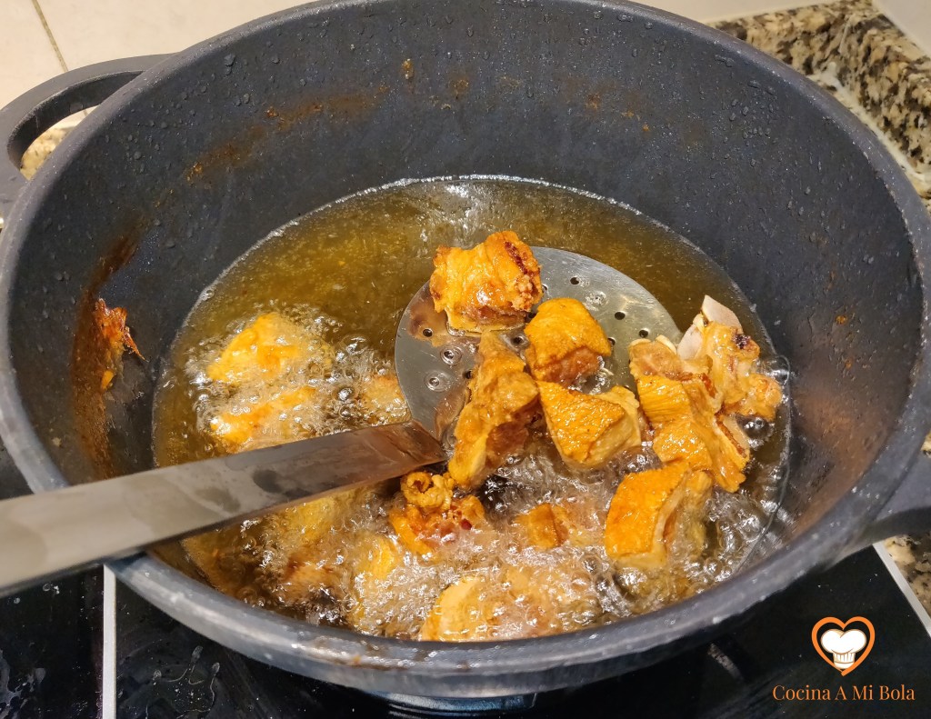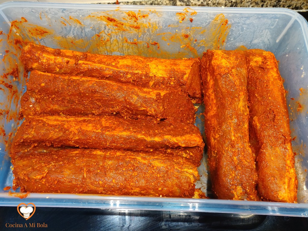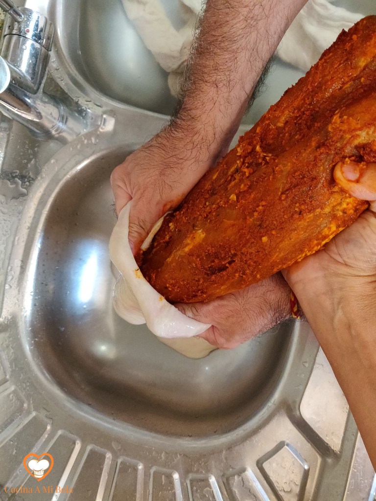 SÉPTIMO.- Saca la carne, y tal y como hiciste con el ajo, elimina la mayor cantidad de adobo que puedas con la mano. Se trata de que quede con una ligera cantidad en toda su superficie, pero tampoco se te vaya a ocurrir lavarlo.