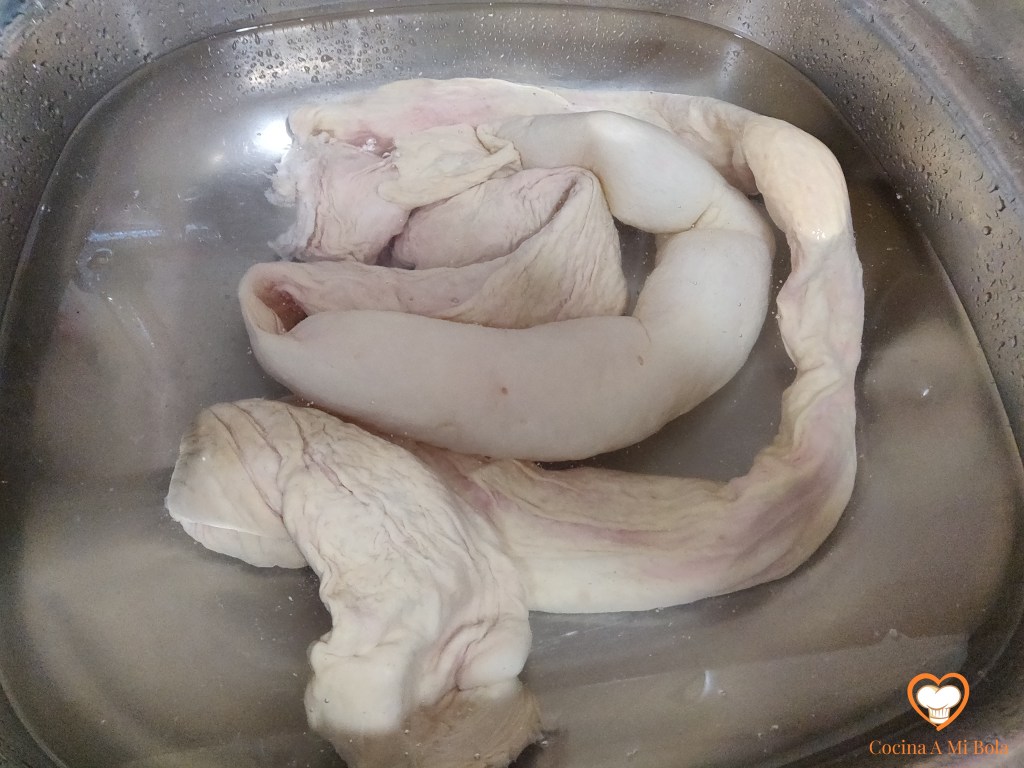 Sácala de su bolsa y lávala con agua tibia (no fría). Llénala y vacíala varias veces a base de cerrar un extremo y el otro, para eliminar la sal y para que se despeguen y se deshagan pliegues y dobleces. Notarás cómo poco a poco se va rehidratando, aumentando de tamaño y adoptando una textura lisa y suave al tacto, bastante resbaladiza. Llena el fregadero con agua tibia y déjala que termine de rehidratarse y dilatar durante unos 40 minutos aproximadamente, tras lo cual, vacía el agua y procura que se seque lo más posible en su interior, pero sin hacer nada especial que no sea abrir sus extremos y que circule el aire.
