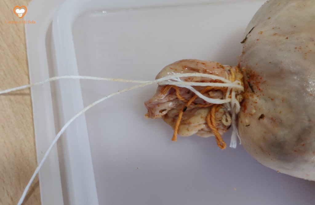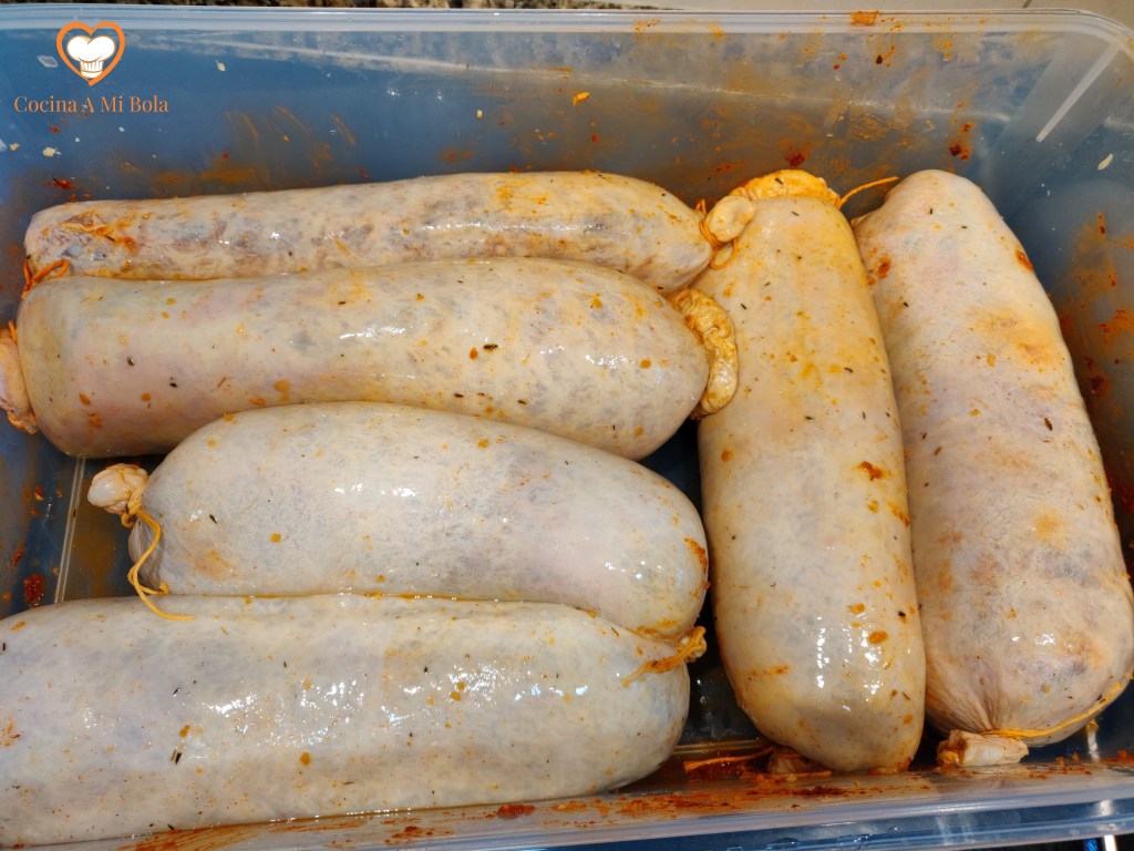 Como puedes ver en las fotos, en una sola tripa caben tres medios lomos, lo que significa que no hubiera sido preciso cortarlo por la mitad, ¿verdad?. Pero el problema no estaba ahí, sino en las dimensiones del tupper y el ancho de la nevera. Esto es cocina a mi bola, pero muy casera, y contamos con los medios normales…