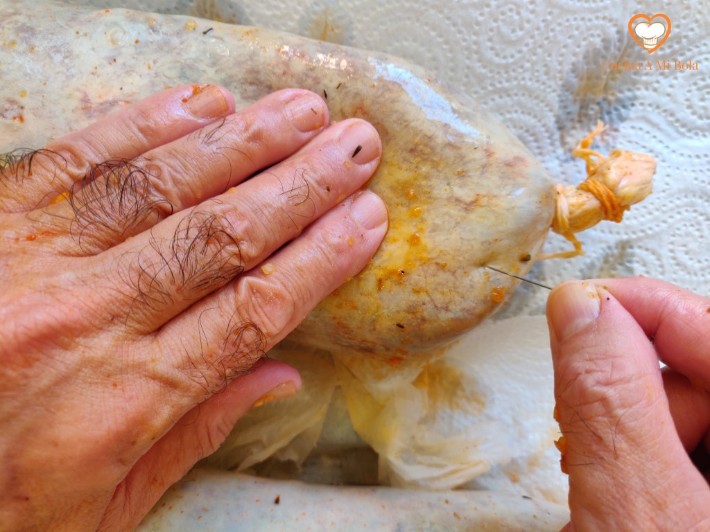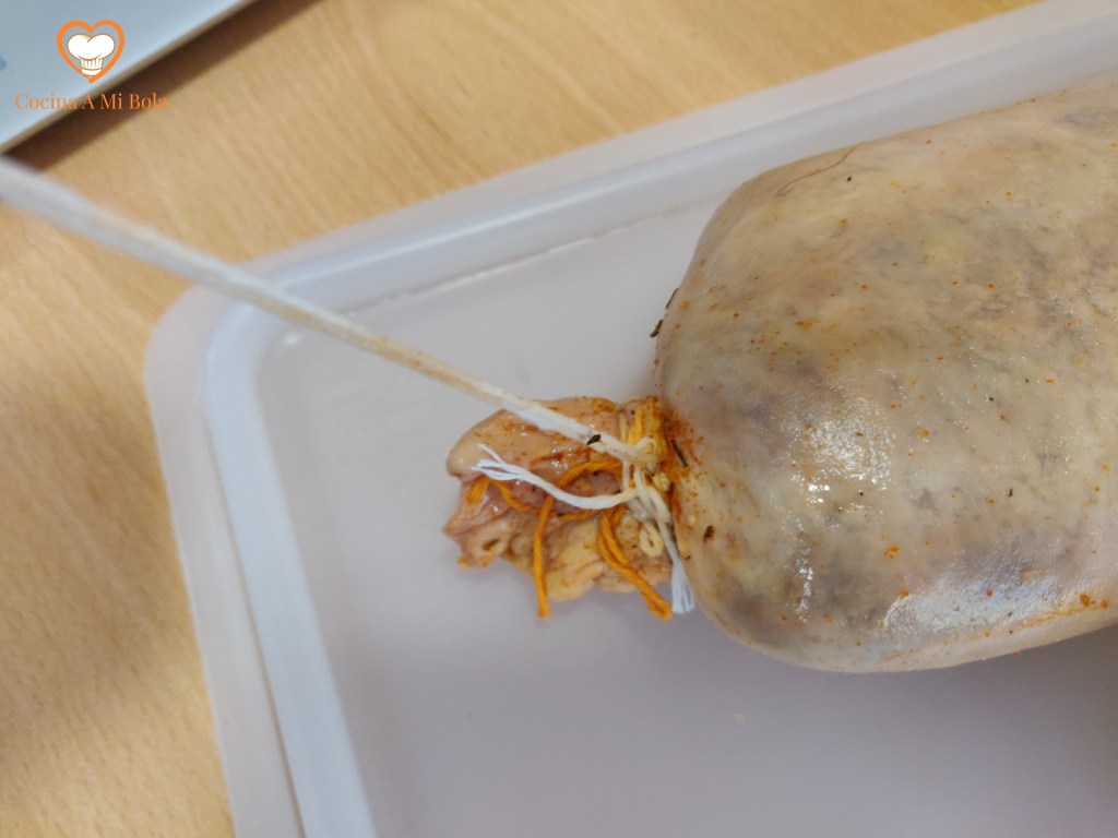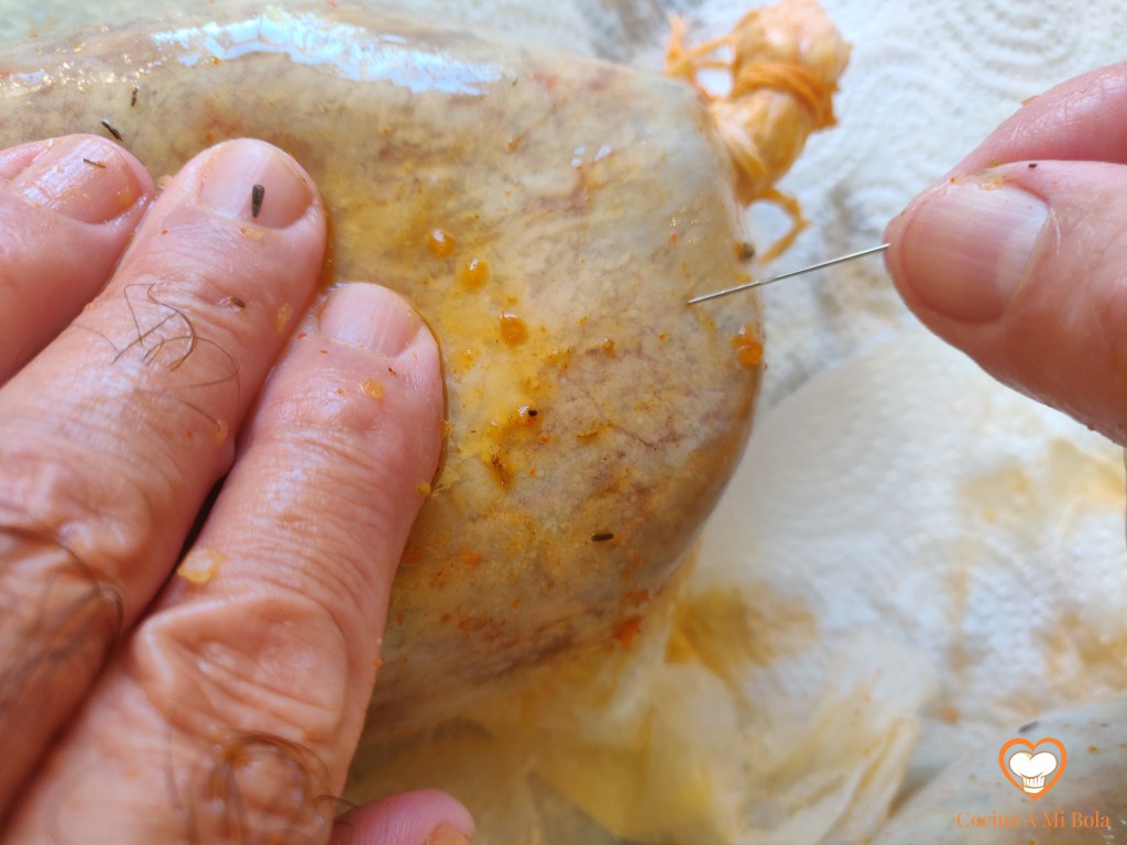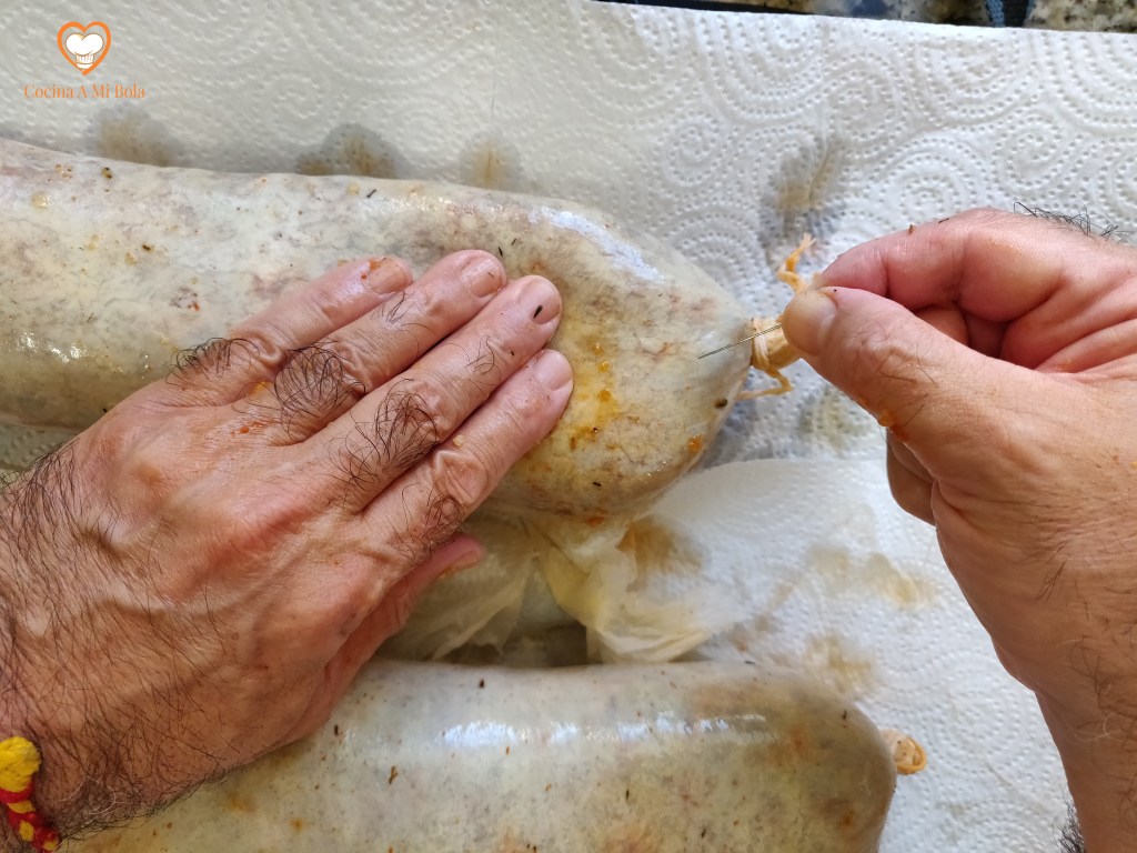 DÉCIMO.- La tripa irá dando de si mientras esté hidratada, así que enseguida empezarás a notar que debes ceñir de nuevo los nudos. Haz otros entre los antiguos y la carne, ciñéndote a ésta. Y ahora que ya está más tersa, viene la operación más importante en todo este proceso: hay que extraer el aire que, a modo de pequeñas burbujas, se han quedado dentro de la tripa. Para ello utilizaremos una aguja de coser, fina y bien desinfectada e iremos haciendo múltiples pinchazos a la tripa por todas partes, procurando localizar esas burbujas (no siempre evidentes) que se habrán formado, particularmente entre las rugosidades que tiene la forma de la carne. Presiona ligeramente acompañando el aire hacia su salida y normalmente, lo percibirás. Pero hazlo con meticulosidad porque ese aire podría ser la causa de que la carne se eche a perder. Verás que con una aguja fina no hay riesgo de rotura, así que cúrratelo un poco.