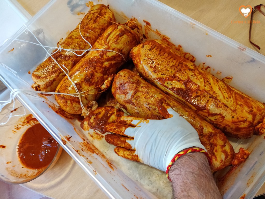 Frota ambas piezas ya entripadas con el resto del adobo. Tampoco hay que excederse, sólo impregnarlo por toda su superficie y ya estarán listos para iniciar su curación.