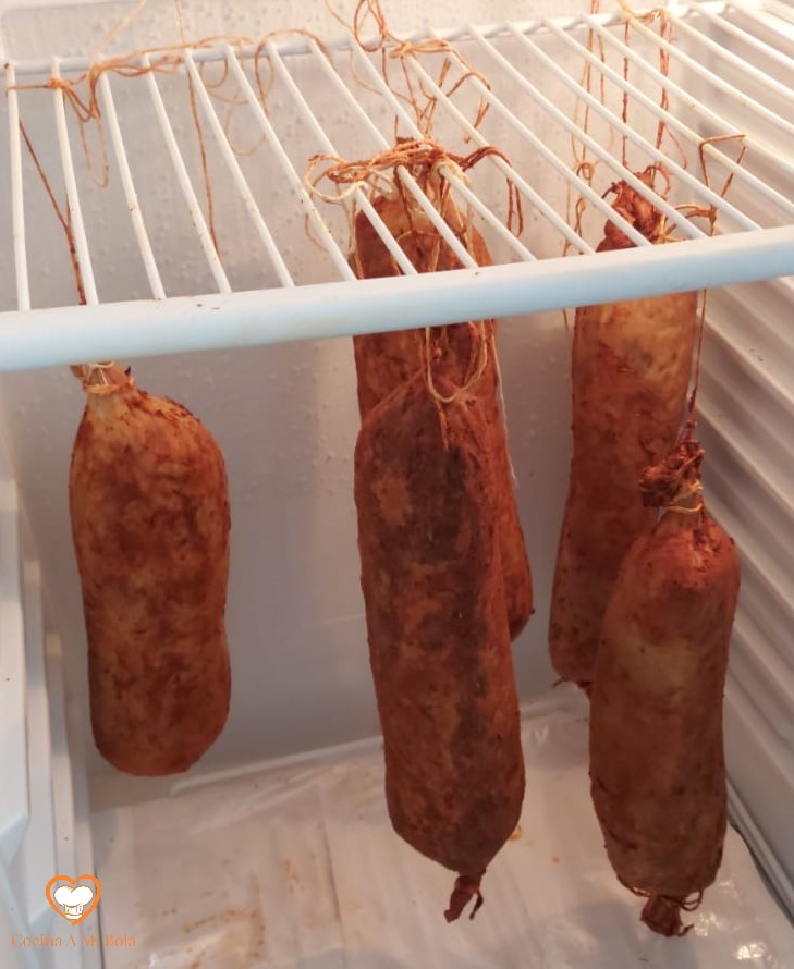De momento, todos van a la nevera, a unos 5-7ºC colgados con cordel de algodón. Mira la foto, porque no tiene más secreto, excepto el de poner el termostato al 50%, no vaya a ser que se nos congelen. Pero ten en cuenta que el proceso de curación y secado necesita baja temperatura, oscuridad y ambiente seco. ¿Qué quiere esto decir?. Pues que si andas abriendo la nevera cada día, lo único que estarás haciendo en meter humedad dentro. ¿Has visto la escarcha que se genera en una nevera si te dejas la puerta abierta cierto tiempo?. No abras la nevera y tendrás en menor índice de humedad posible. Es cierto que el secado requiere de ventilación (seca) y la humedad que los lomos van a expulsar, debería salir de algún modo. Bueno, pues desde mi punto de vista, la humedad que desprendan un par de lomos o tres, o cinco o seis… retenida y dispersa en una nevera (pero ya fuera de la carne), no afectará tanto al secado de éstos como si estás abriendo la puerta con frecuencia. Te costará, pero una vez colgados los lomos en la nevera, no la abras hasta pasados 7 días como mínimo. Y tras ello, hazlo sólo una vez cada semana. Huélelos y verás que se están curando bien.