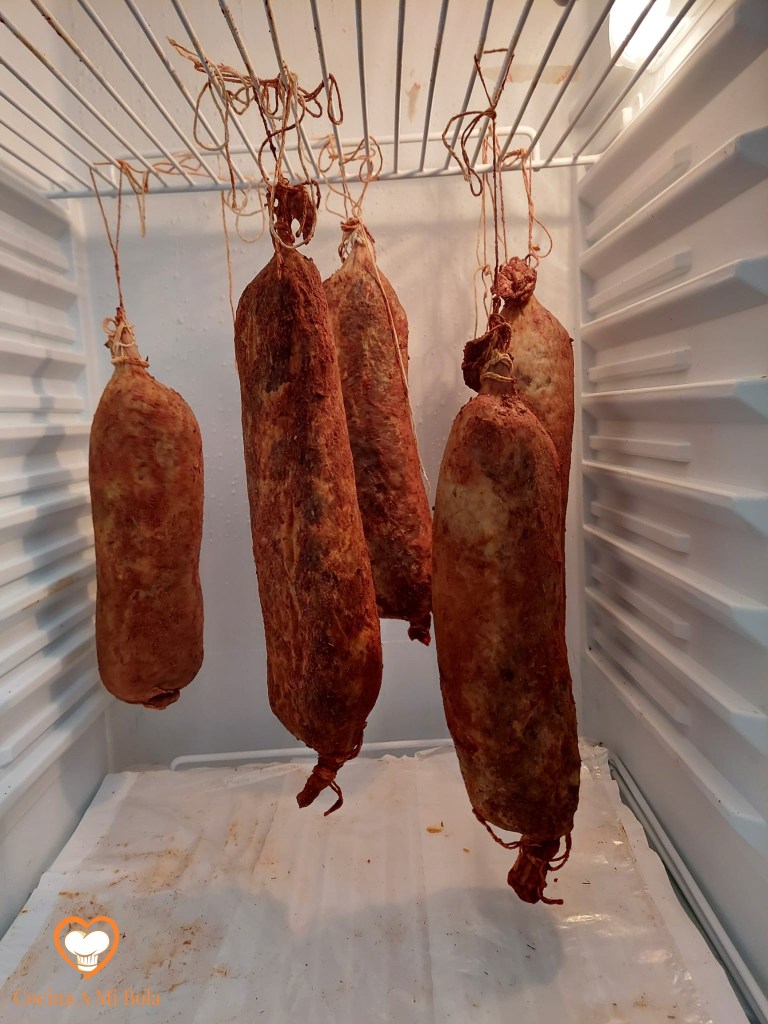 DECIMOCUARTO.- Tras 63 días en nevera (9 semanas), hice la primera prueba y abrí dos. Muy buen resultado, aunque estaba algo menos curado que el de la sierra y de aroma y sabor algo menos intensos. Nada de moho.