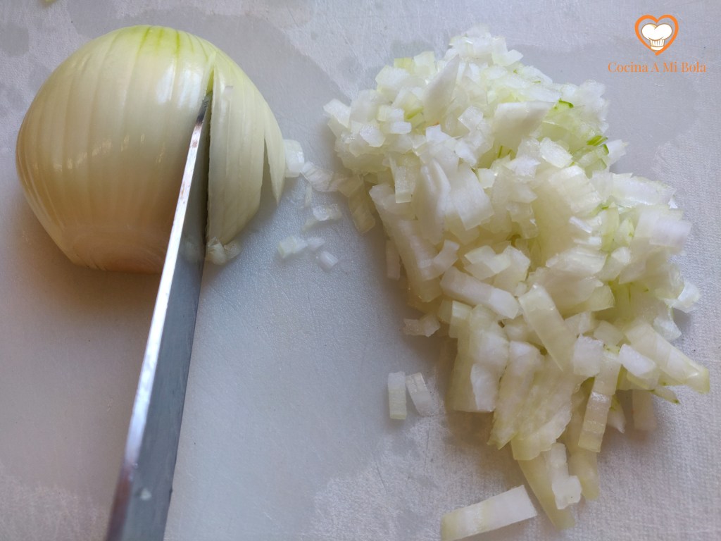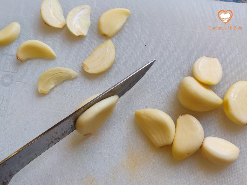 CUARTO.- Pelamos y picamos los dientes de ajo y los frotamos con las manos por toda la pieza. Lo volvemos a guardar en el recipiente tapado y éste a la nevera durante 2 horas.