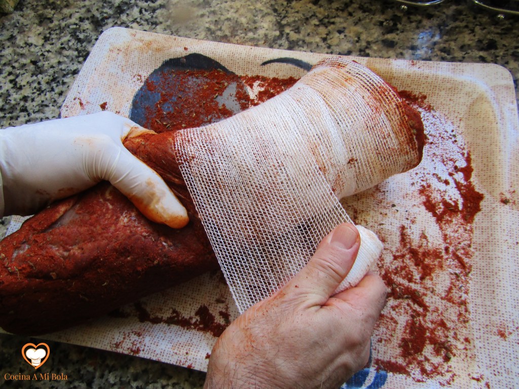 CUARTO.- Envuelve la carne en venda de algodón (sin elásticos). Hazlo hasta que no se deje entrever su color rojo del aliño seco. Cíñela bastante procurando dar forma redondeada a la pieza que, de por sí, es ovalada.