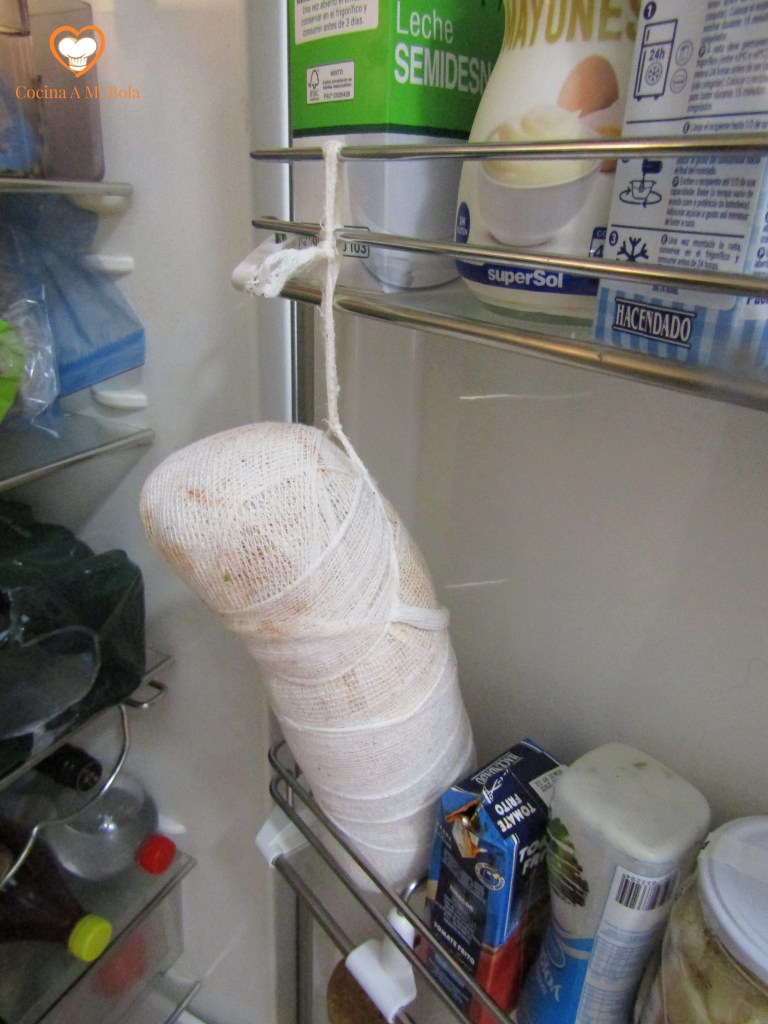 Si se te ocurre la genialidad de hacer varios lomos a la vez, ten muy presente que necesitarás una nevera de tamaño mediano vacía para ello, porque lo suyo es colgarlos verticalmente para que el aire circule por todas partes y no se estropee la carne. Si sólo es uno, puedes buscarle un sitio vertical, por ejemplo en la puerta de la nevera o incluso tumbarlo apoyado sólo sobre dos vasitos puestos boca abajo y girándolo cada día para que se vaya curando por igual con plena circulación de aire por todas partes. Pues vamos allá!