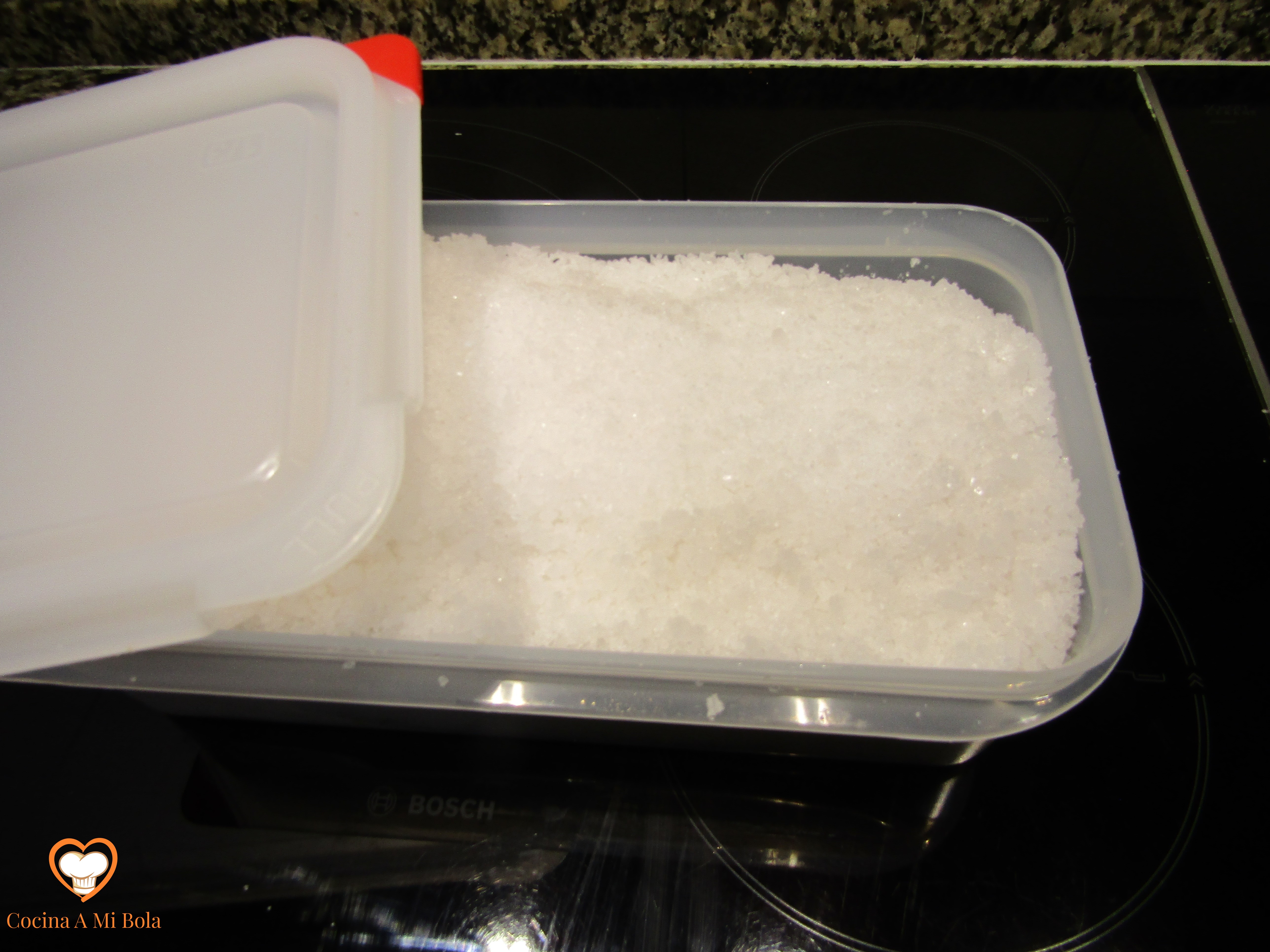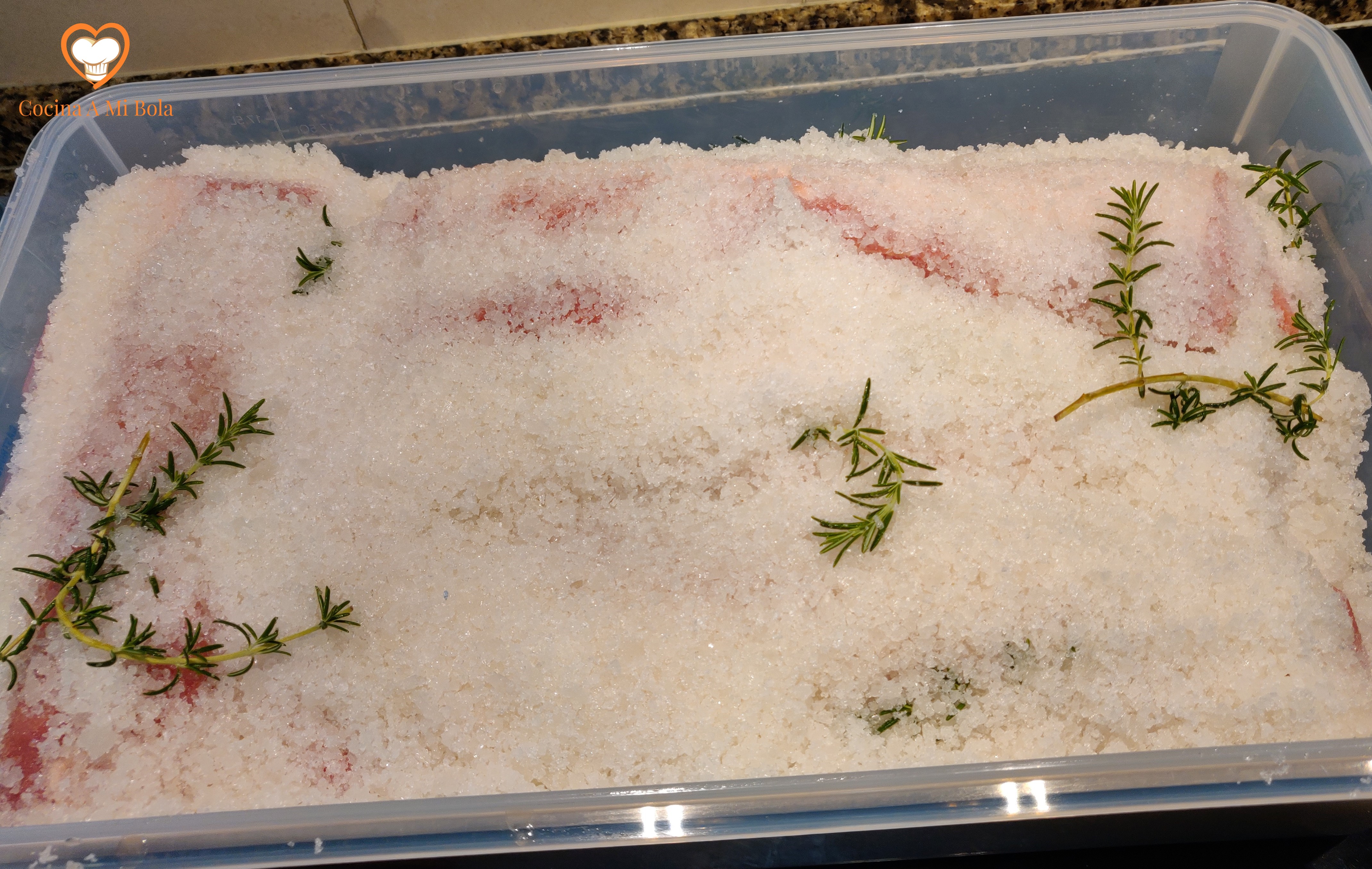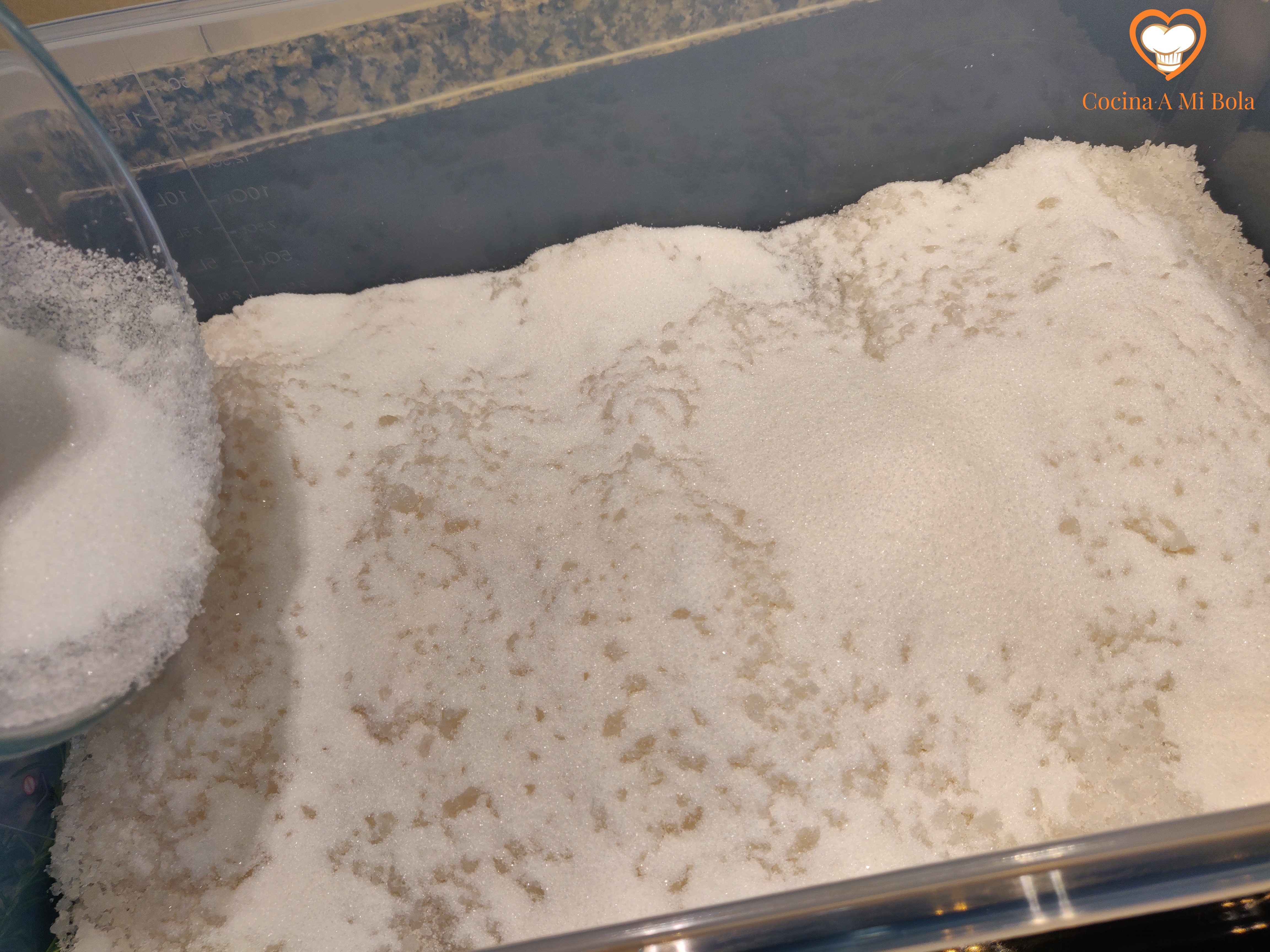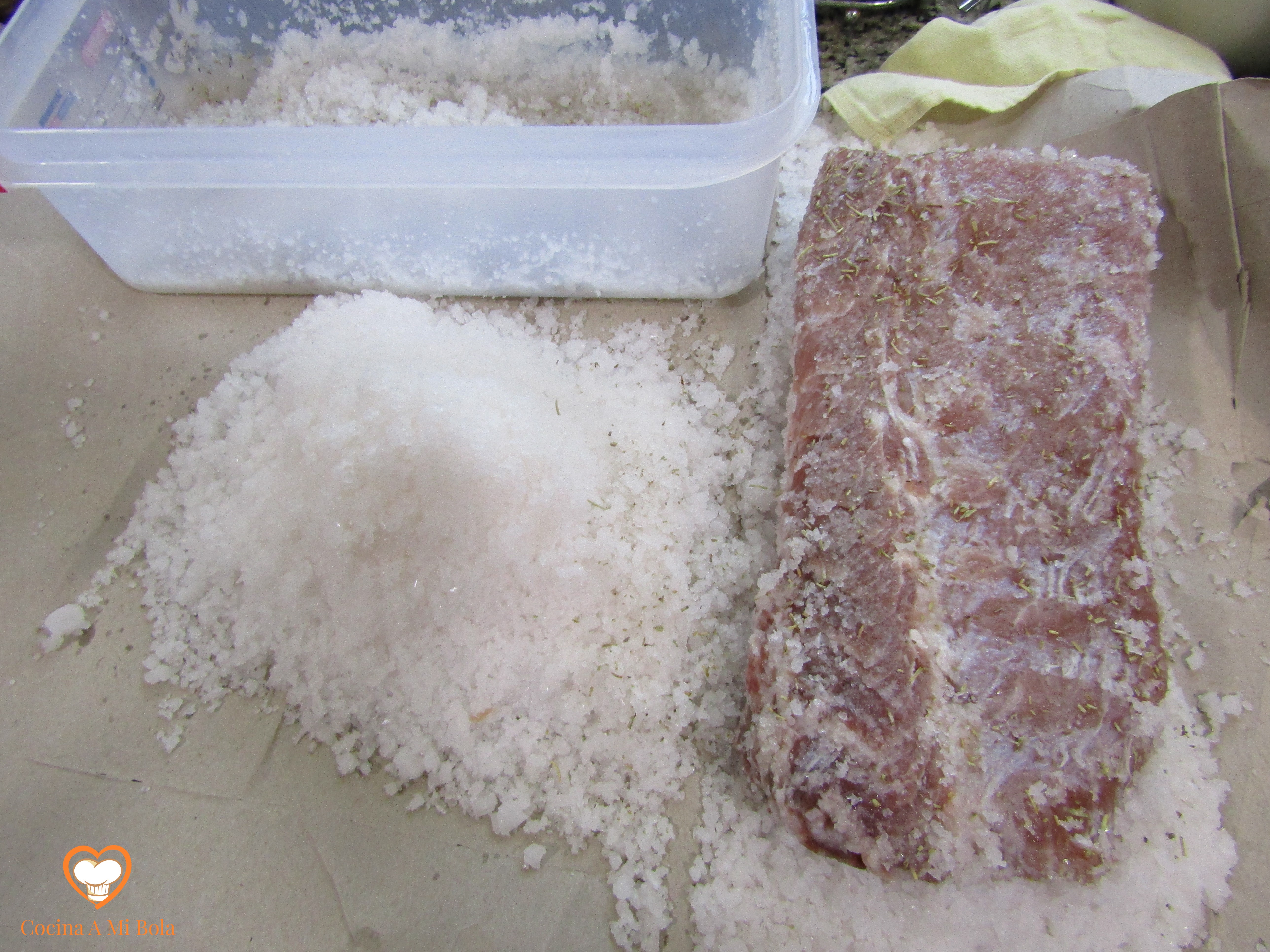 PRIMERO.- El procedimiento inicial es idéntico al embuchado. Lávalo, retira la grasa exterior si lo prefieres, y lo metemos en un recipiente con sal y azúcar en proporción 80/20. Puedes poner una ramita de romero fresco, mezclar con la sal un poco de romero seco o no poner nada. Cúbrelo y mételo en la nevera unas 18 horas. No lo tengas más tiempo porque te arriesgas a que esté muy salado.
