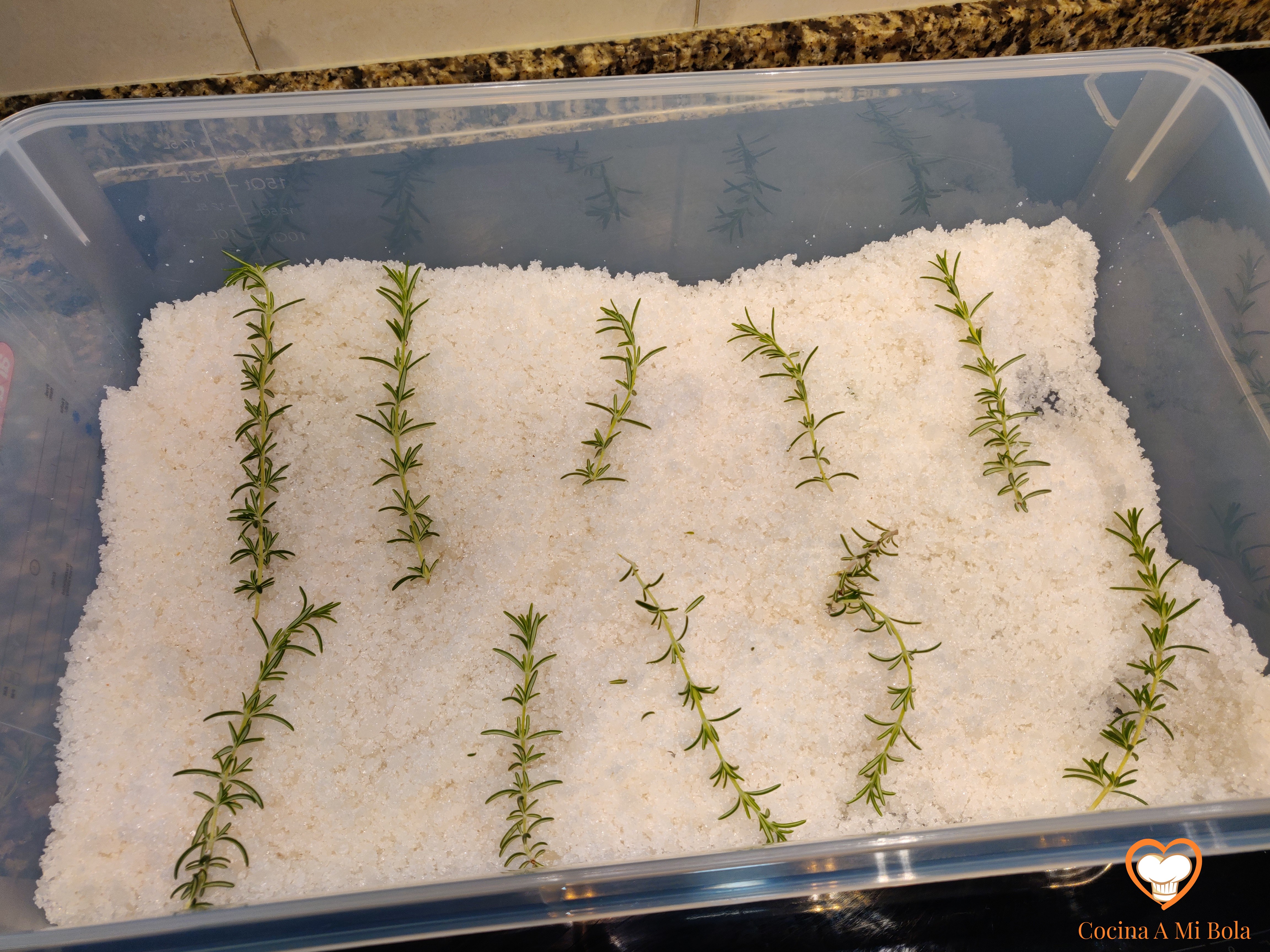 Cubre con esa mezcla de sal y azúcar en proporción 8:2 y cuando ya esté cubierta con un cm aproximadamente, coloca las ramitas de romero y continúa cubriendo unos 2 ó 3 centímetros más. Si deseas un aroma más intenso a romero, ponlas en contacto con la carne. No ahorres en sal, porque es francamente barata. Tapa el recipiente y mételo en el frigorífico durante unas 18 ó 20 horas. No excedas estos tiempos porque corres el riesgo de que queden salados y eso sólo lo sabrás cuando lo pruebes dentro de unas cuantas semanas.