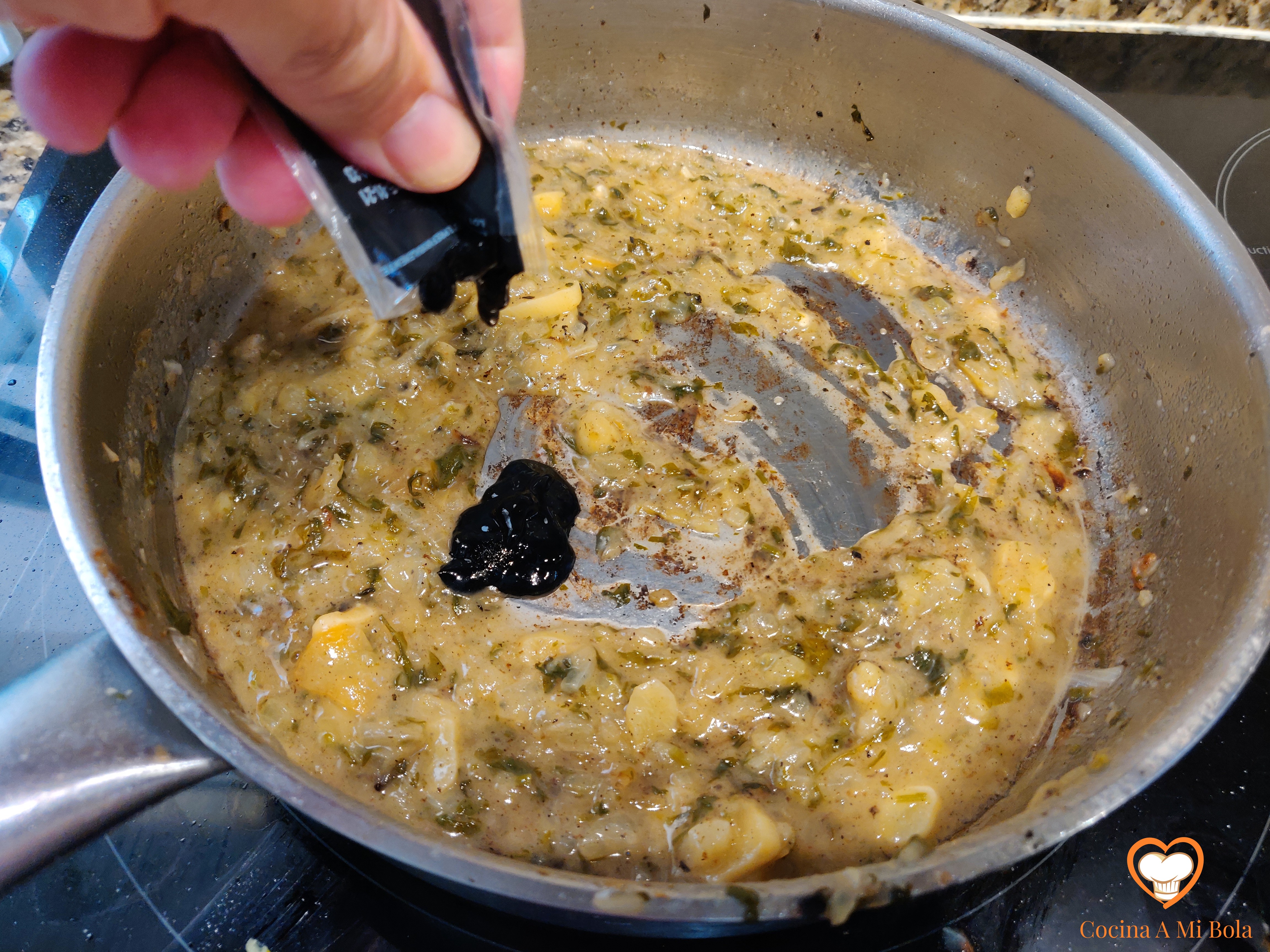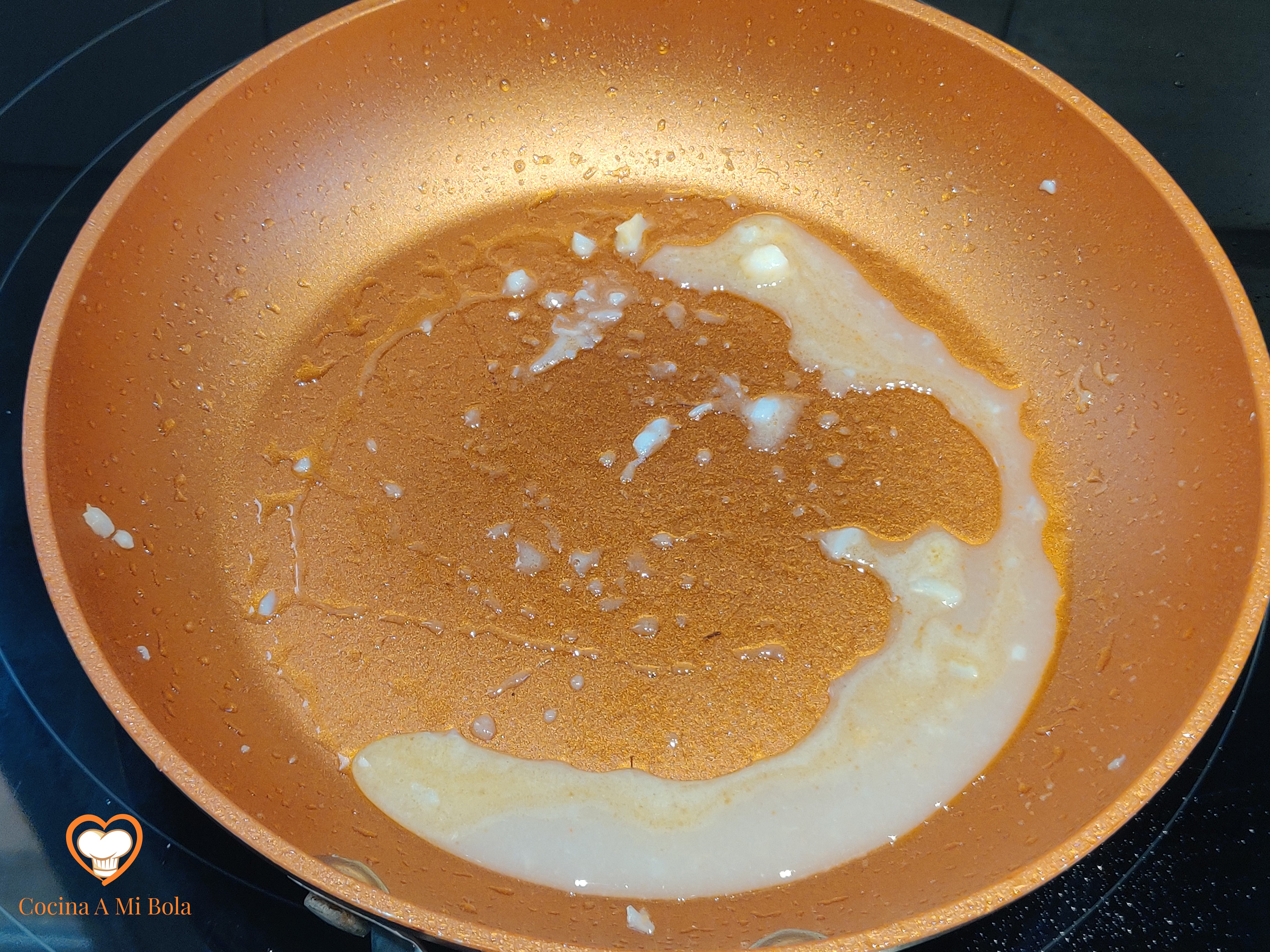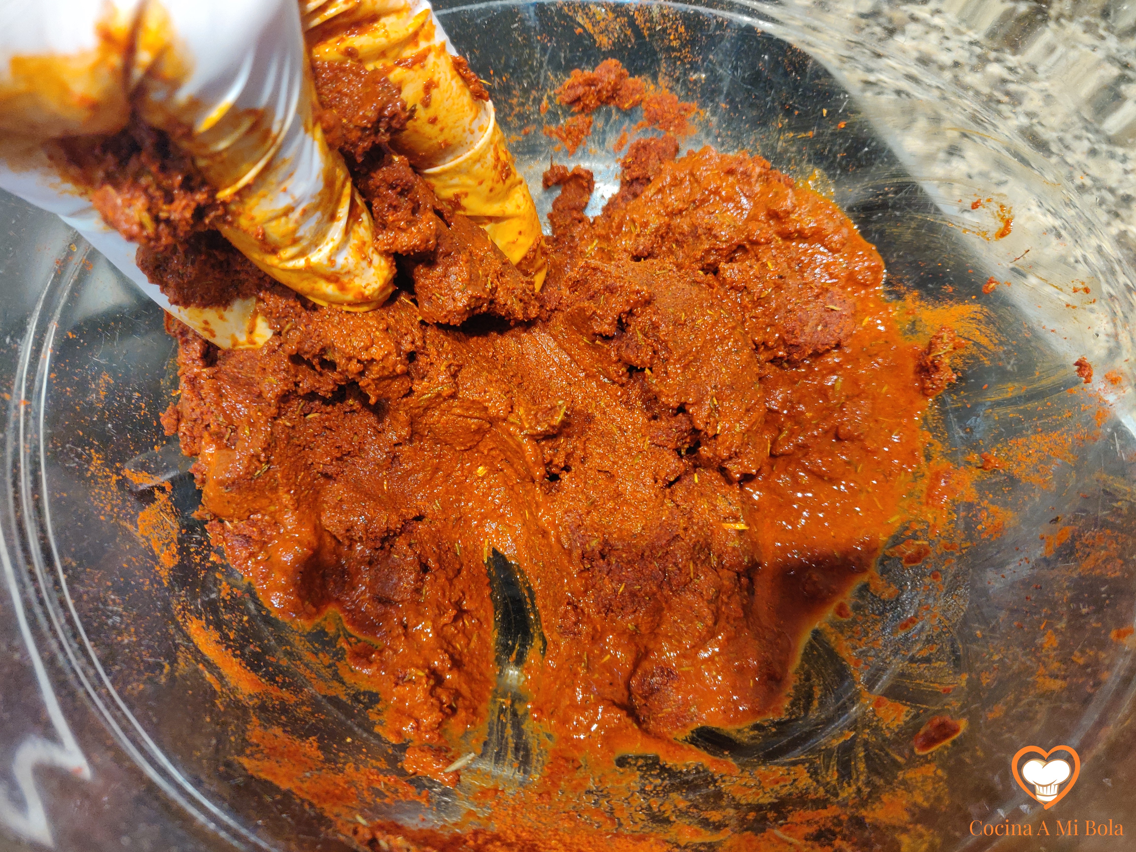 Y mientras tanto, prepararemos el adobo en un bol a base de dos cucharadas soperas de pimentón dulce, dos cucharadas soperas de pimentón ahumado, 1 cucharada sopera de tomillo, 1 cucharadita rasa de comino y mezcla todo muy bien de forma que se reparta todo de un modo uniforme y los pimentones no hagan grumos secos, tal y como me ha ocurrido a mí, si te fijas en las fotos. Si lo haces bien desde el principio, te ahorrarás el trabajo adicional que supone deshacerlo después. Ahora añade poco a poco el aceite mientras remueves. Y cuando se haga un “barro impracticable”, añade despacio agua mientras sigues removiendo, hasta que sea un barro pastoso, como fango. Comprendo que el símil no es muy culinario, pero refleja bastante bien lo que quiero expresar.