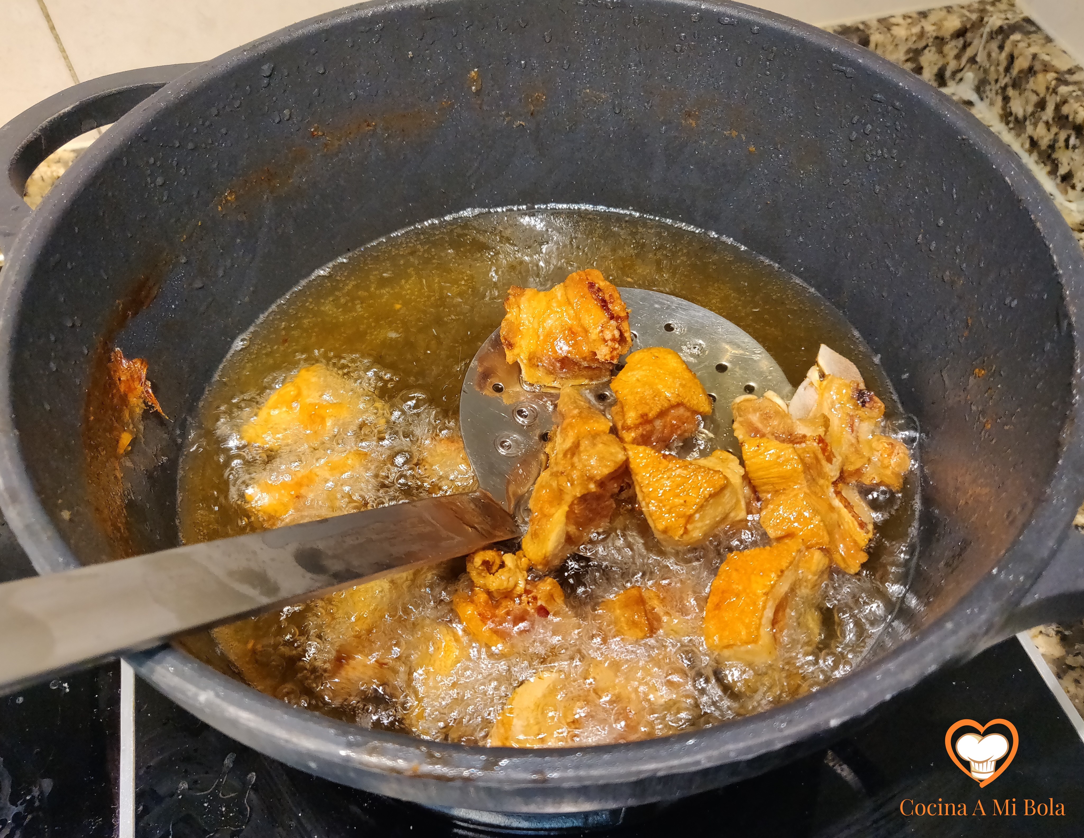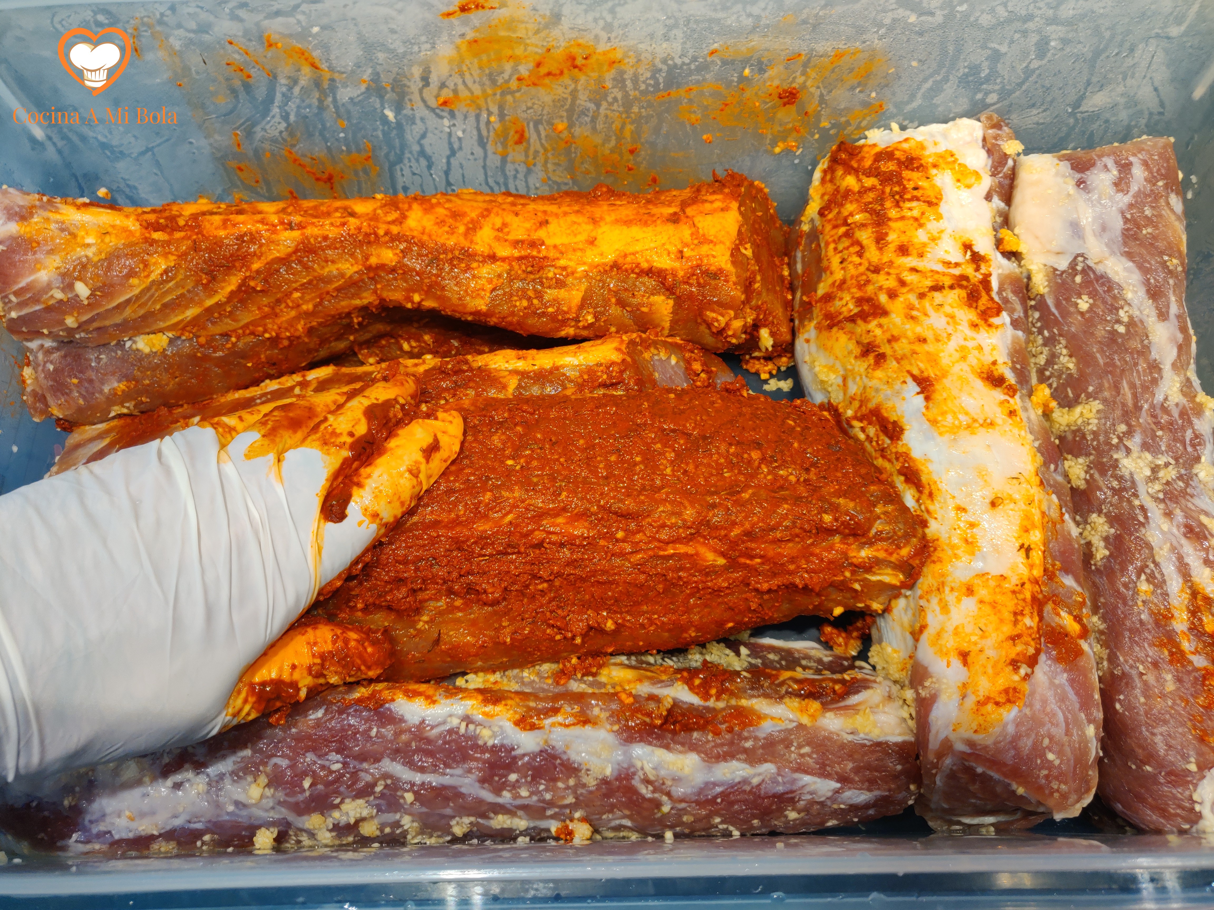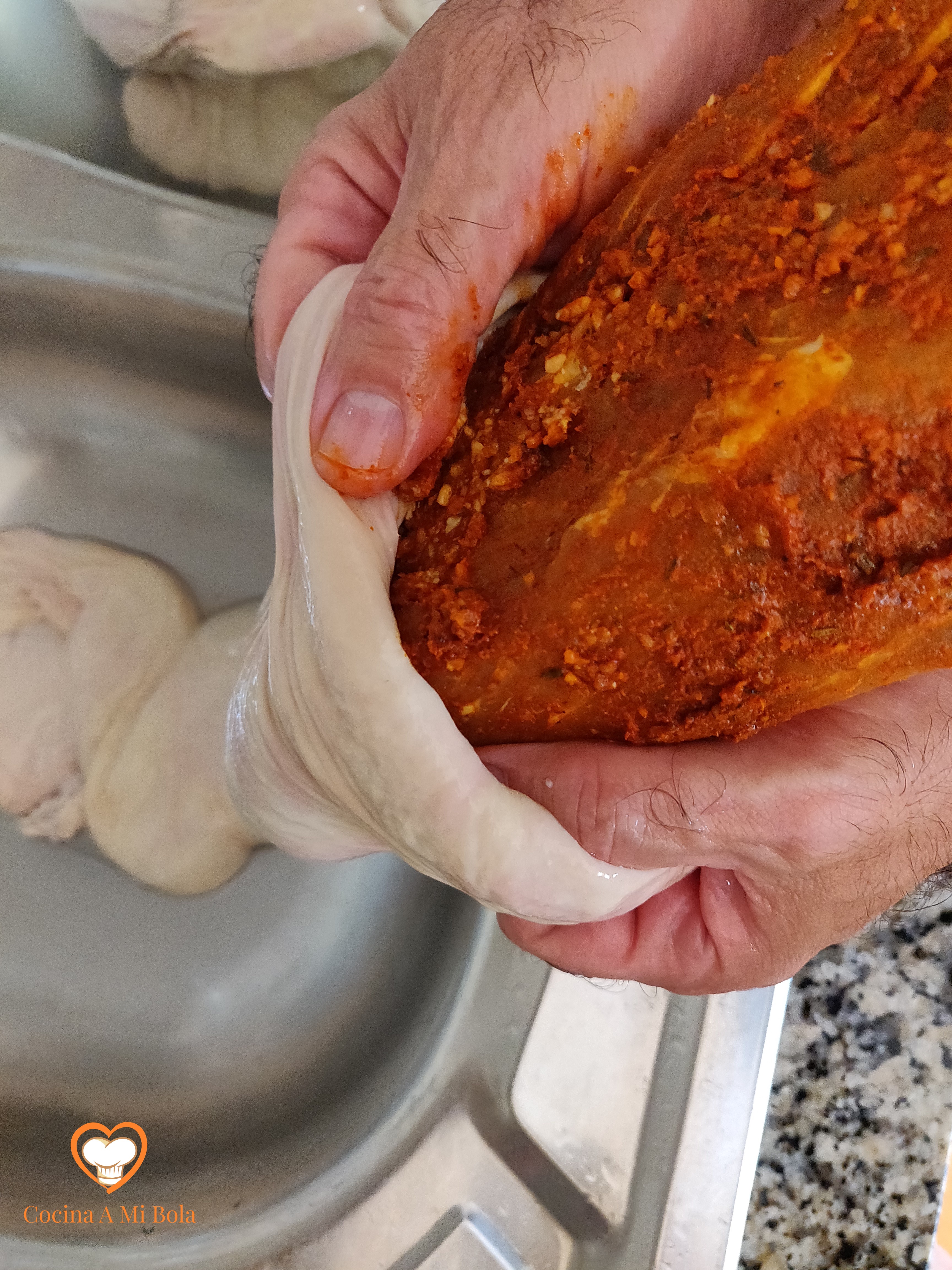 SÉPTIMO.- Saca la carne, y tal y como hiciste con el ajo, elimina la mayor cantidad de adobo que puedas con la mano. Se trata de que quede con una ligera cantidad en toda su superficie, pero tampoco se te vaya a ocurrir lavarlo.
