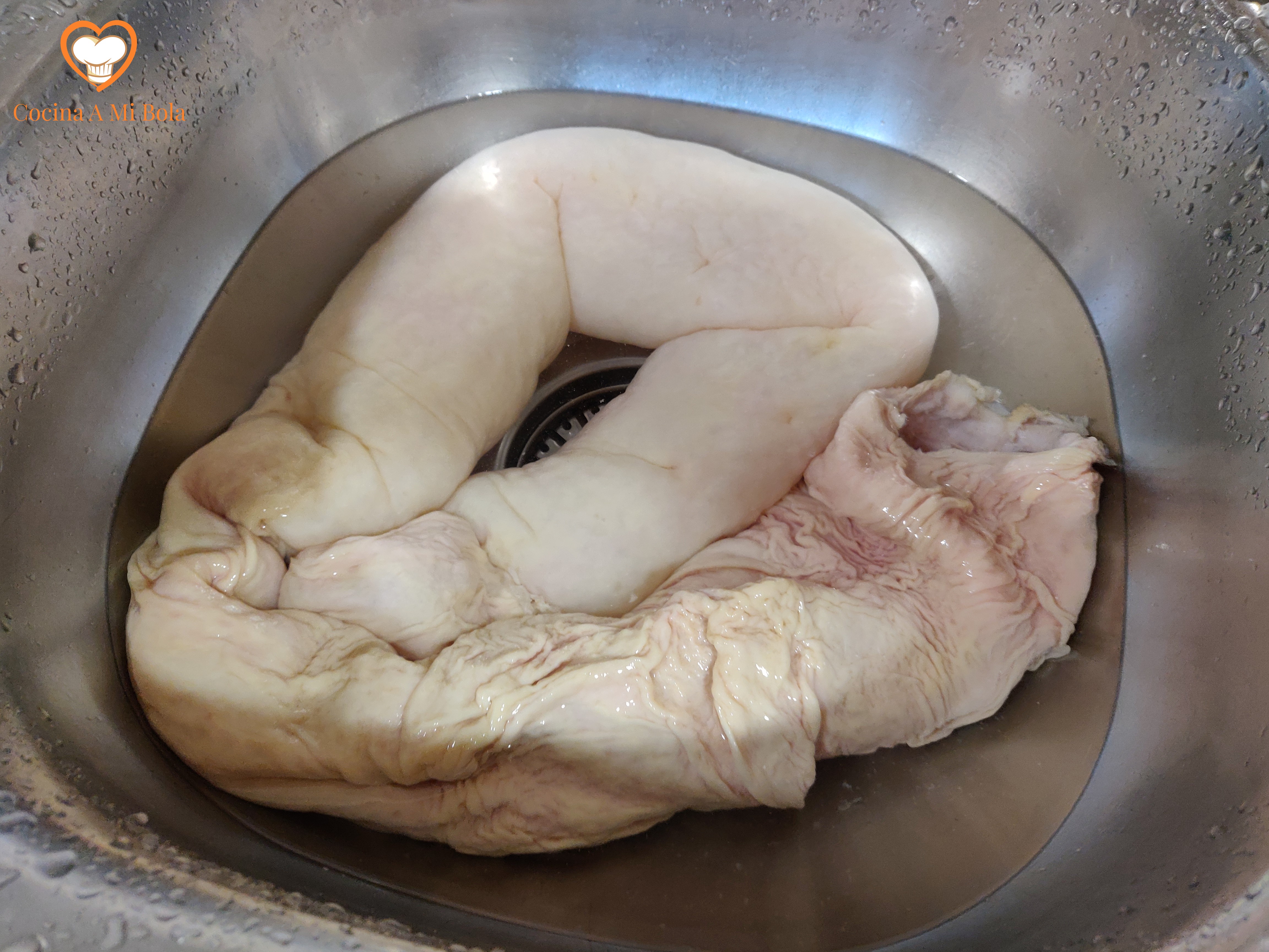 Sácala de su bolsa y lávala con agua tibia (no fría). Llénala y vacíala varias veces a base de cerrar un extremo y el otro, para eliminar la sal y para que se despeguen y se deshagan pliegues y dobleces. Notarás cómo poco a poco se va rehidratando, aumentando de tamaño y adoptando una textura lisa y suave al tacto, bastante resbaladiza. Llena el fregadero con agua tibia y déjala que termine de rehidratarse y dilatar durante unos 40 minutos aproximadamente, tras lo cual, vacía el agua y procura que se seque lo más posible en su interior, pero sin hacer nada especial que no sea abrir sus extremos y que circule el aire.