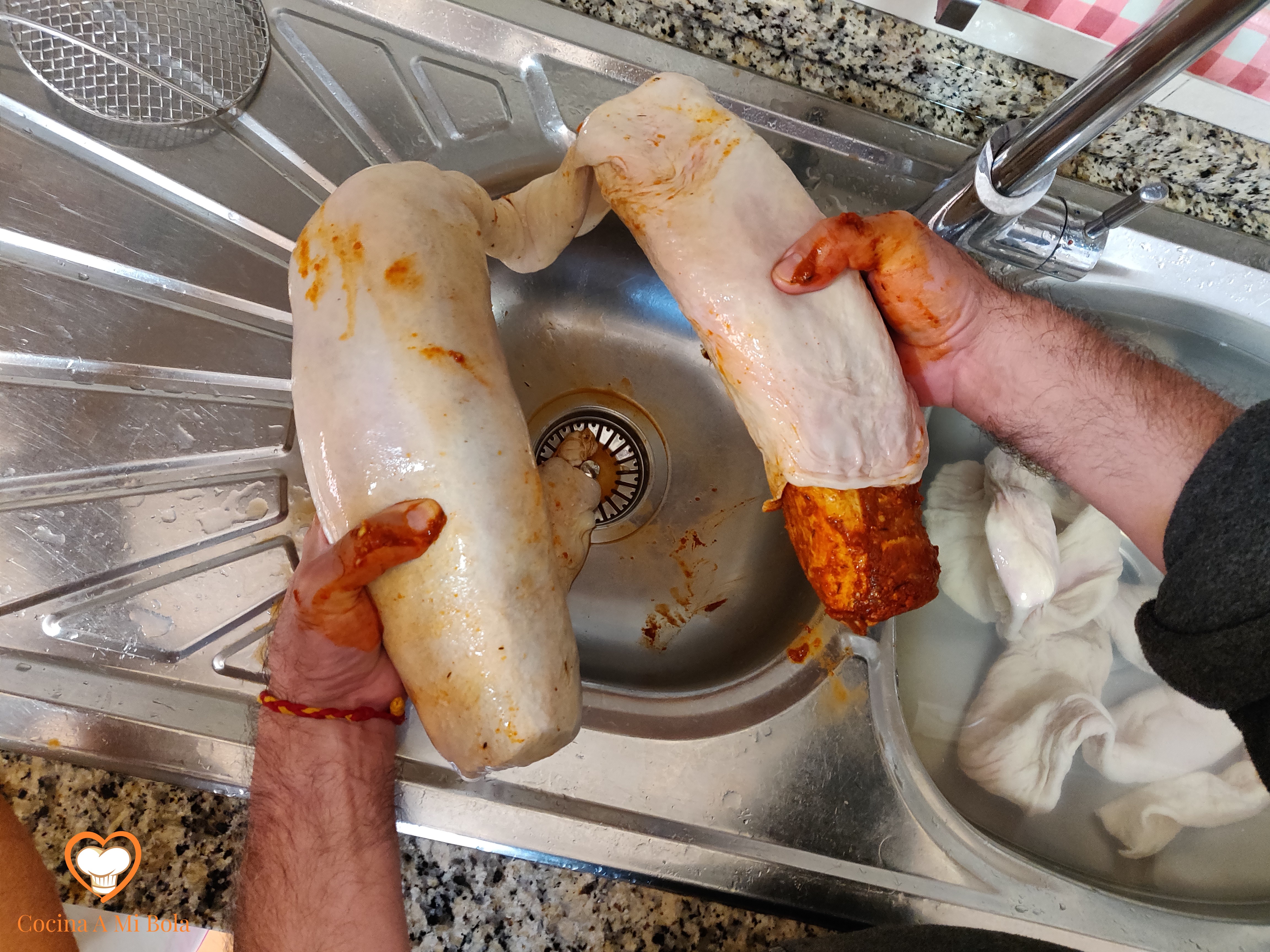 Una vez lavadas y seguros de que no les queda sal adherida, hay que secarlas muy bien con papel de cocina absorbente. Esta operación es esencial para que la carne no se te estropee. Sé concienzudo, especialmente en los pliegues, para erradicar cualquier resto de humedad.