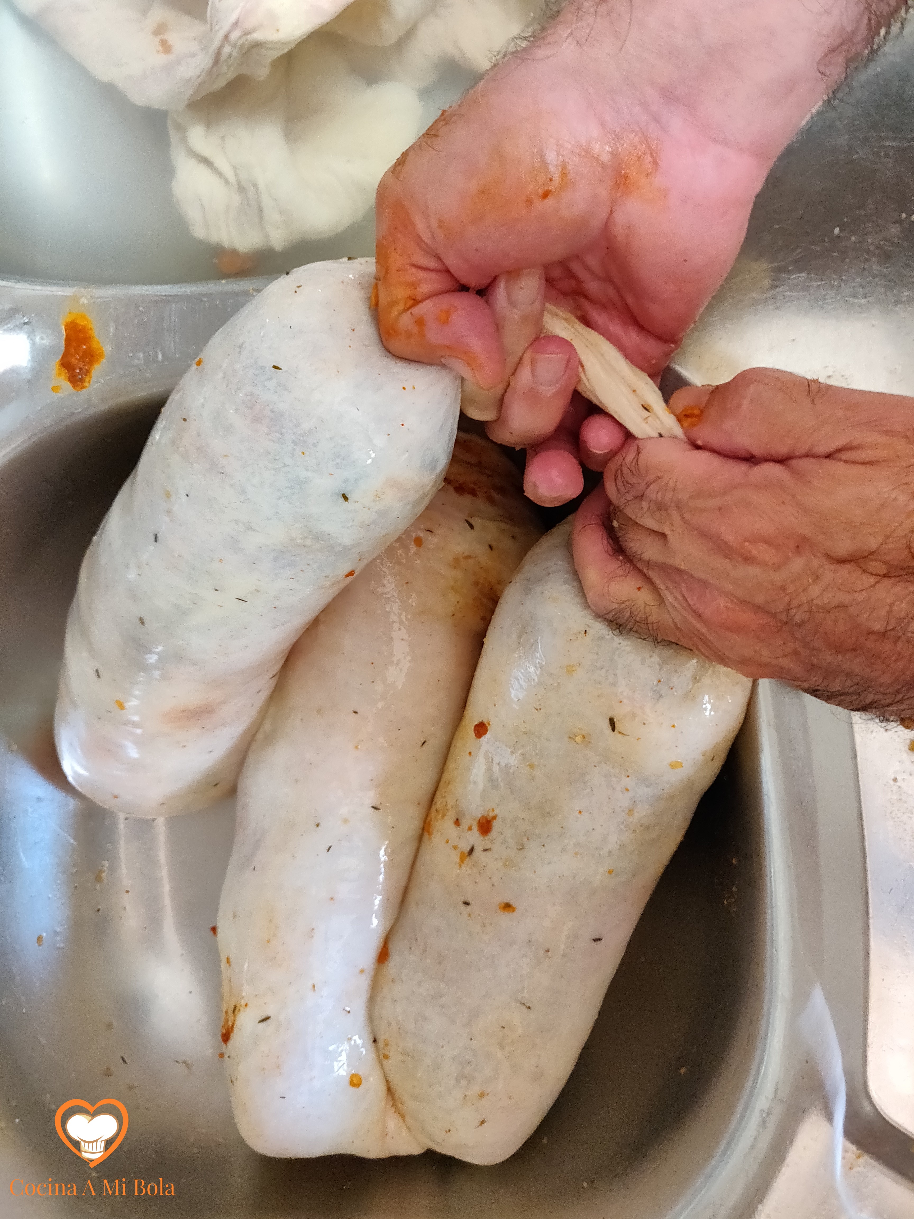 DÉCIMO.- La tripa irá dando de si mientras esté hidratada, así que enseguida empezarás a notar que debes ceñir de nuevo los nudos. Haz otros entre los antiguos y la carne, ciñéndote a ésta. Y ahora que ya está más tersa, viene la operación más importante en todo este proceso: hay que extraer el aire que, a modo de pequeñas burbujas, se han quedado dentro de la tripa. Para ello utilizaremos una aguja de coser, fina y bien desinfectada e iremos haciendo múltiples pinchazos a la tripa por todas partes, procurando localizar esas burbujas (no siempre evidentes) que se habrán formado, particularmente entre las rugosidades que tiene la forma de la carne. Presiona ligeramente acompañando el aire hacia su salida y normalmente, lo percibirás. Pero hazlo con meticulosidad porque ese aire podría ser la causa de que la carne se eche a perder. Verás que con una aguja fina no hay riesgo de rotura, así que cúrratelo un poco.