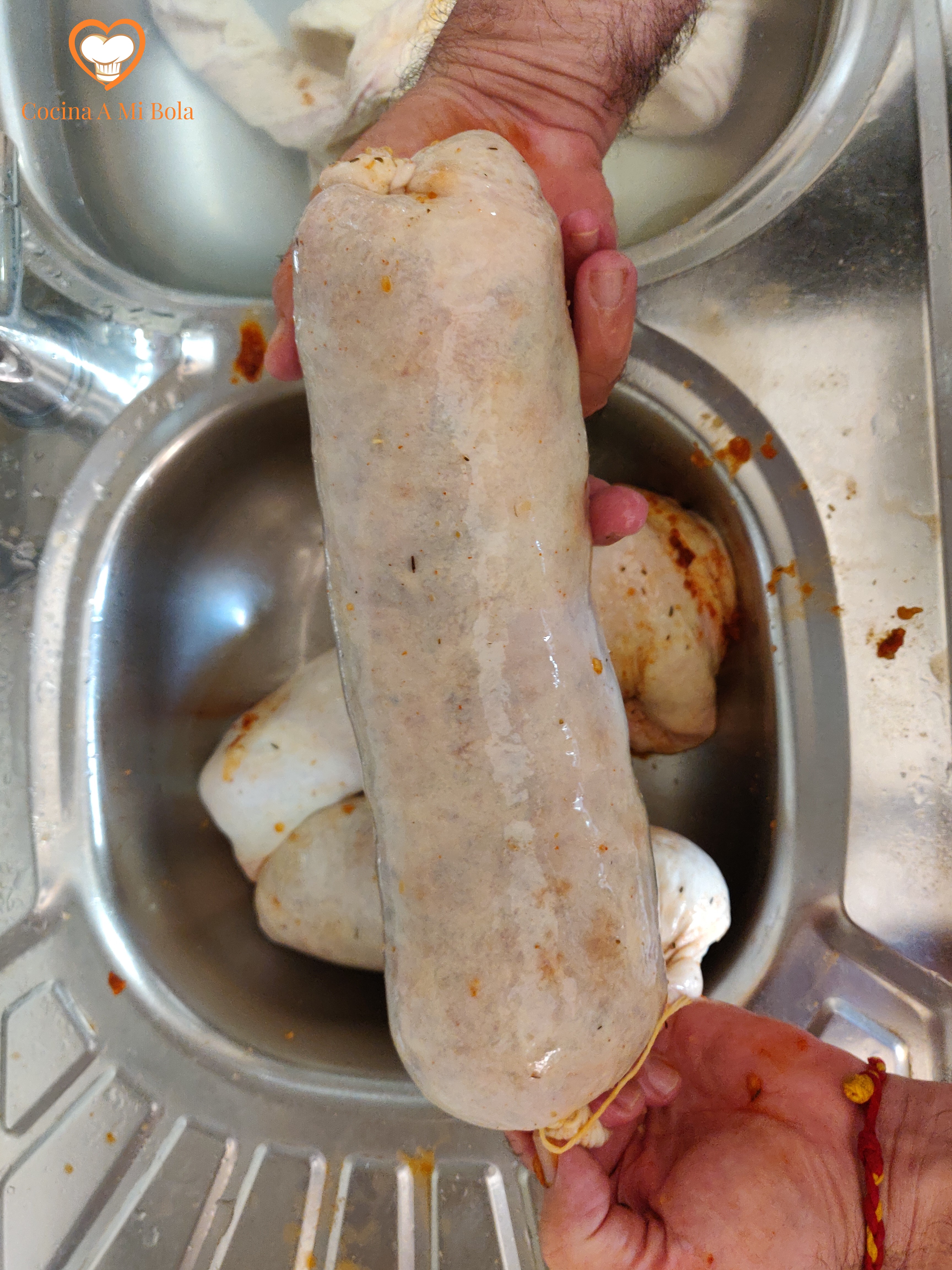 OCTAVO.- Ahora necesitarás ese par de manos bien limpitas, de manera que mientras uno sujeta la boca de la tripa con ambas manos manteniéndola lo más abierta posible, el otro introduce poco a poco la pieza de lomo. No utilices ningún instrumento ni utilices demasiada fuerza porque puedes rasgar o romper la tripa.