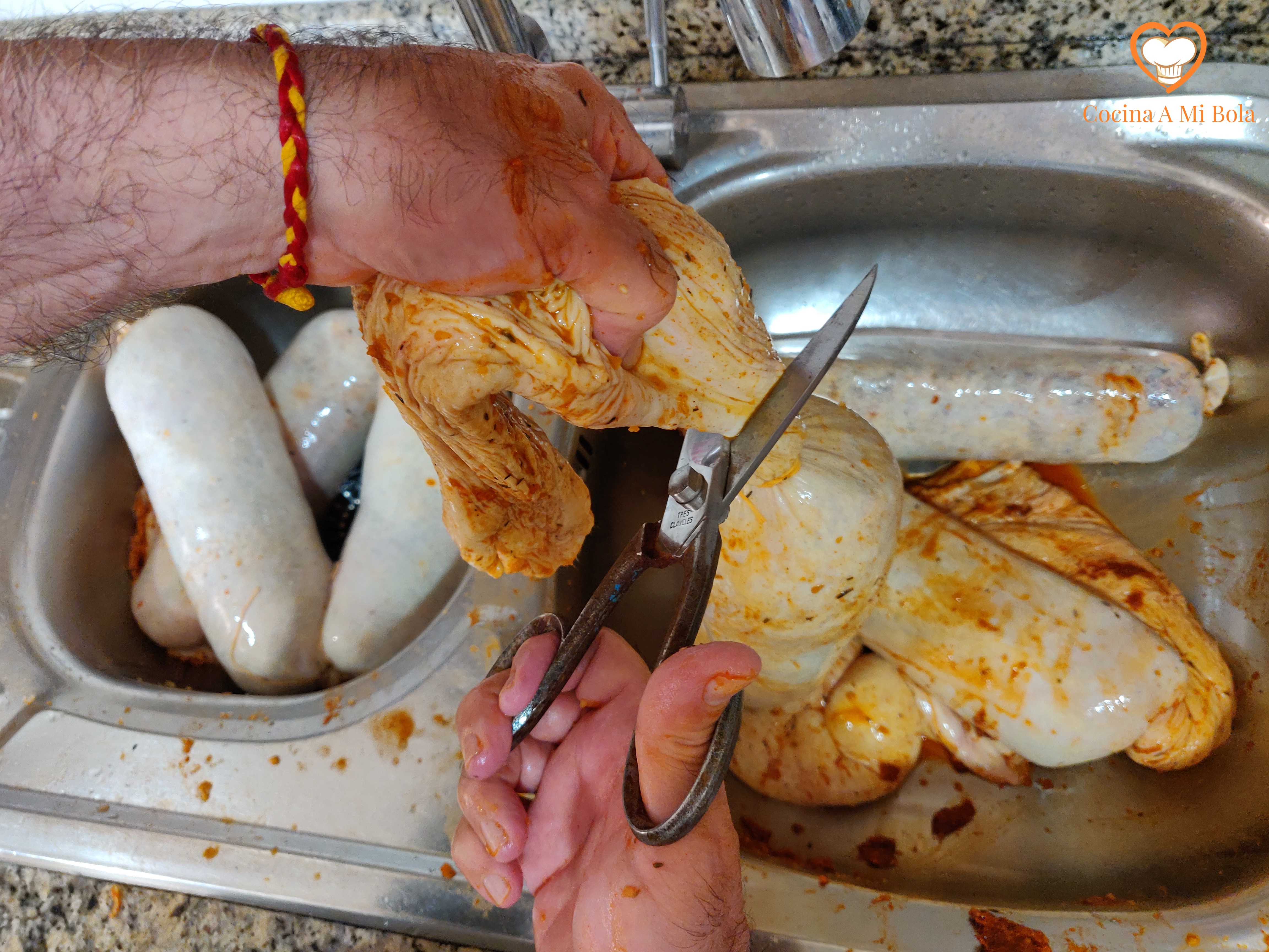Como puedes ver en las fotos, en una sola tripa caben tres medios lomos, lo que significa que no hubiera sido preciso cortarlo por la mitad, ¿verdad?. Pero el problema no estaba ahí, sino en las dimensiones del tupper y el ancho de la nevera. Esto es cocina a mi bola, pero muy casera, y contamos con los medios normales…
