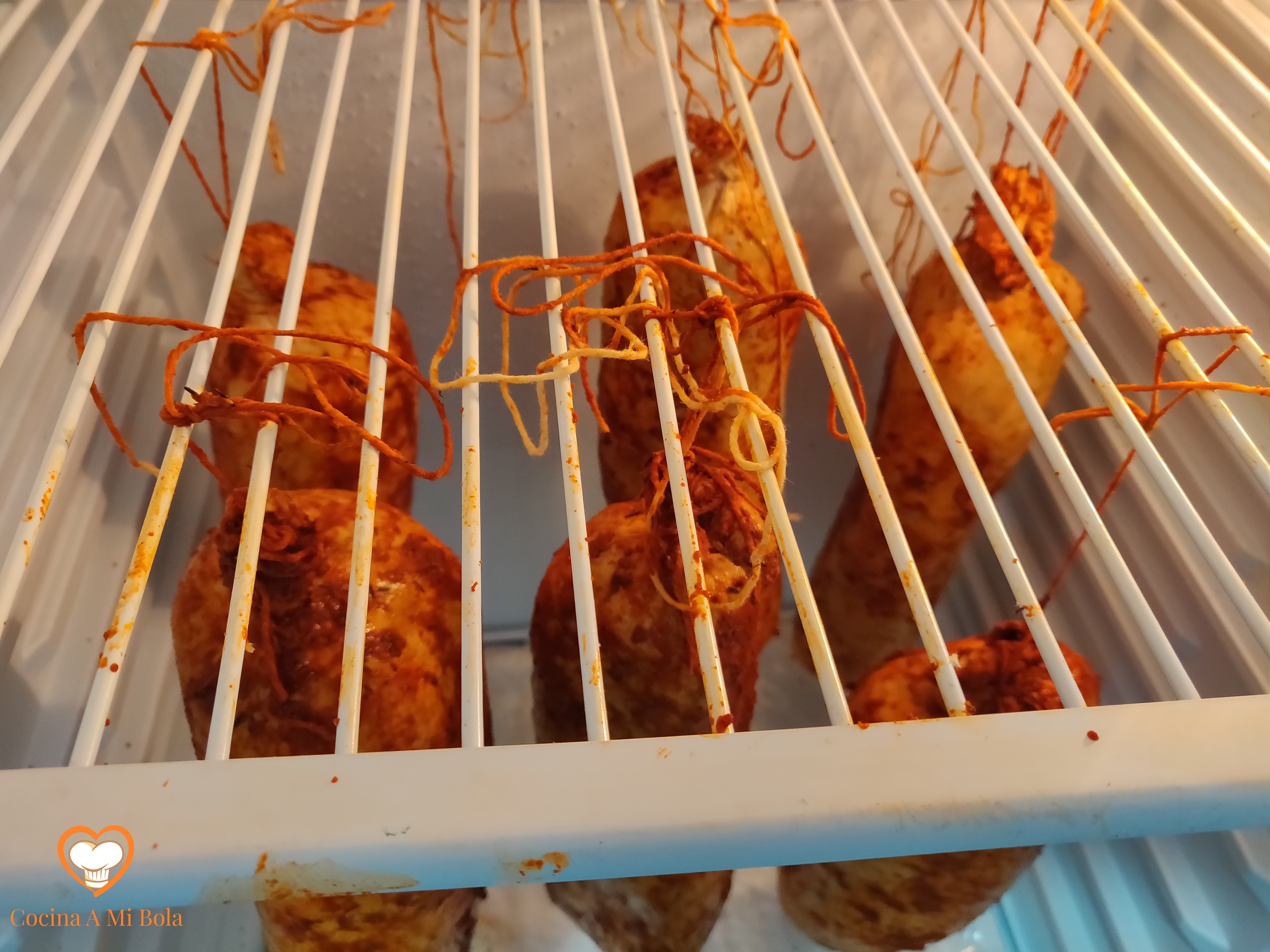 UNDÉCIMO.- Ya tenemos las piezas embuchadas y sin aire, pero fruto de ello pudiera ser que haya surgido una nueva holgura entre el nudo y la carne. Si es así, haz nuevos nudos más ceñidos y a continuación, ata sobre ellos un trozo de cordel doble que nos servirá para colgarlo luego en la nevera.
