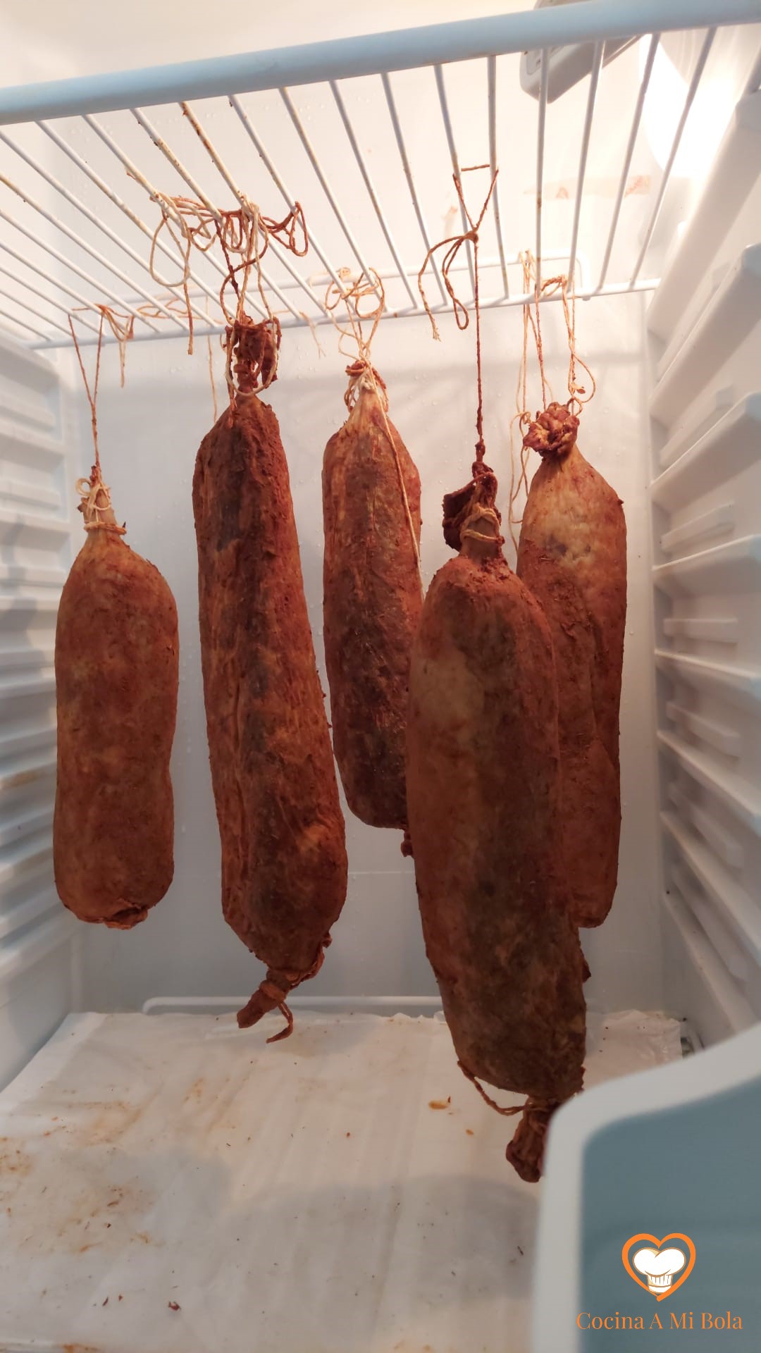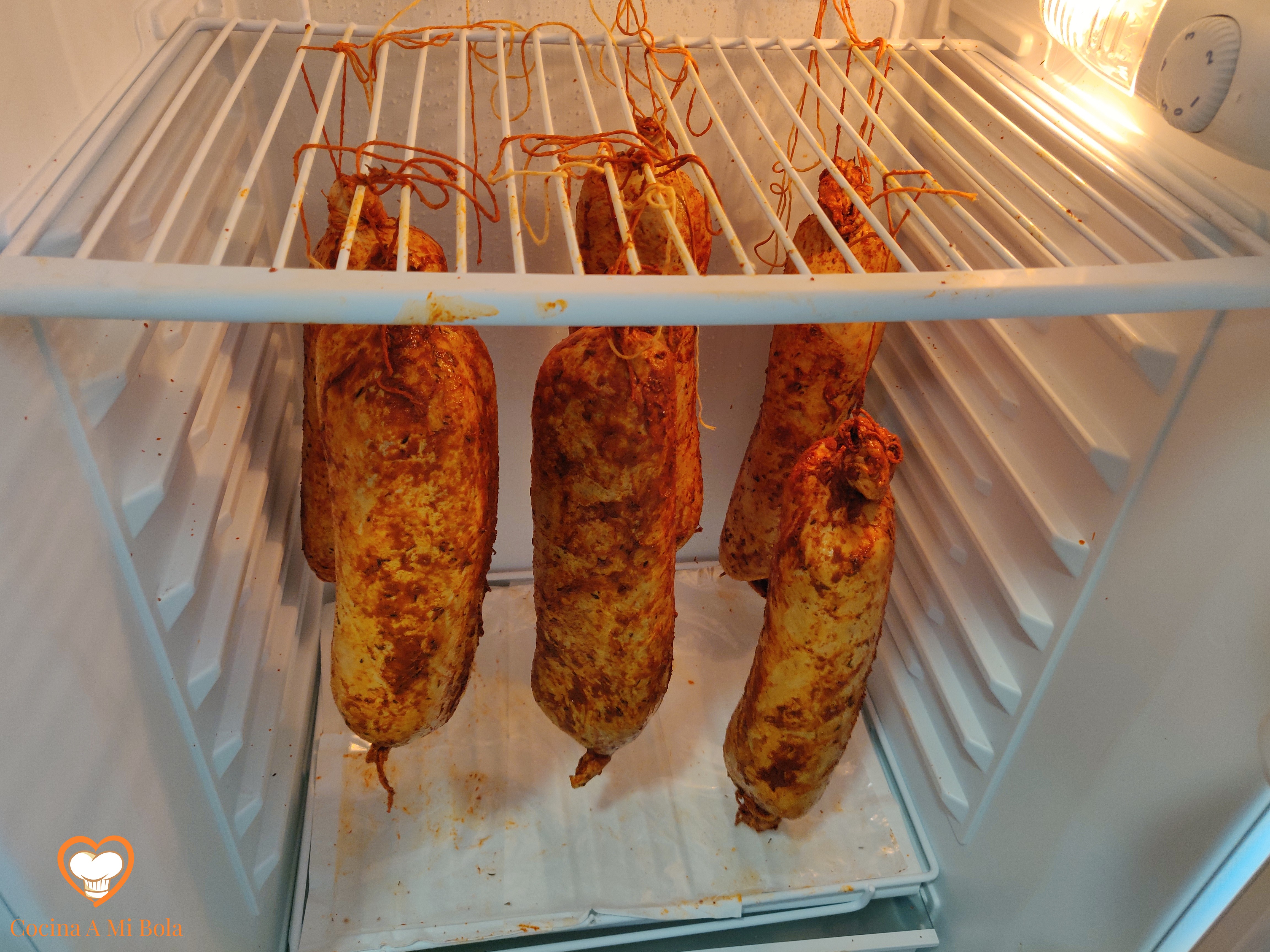 De momento, todos van a la nevera, a unos 5-7ºC colgados con cordel de algodón. Mira la foto, porque no tiene más secreto, excepto el de poner el termostato al 50%, no vaya a ser que se nos congelen. Pero ten en cuenta que el proceso de curación y secado necesita baja temperatura, oscuridad y ambiente seco. ¿Qué quiere esto decir?. Pues que si andas abriendo la nevera cada día, lo único que estarás haciendo en meter humedad dentro. ¿Has visto la escarcha que se genera en una nevera si te dejas la puerta abierta cierto tiempo?. No abras la nevera y tendrás en menor índice de humedad posible. Es cierto que el secado requiere de ventilación (seca) y la humedad que los lomos van a expulsar, debería salir de algún modo. Bueno, pues desde mi punto de vista, la humedad que desprendan un par de lomos o tres, o cinco o seis… retenida y dispersa en una nevera (pero ya fuera de la carne), no afectará tanto al secado de éstos como si estás abriendo la puerta con frecuencia. Te costará, pero una vez colgados los lomos en la nevera, no la abras hasta pasados 7 días como mínimo. Y tras ello, hazlo sólo una vez cada semana. Huélelos y verás que se están curando bien.