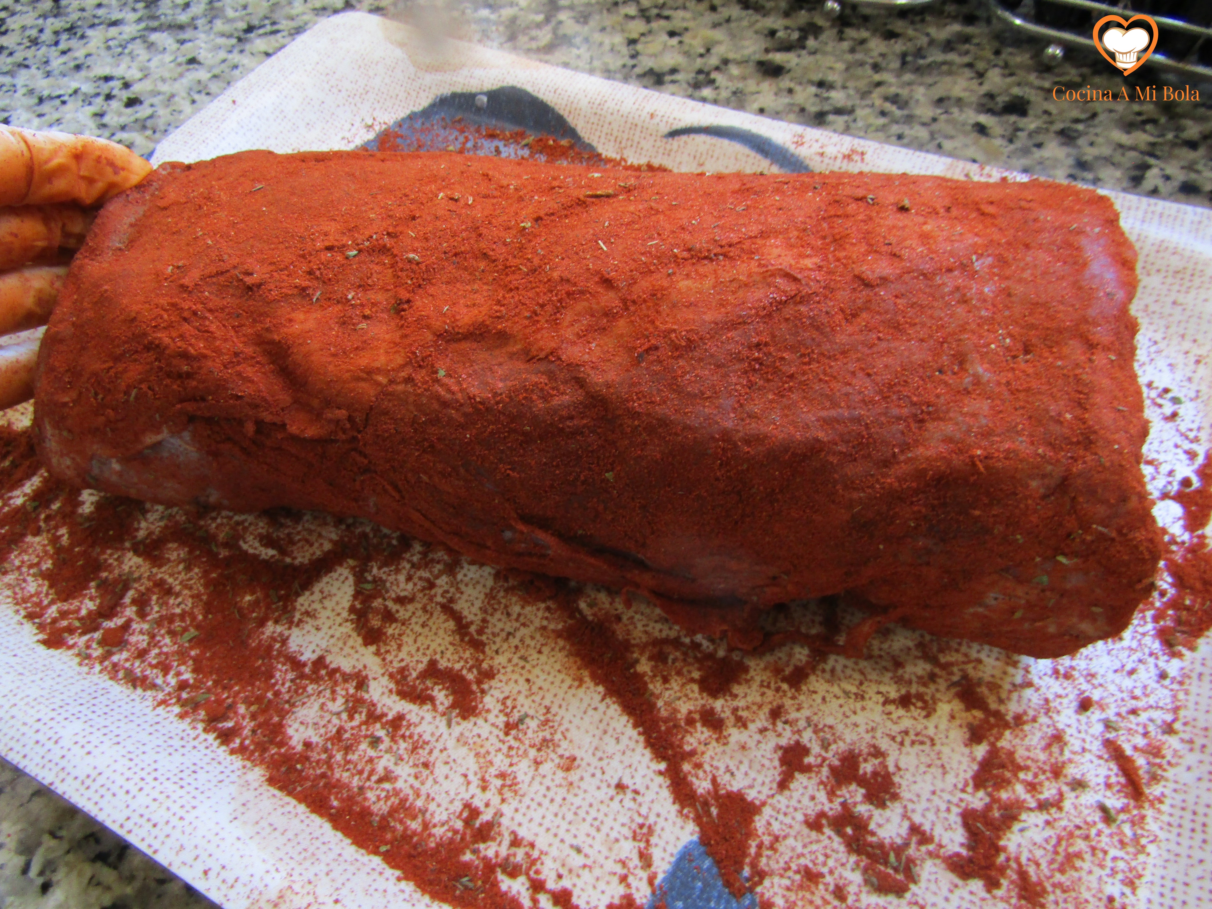 TERCERO.- Haz una mezcla de especias en un bol a base de pimentón dulce, ajo molido, tomillo y romero (si no pusiste en la sal). Pero a diferencia del lomo embuchado, no le vamos a poner aceite ni agua, con lo que trabajaremos en seco embadurnando la carne con esta mezcla por todas partes.