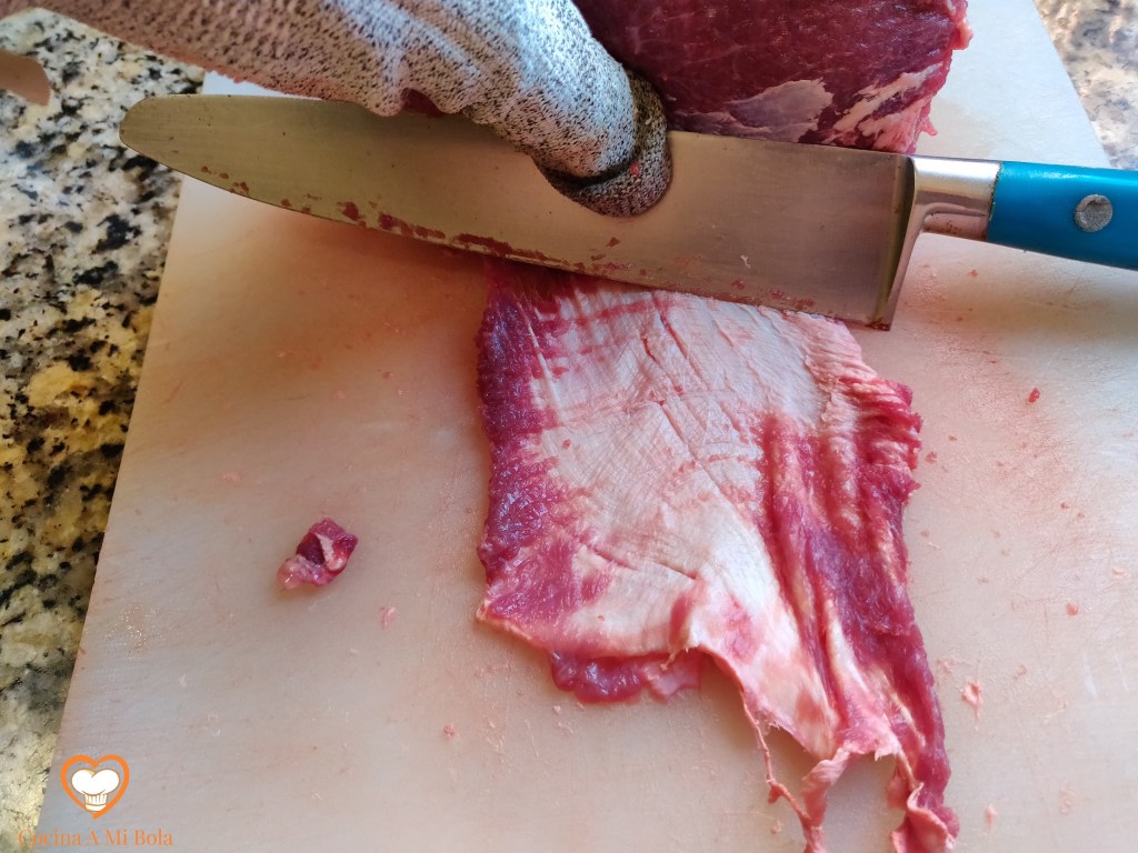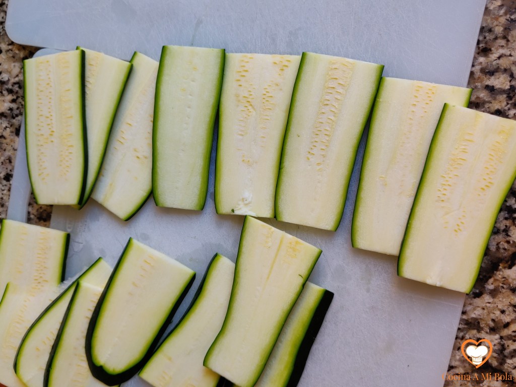 PRIMERO.- Lava bien los calabacines, corta los dos extremos para que queden dos mitades lo más iguales posible y haz lonchas de cada una de ellas de algo menos de un centímetro de grosor, es decir, de unos 7,5 milímetros. Y ahora procura agruparlas por parejas de tamaño similar.