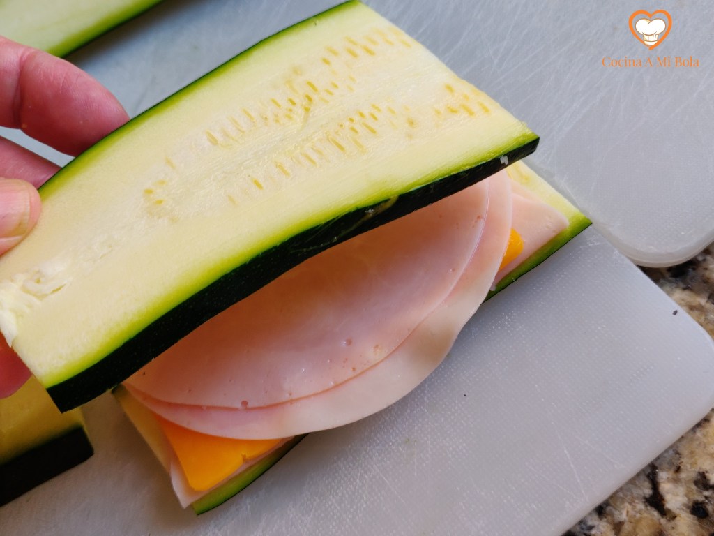 SEGUNDO.- Toma la primera pareja y rellénala con una loncha de jamón de pavo previamente cortada a su tamaño. Pon tantas capas como dé de sí la loncha. Luego coloca encima un trozo de loncha de queso Cheddar cortado a su tamaño y encima del queso, otra loncha de jamón de pavo en tantas porciones como salgan de cortarla al tamaño del calabacín. A continuación, pon la otra loncha de calabacín tapando el relleno y creando un sándwich de jamón y queso que tiene lonchas de calabacín en vez de pan. Presiona ligeramente y reserva mientras haces todos los demás.