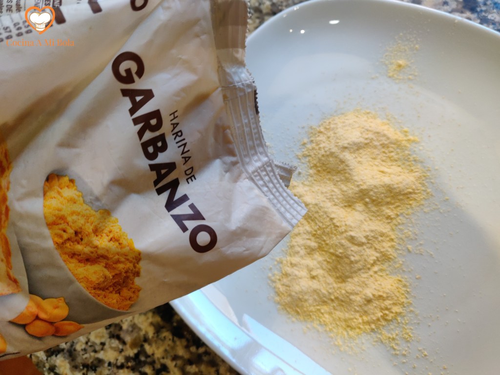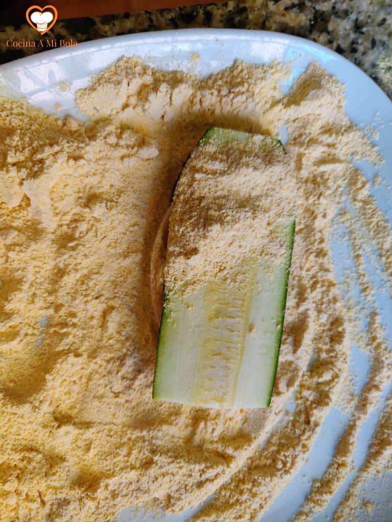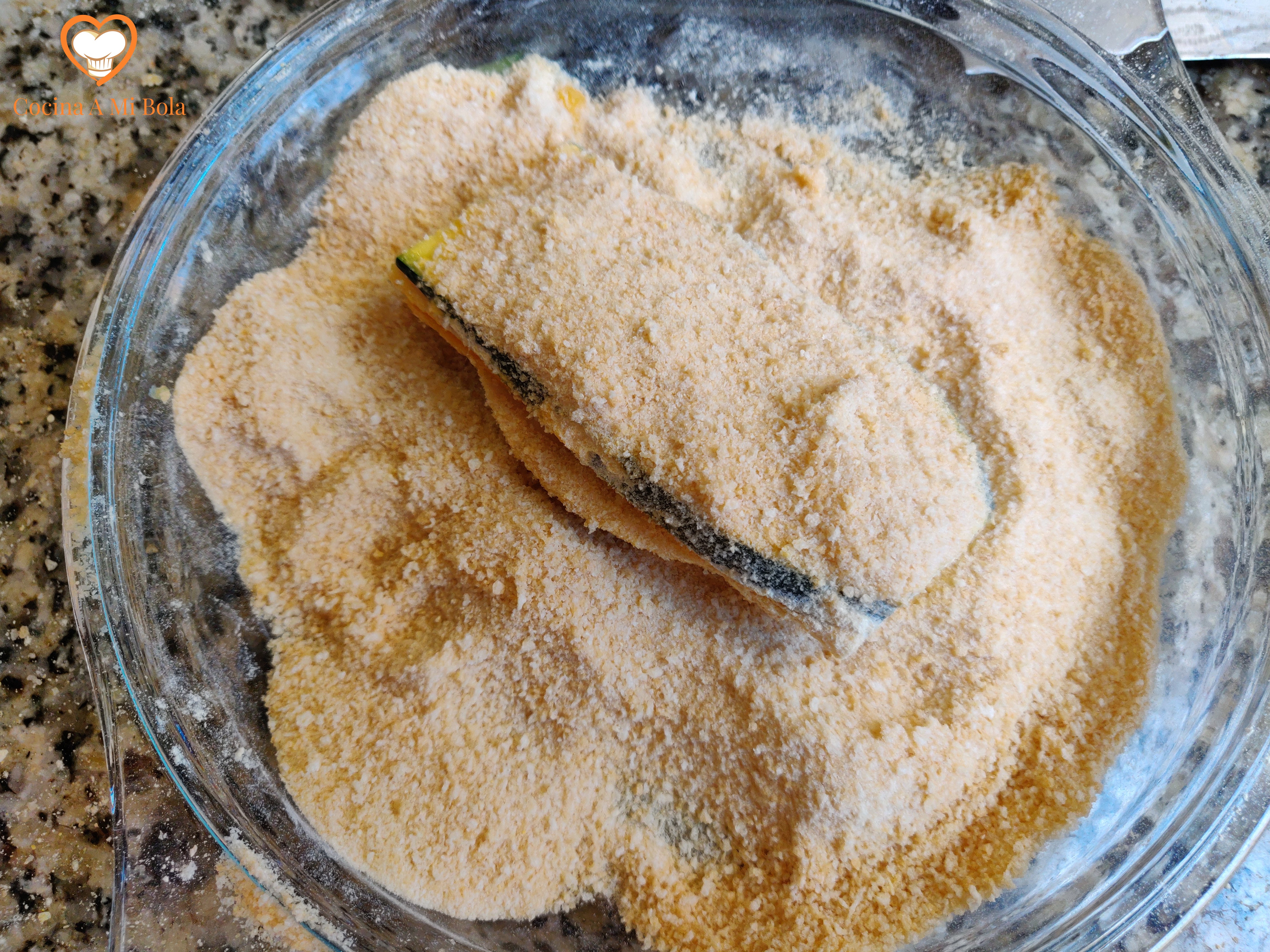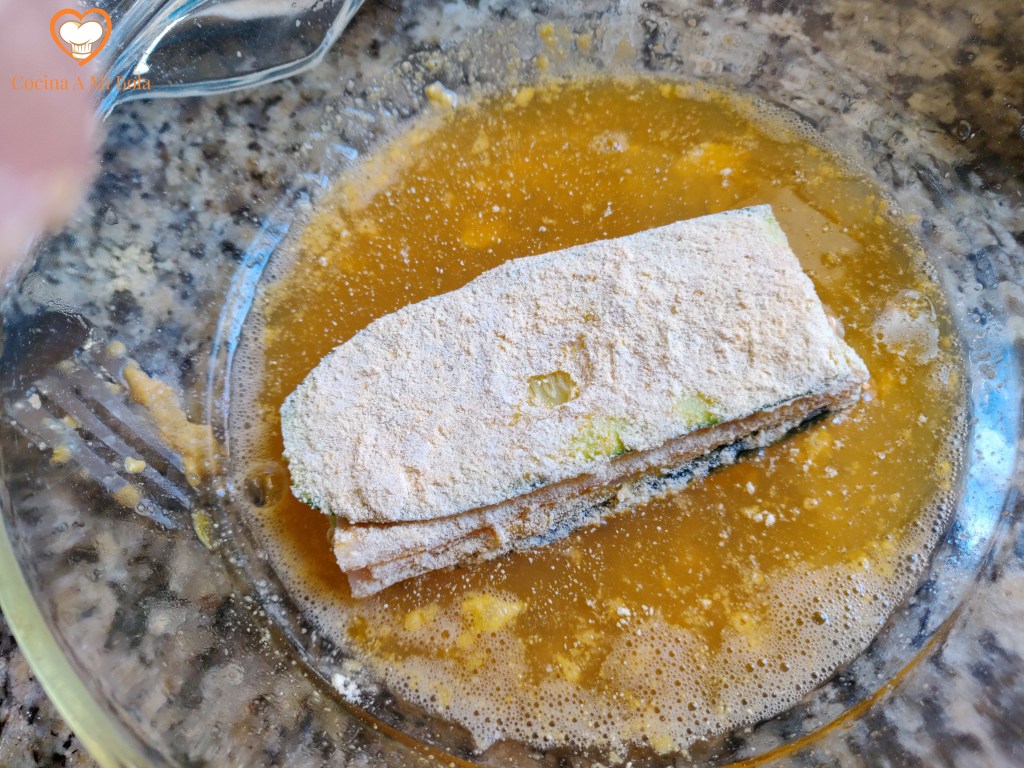 TERCERO.- Como en todo proceso de empanado, pon en serie un plato con harina (de garbanzo), otro con dos huevos bien batidos y un tercero con pan rallado (sin gluten). Comienza tomando un sándwich y rebózalo en la harina procurando que también le llegue a los cantos, es decir, a la parte de relleno que asoma entre loncha y loncha de calabacín. Sacúdelo porque queremos que esté perfectamente enharinado, pero con la menor cantidad posible de harina.