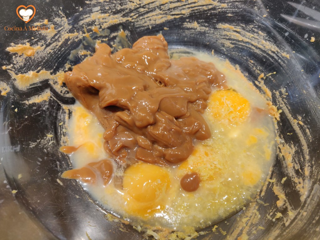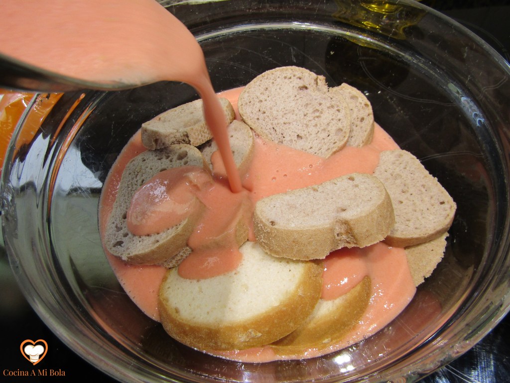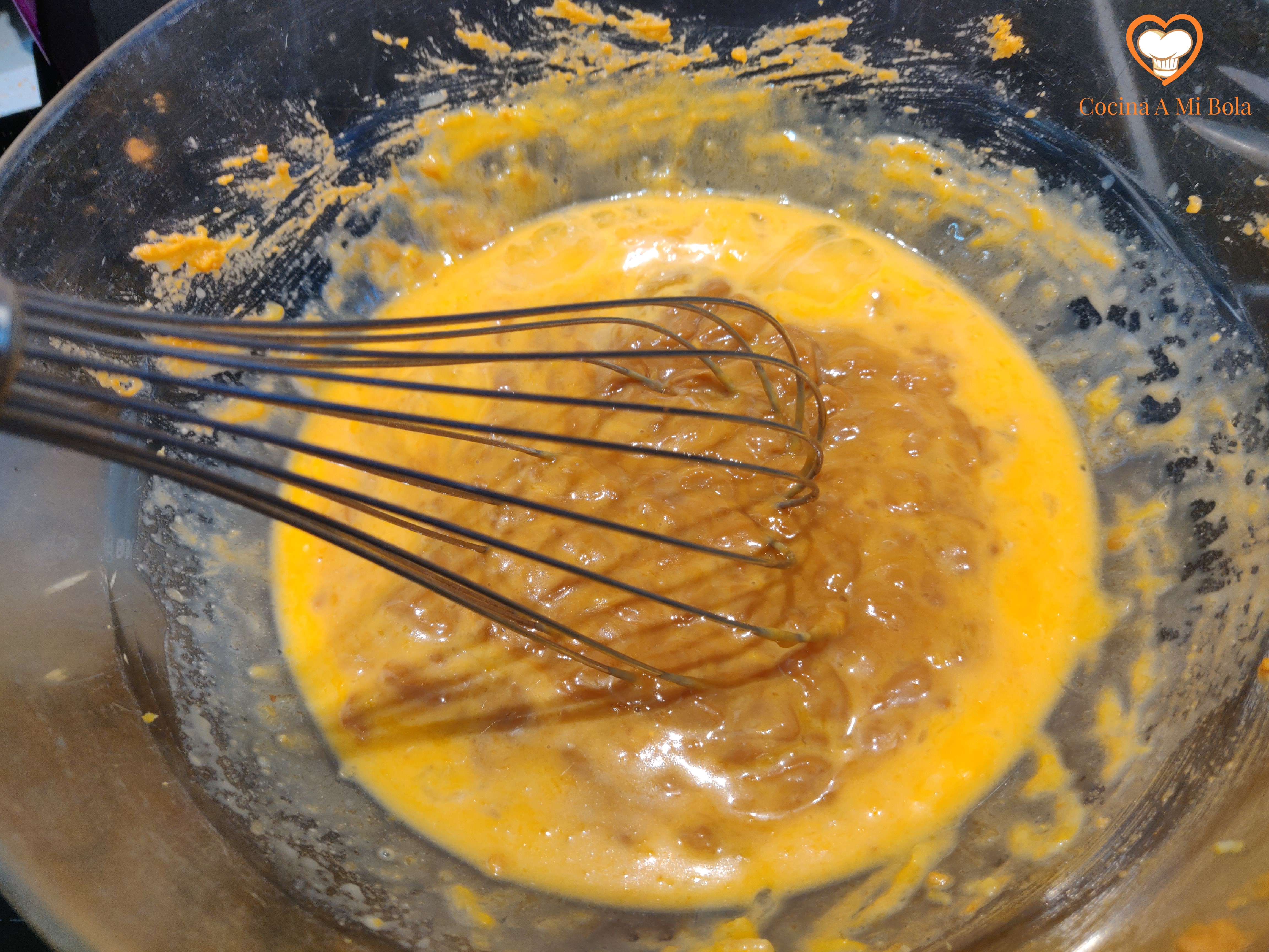 CUARTO.- Bien sacudido, lo pasamos por el huevo. Es importante que el huevo esté bien batido para romper y diluir la clara en la yema. De este modo evitaremos que al meter el sándwich se adhiera a él cantidades enteras de clara. Ni es bueno el exceso de huevo en el sándwich, ni nos dará para todos ellos.