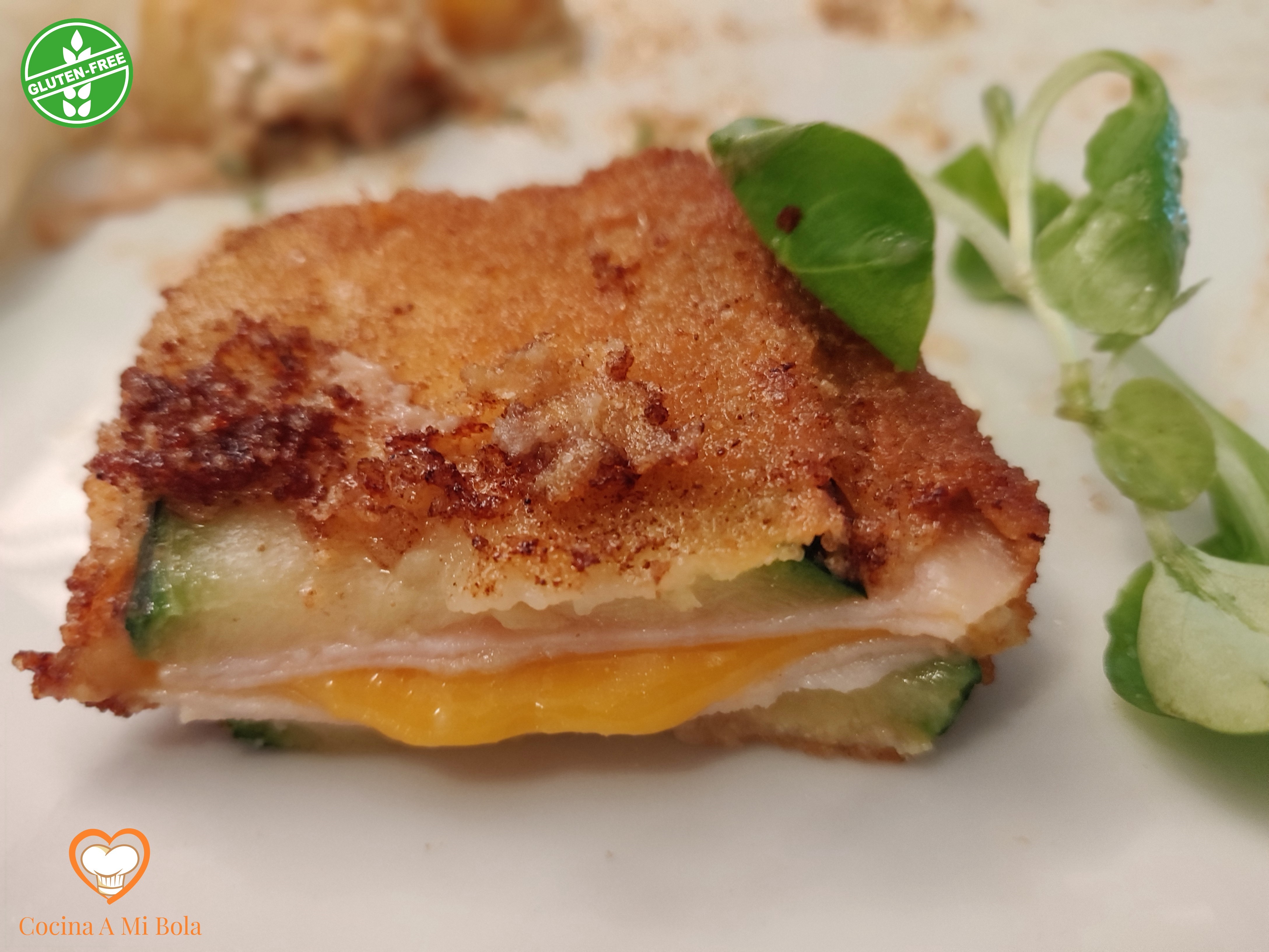 INGREDIENTES: Para 4 personas: 2 calabacines, 200 gr jamón de pavo en lonchas, 150 grs queso Cheddar en lonchas, 2 huevos, harina de garbanzo, pan rallado sin gluten y aceite de oliva.