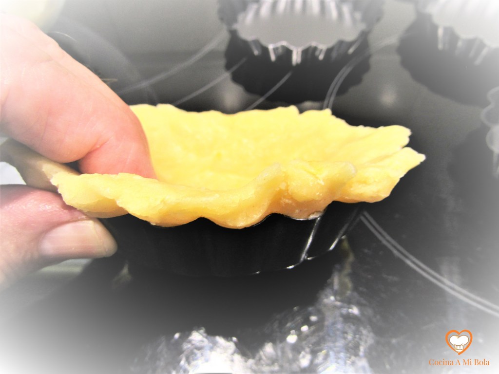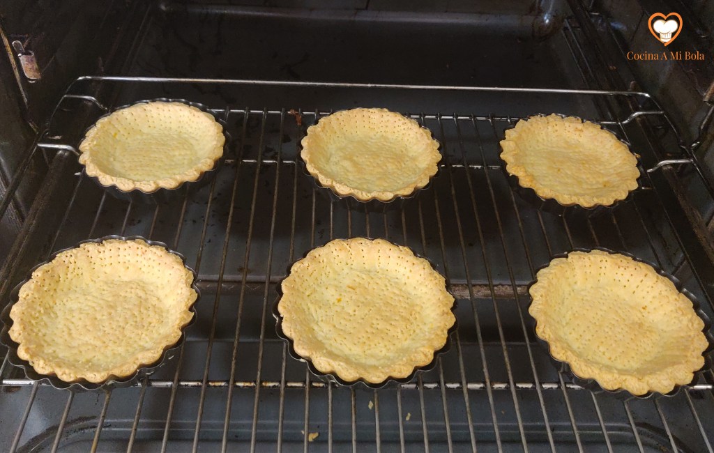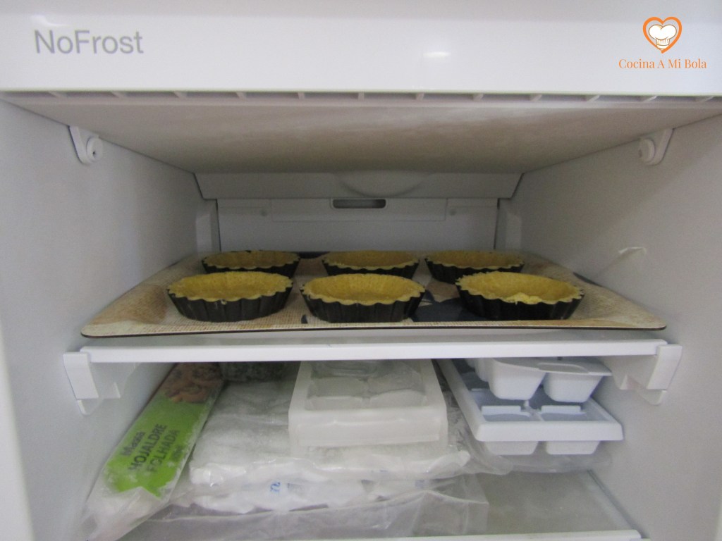 SÉPTIMO.- Pon todas las tartaletas en una bandeja y mételas en el congelador unos 20 minutos para que al hornear, el contraste de temperatura impida que se tuesten demasiado. Y si esto empezara a ocurrir, cúbrelas un rato con papel de aluminio.
