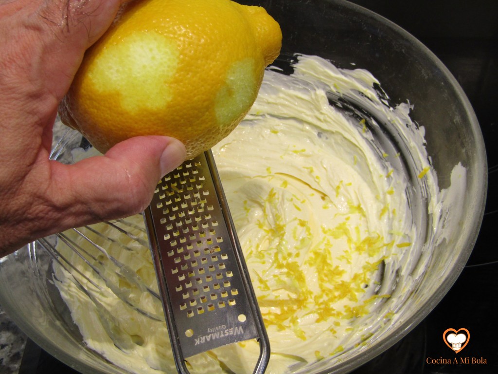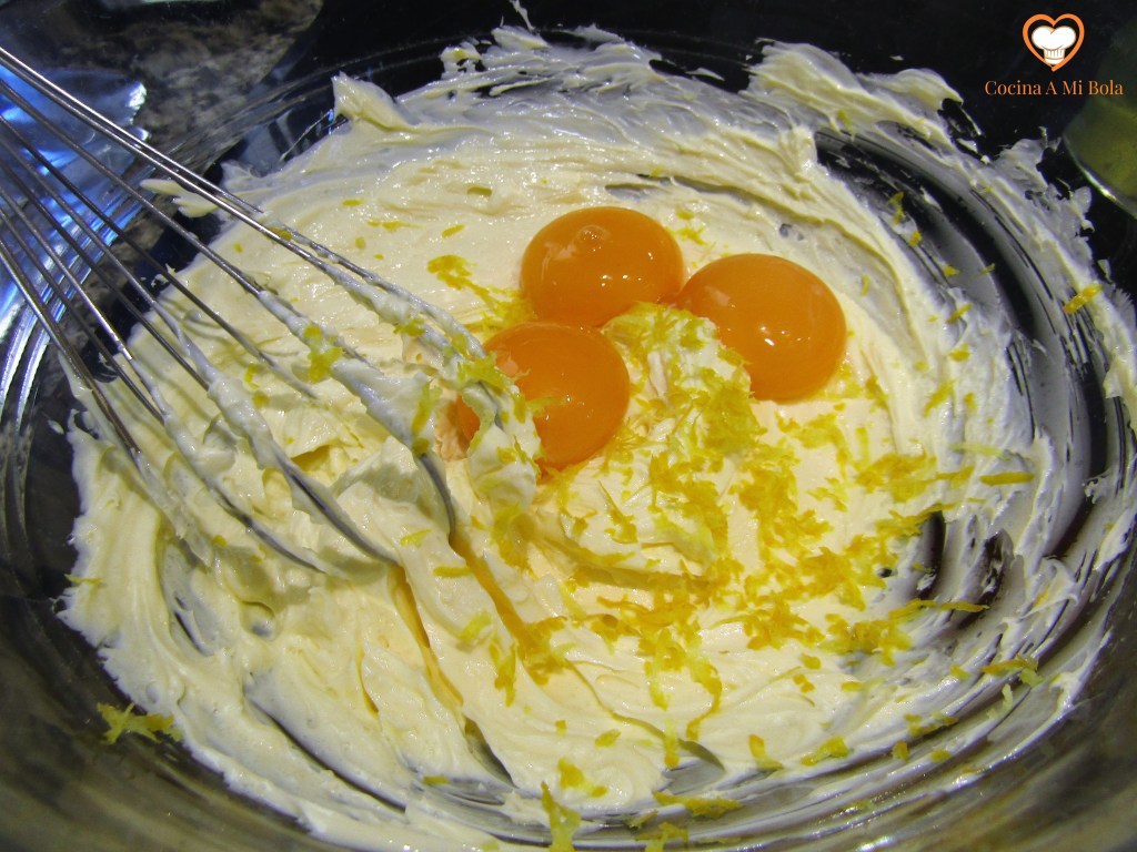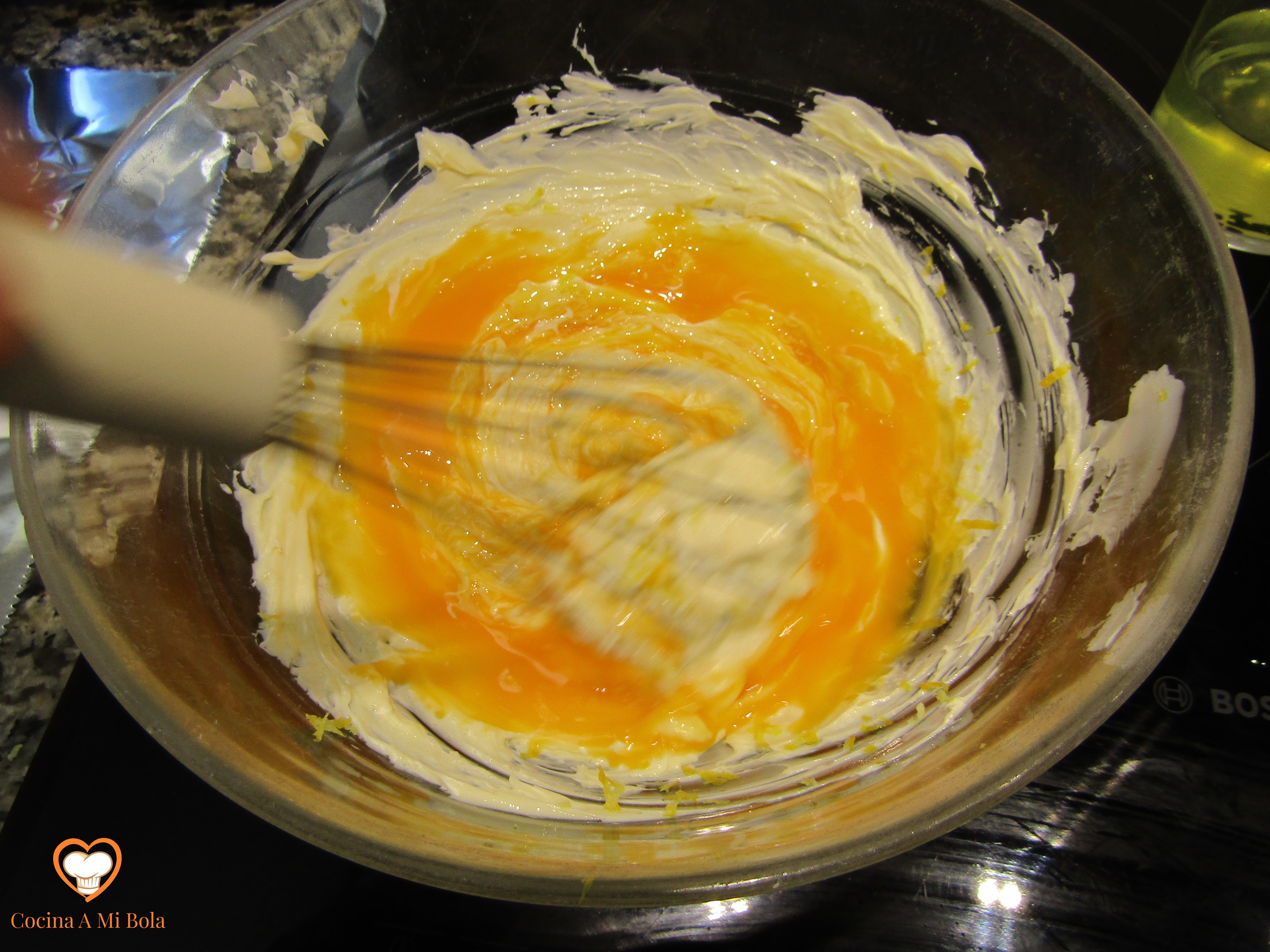 SEGUNDO.- Mientras remueves, agrega poco a poco el azúcar y continúa mezclando bien para que se incorpore. A continuación echa las tres yemas de huevo, la ralladura de medio limón y la sal. Continúa mezclando.